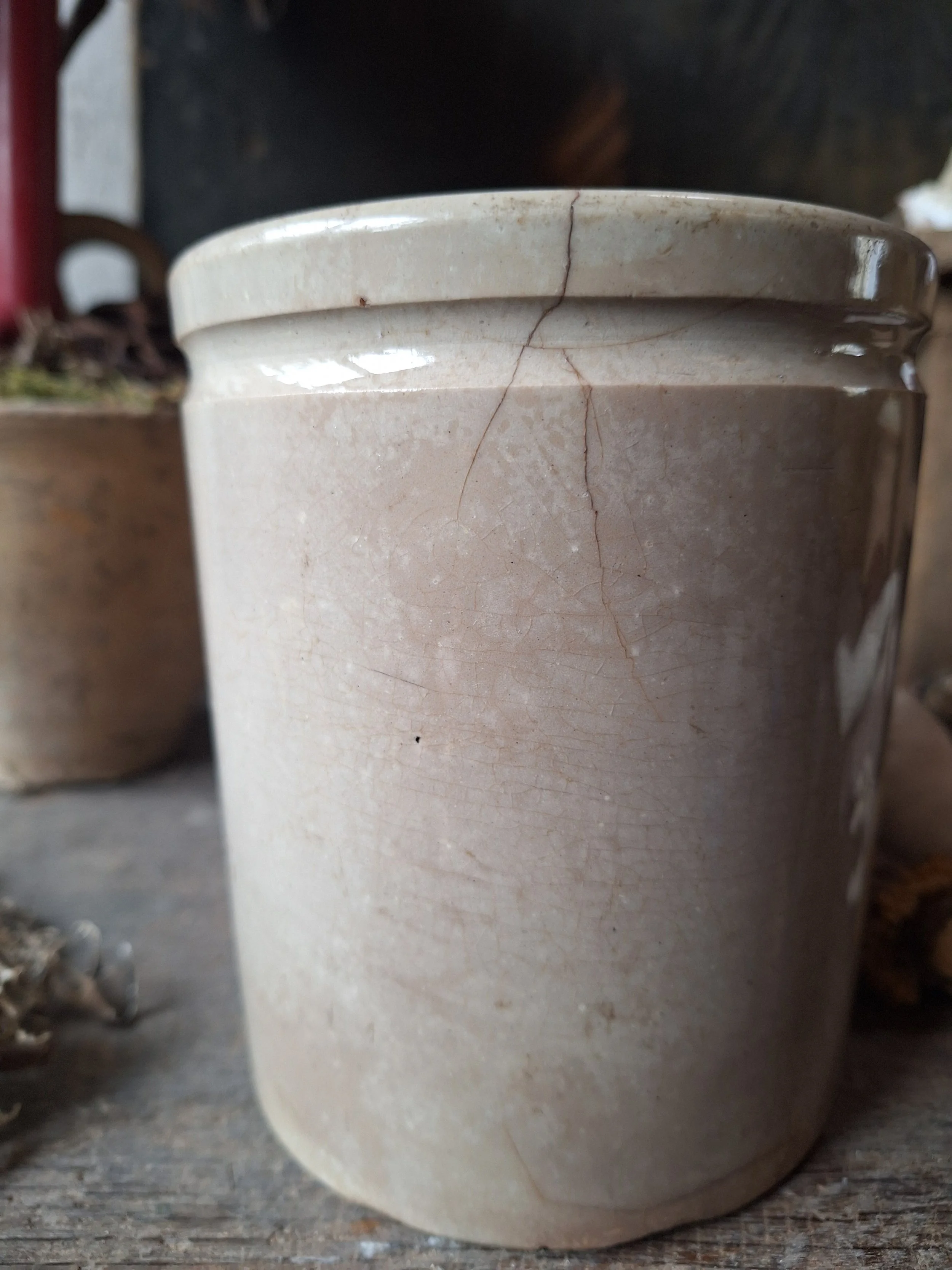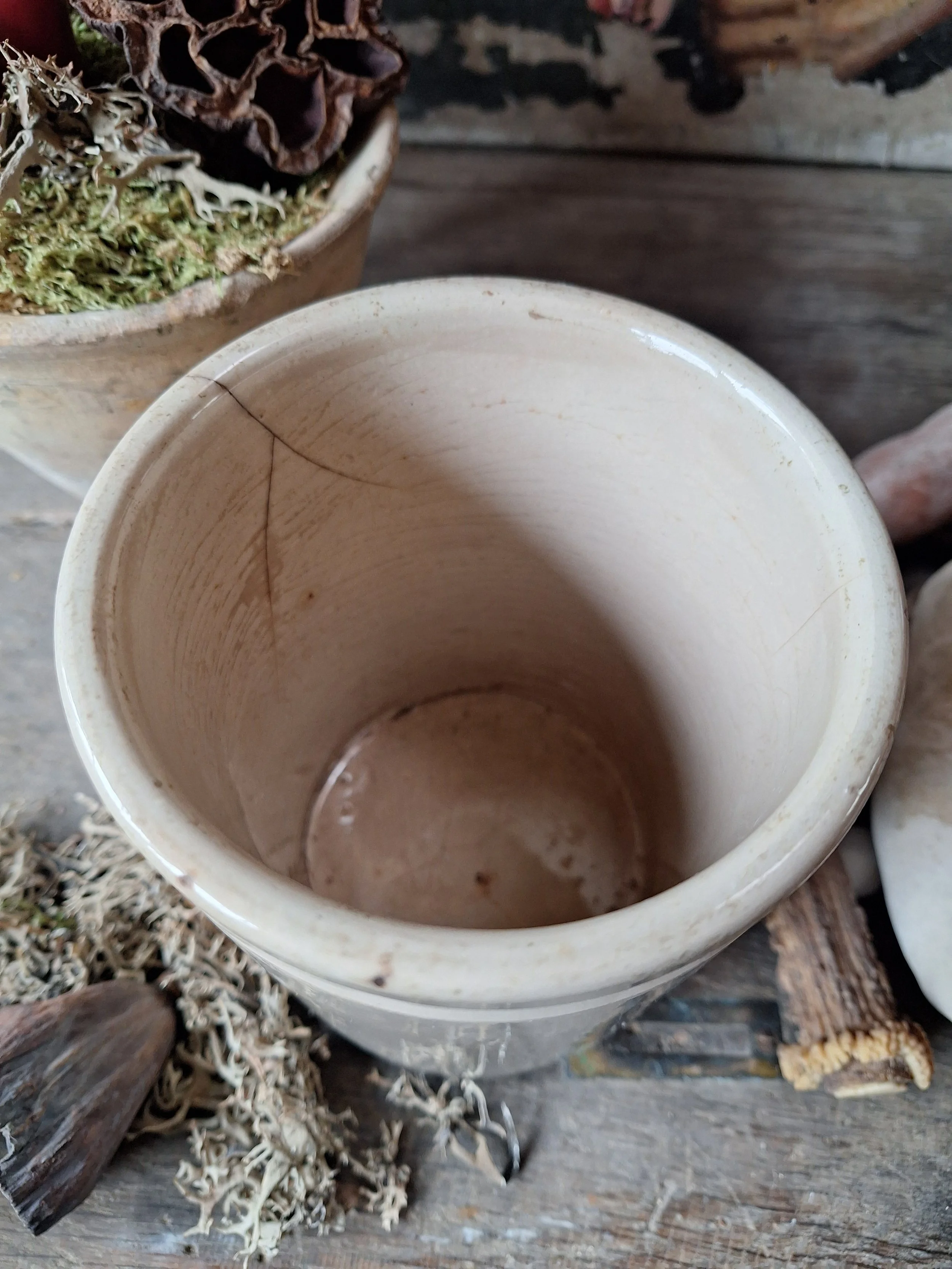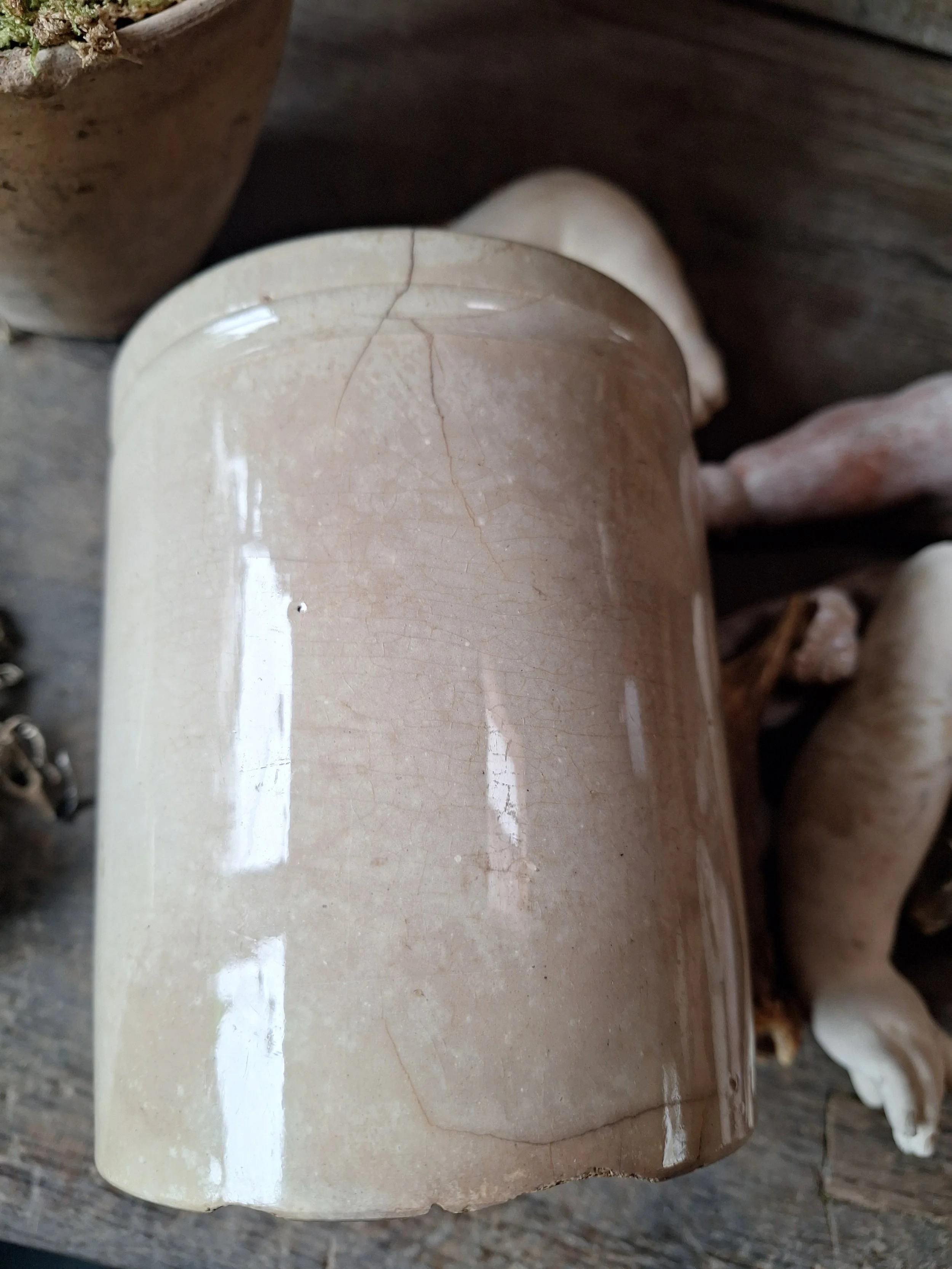 Lovely classic pot with discoloration, some old chips to base and cracks, solid piece. Height 14cm. Diameter 11.5cm.
