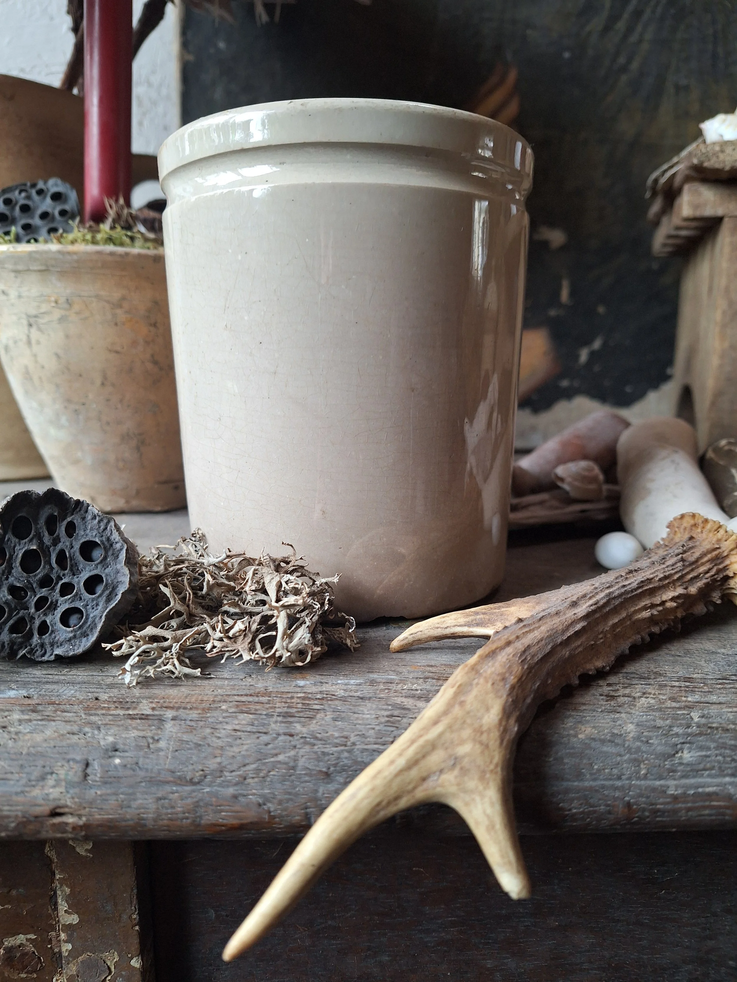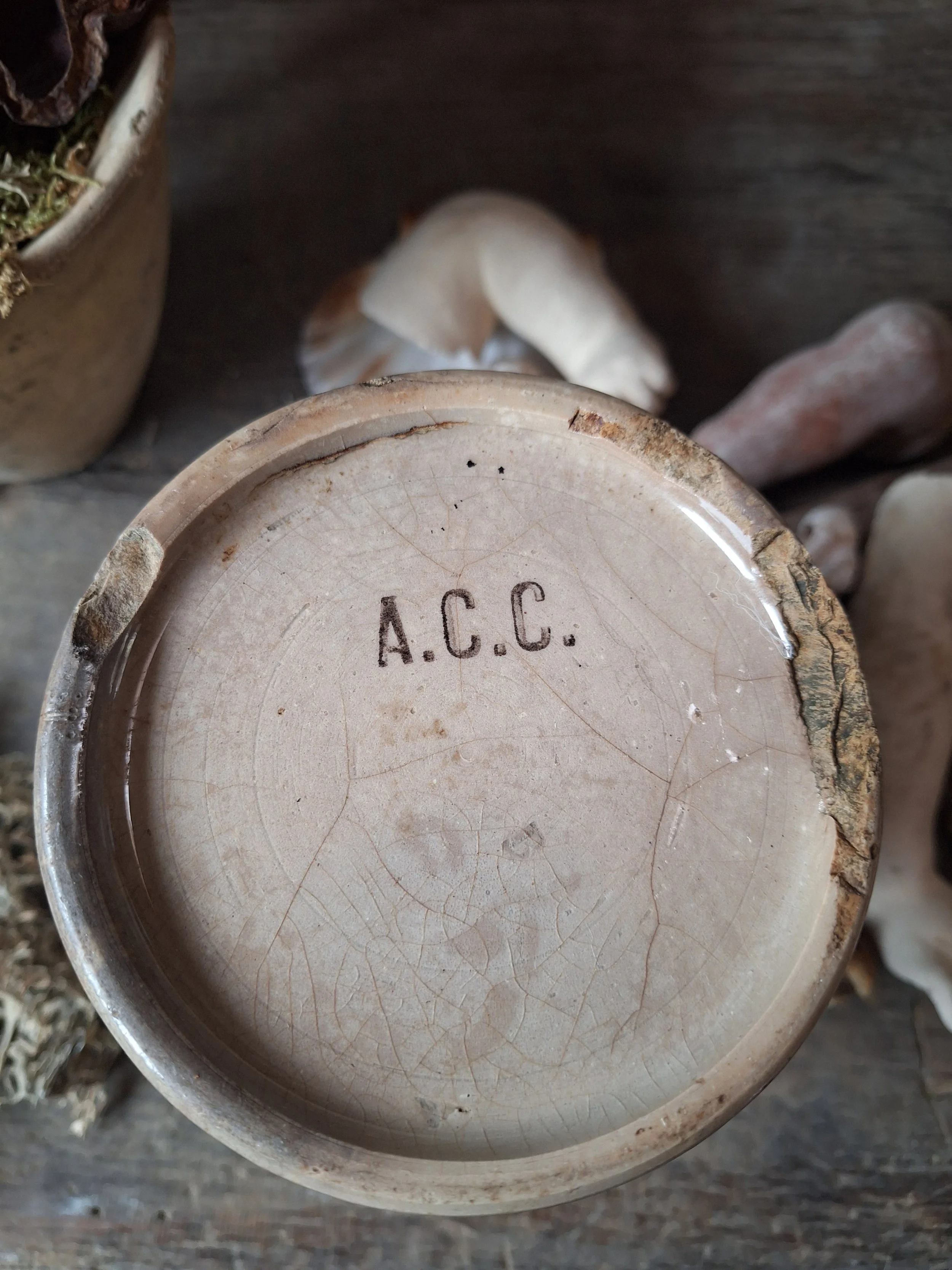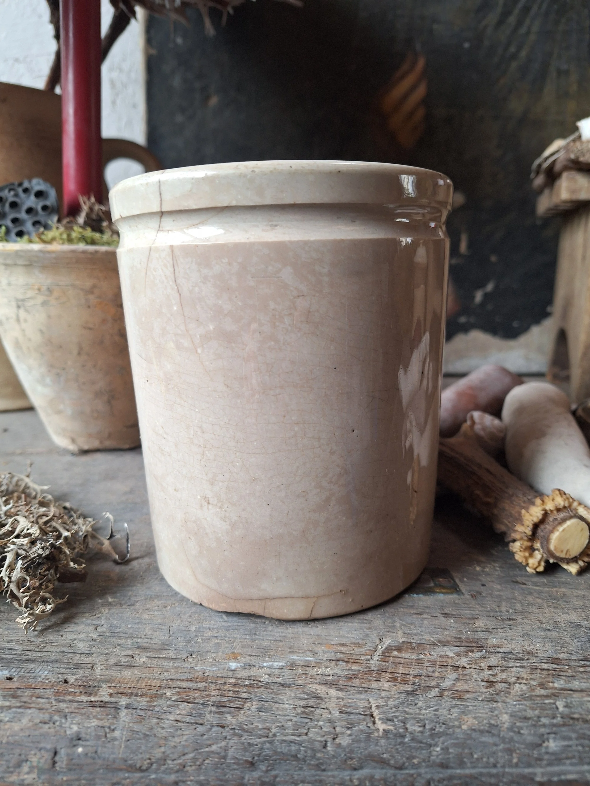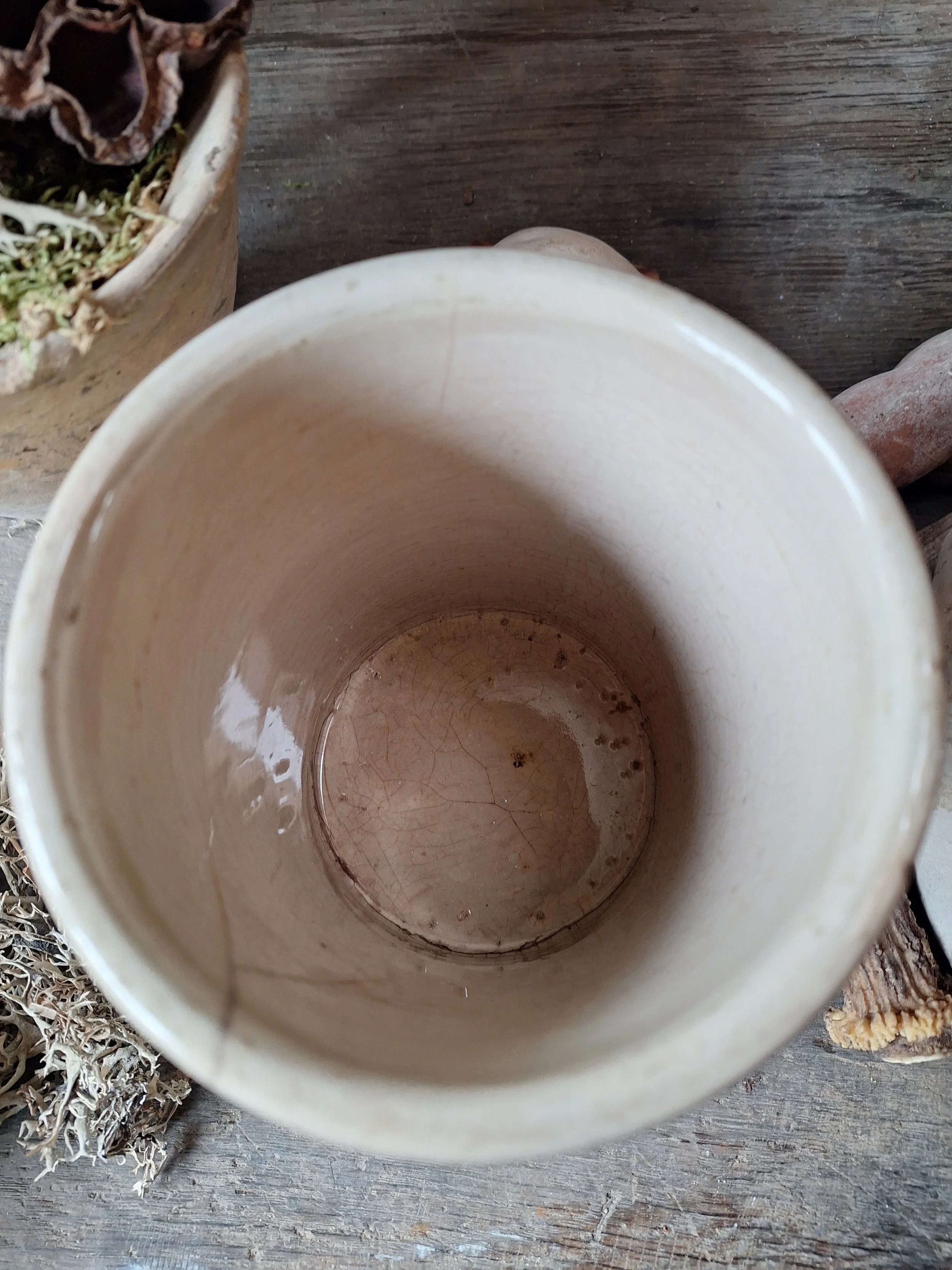 Lovely classic pot with discoloration, some old chips to base and cracks, solid piece. Height 14cm. Diameter 11.5cm.