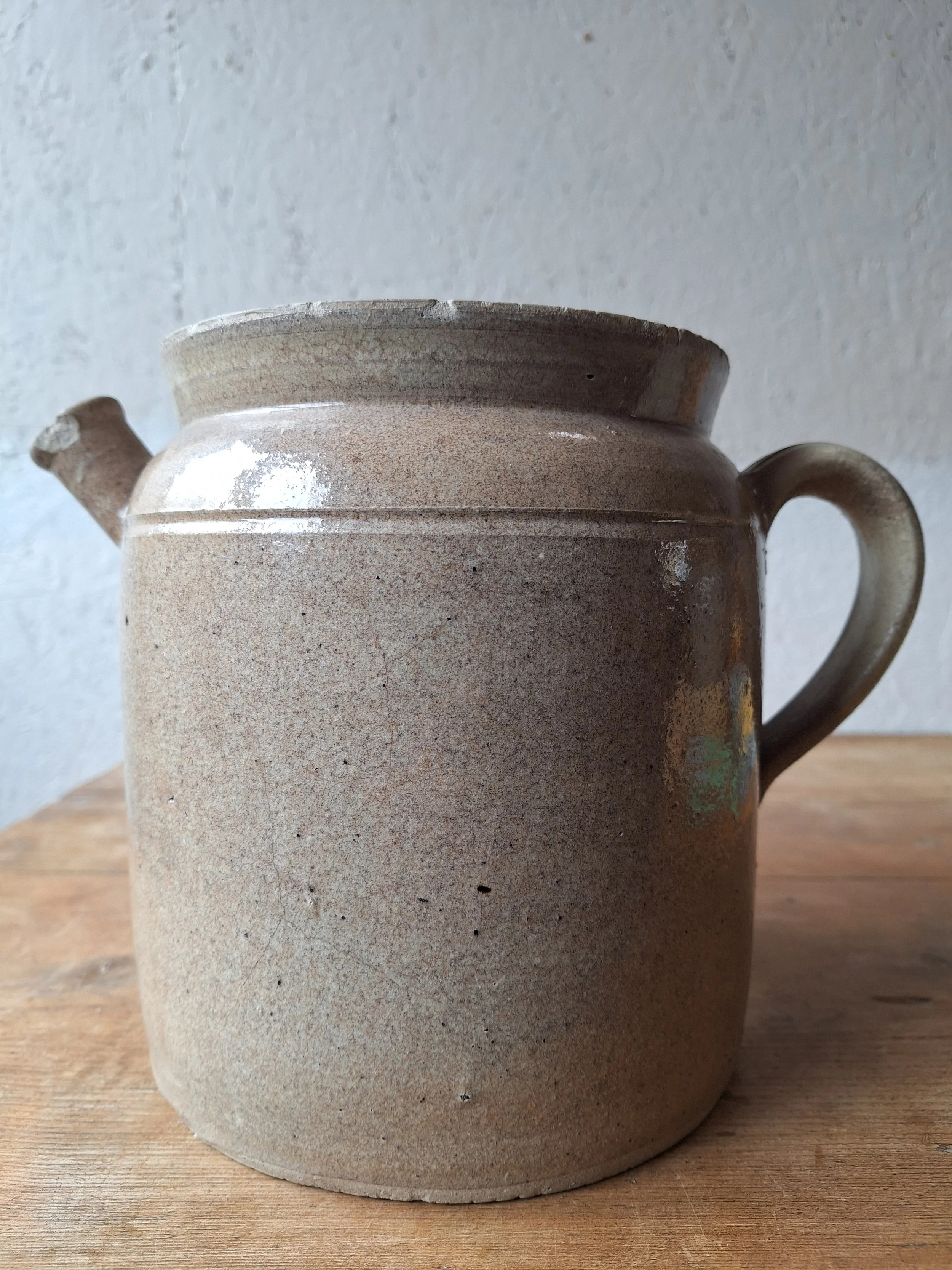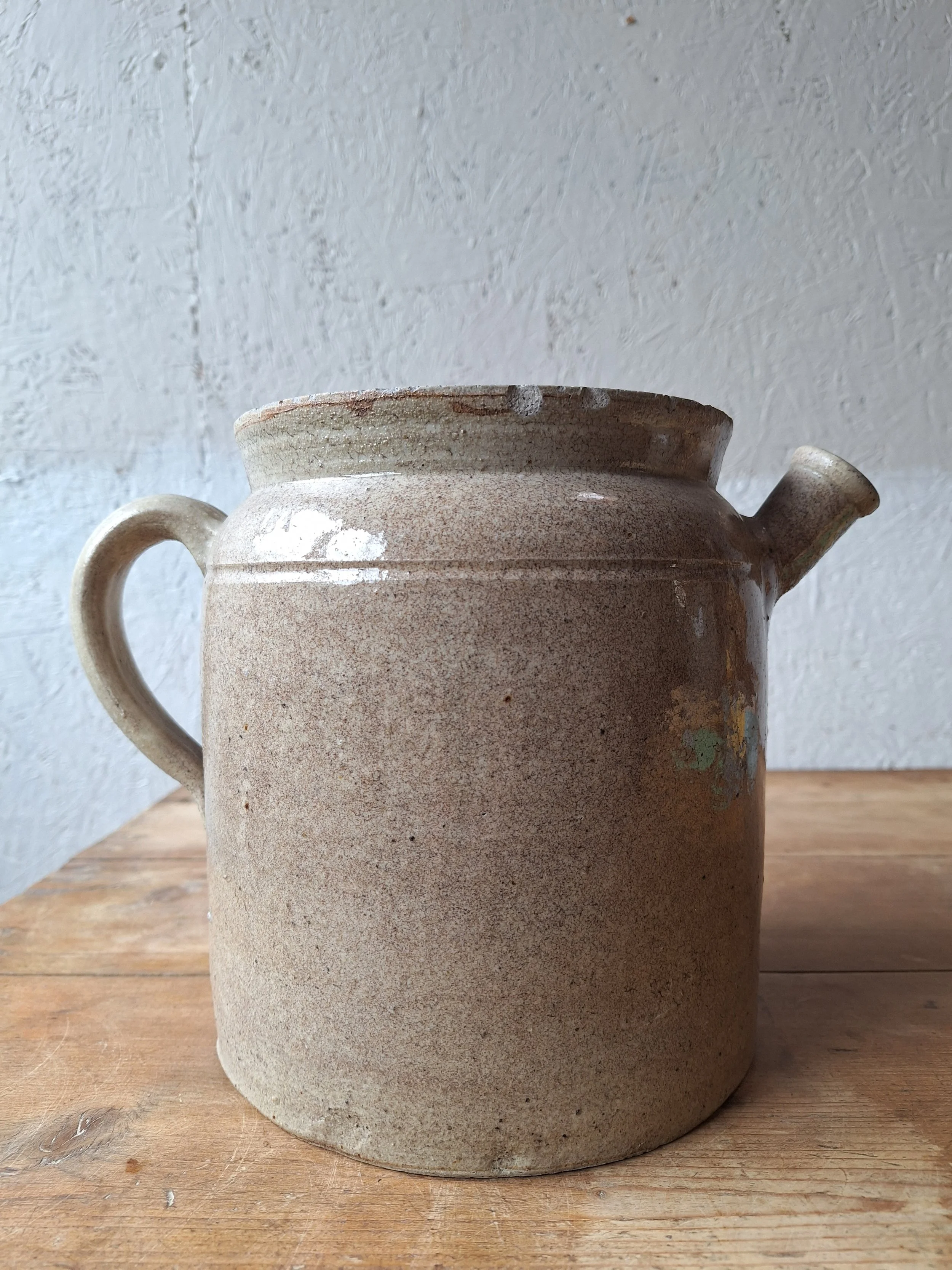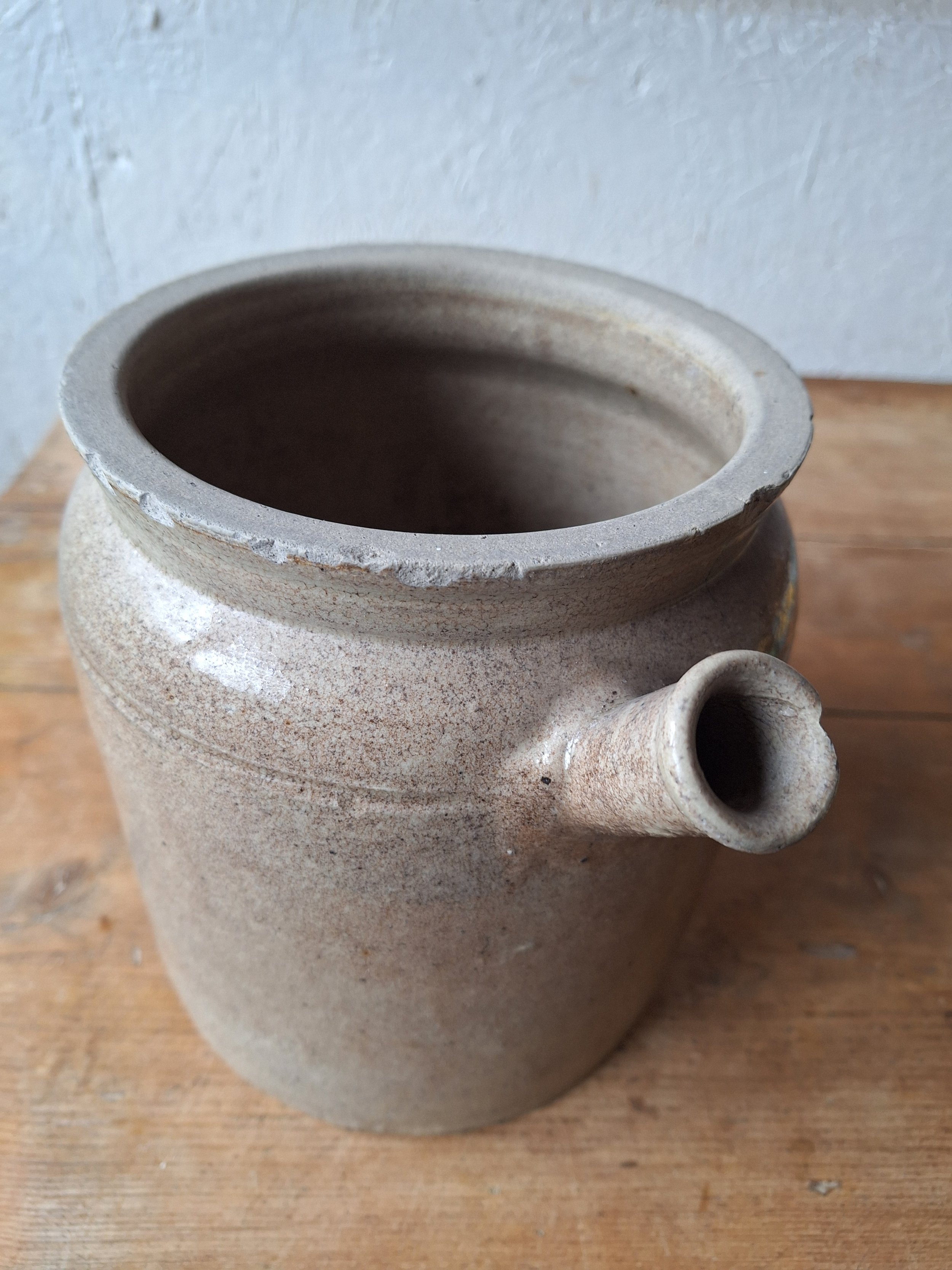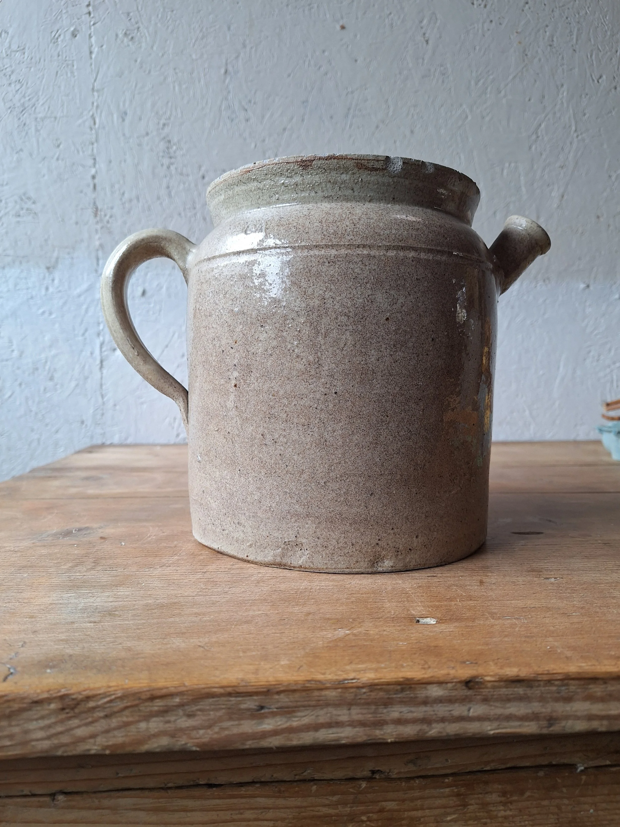 Unusual confit pot with spout. Classic grey colour. This item has chips at the rim and base including the spout. The piece is solid, but I’m afraid there are lots of chips, so please look closely. Height 19.5cm. Total width 25.5cm.