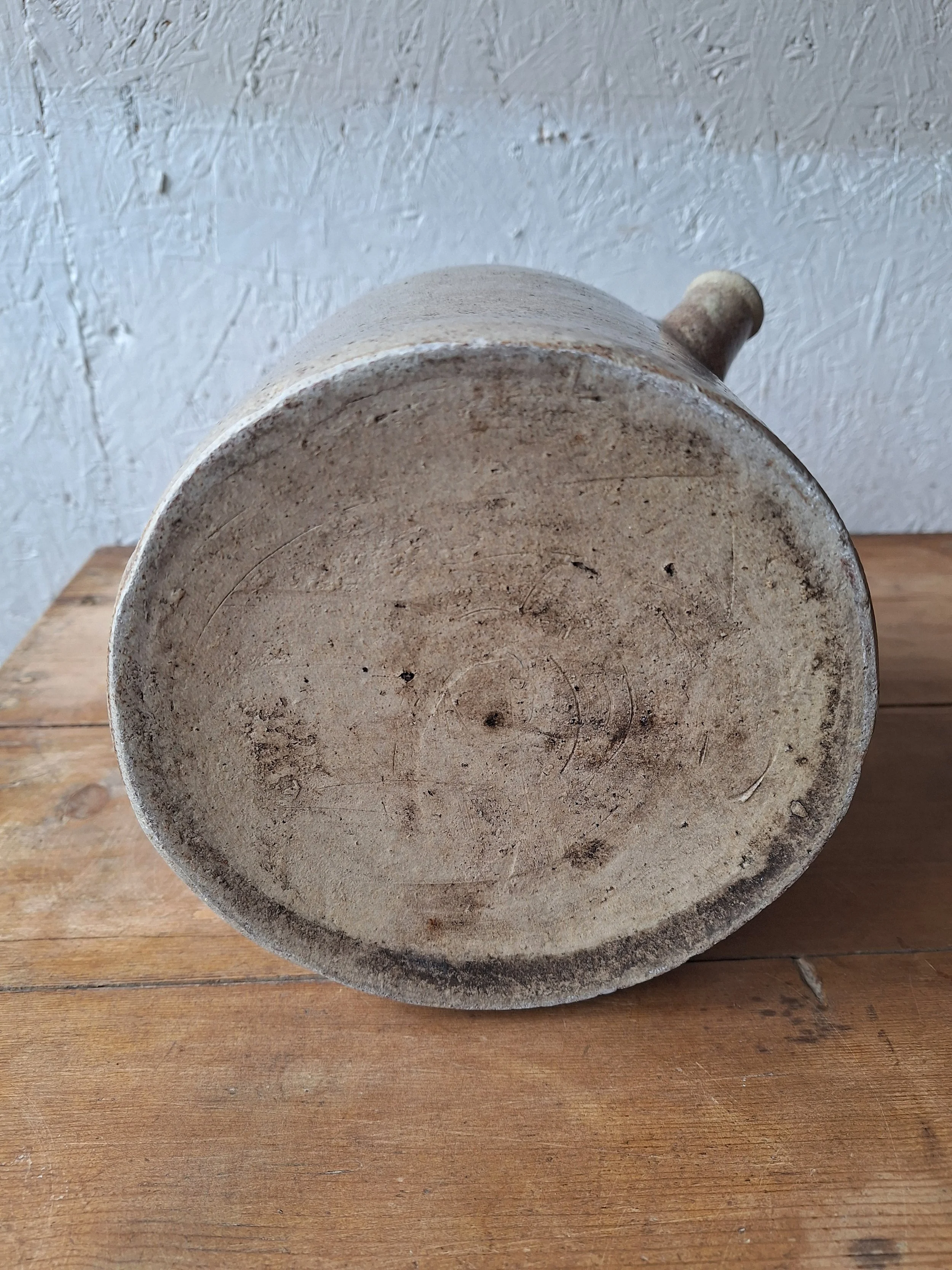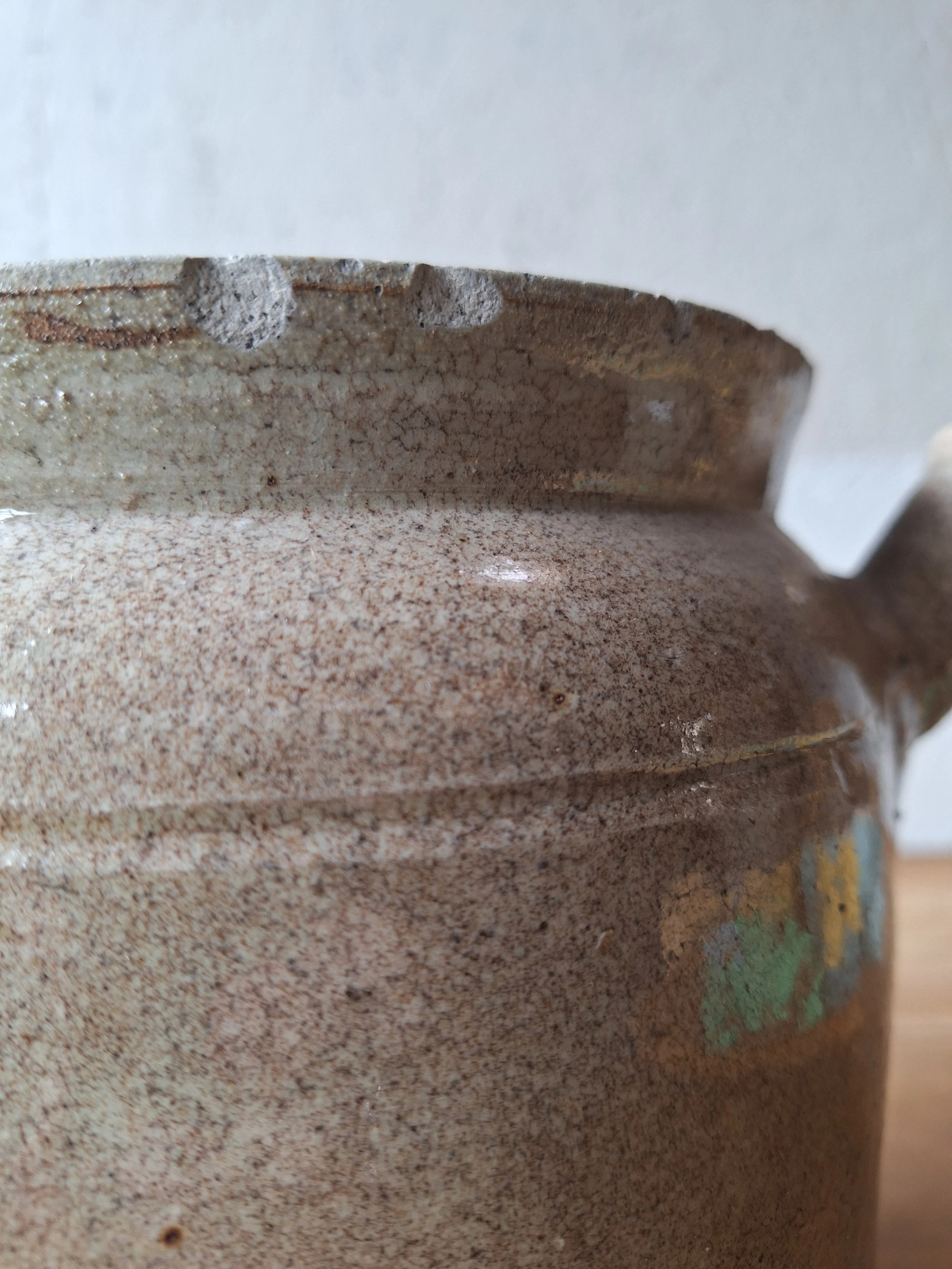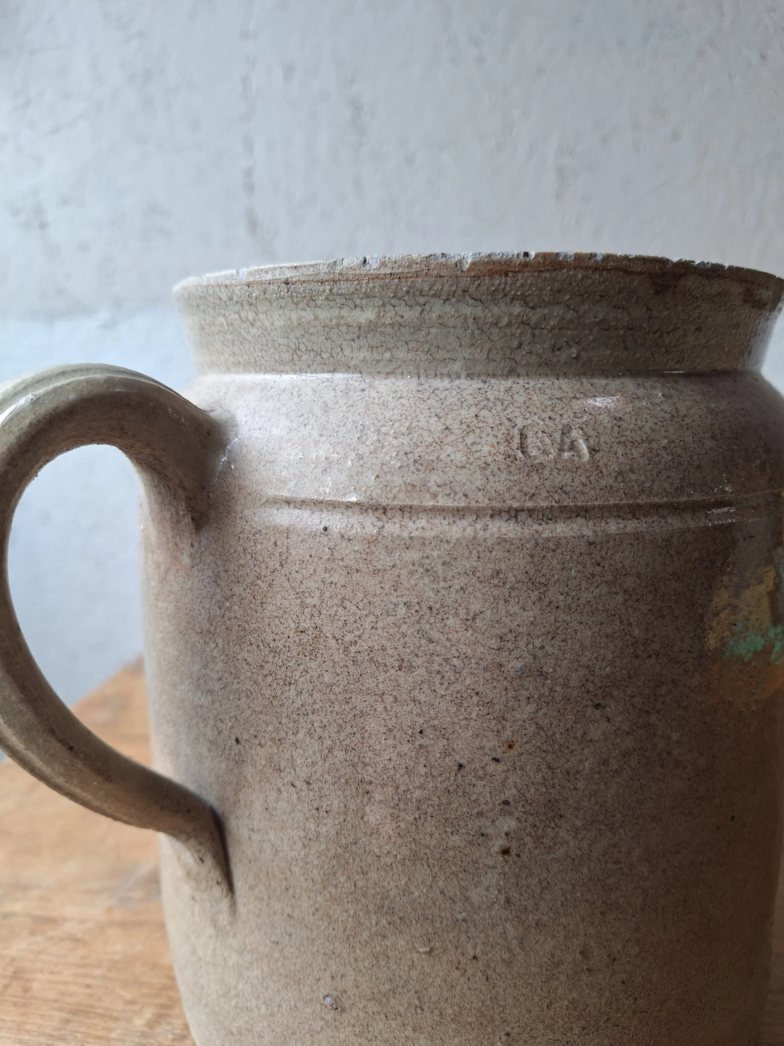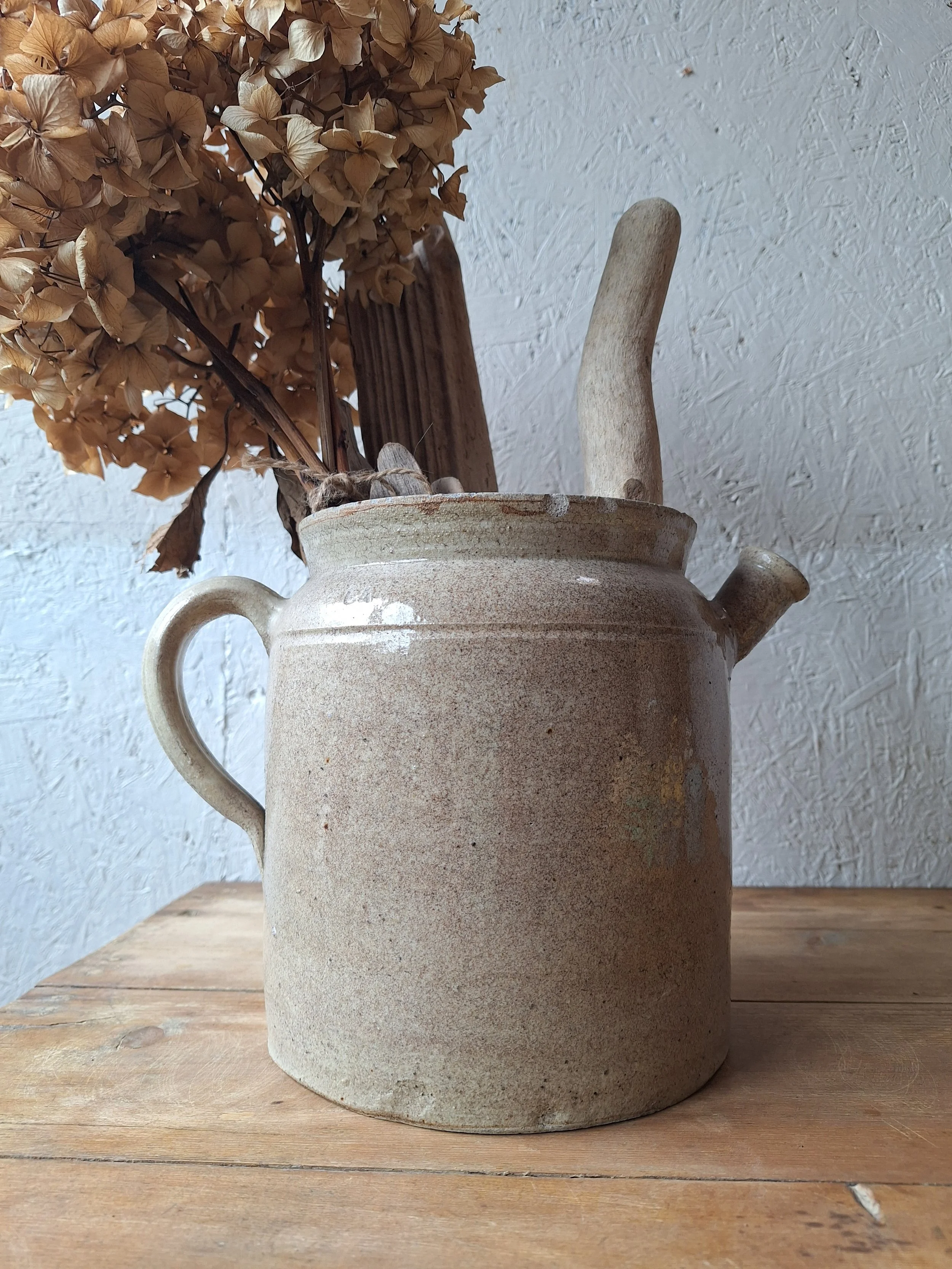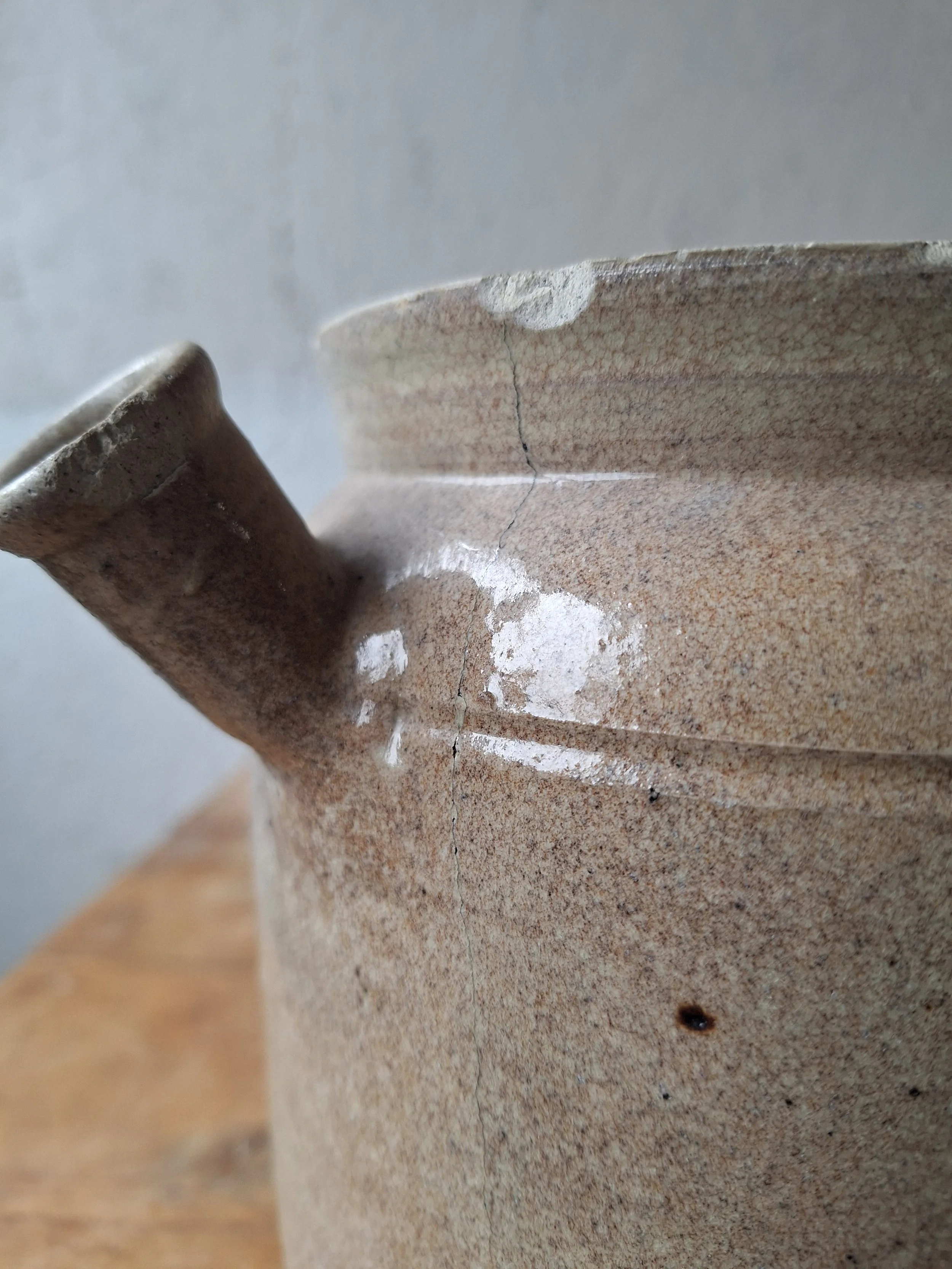 Unusual confit pot with spout. Classic grey colour. This item has chips at the rim and base including the spout. The piece is solid, but I’m afraid there are lots of chips, so please look closely. Height 19.5cm. Total width 25.5cm.