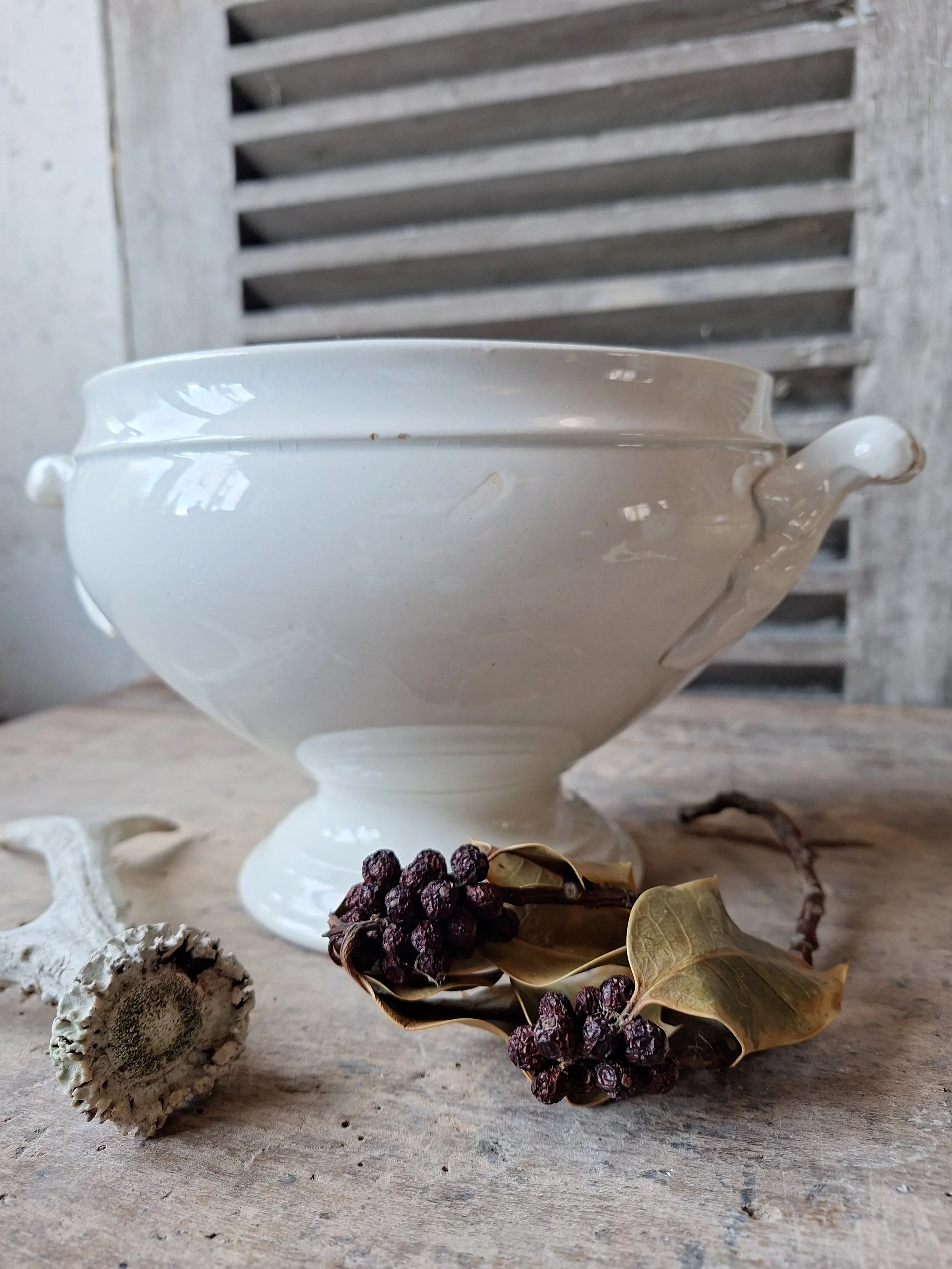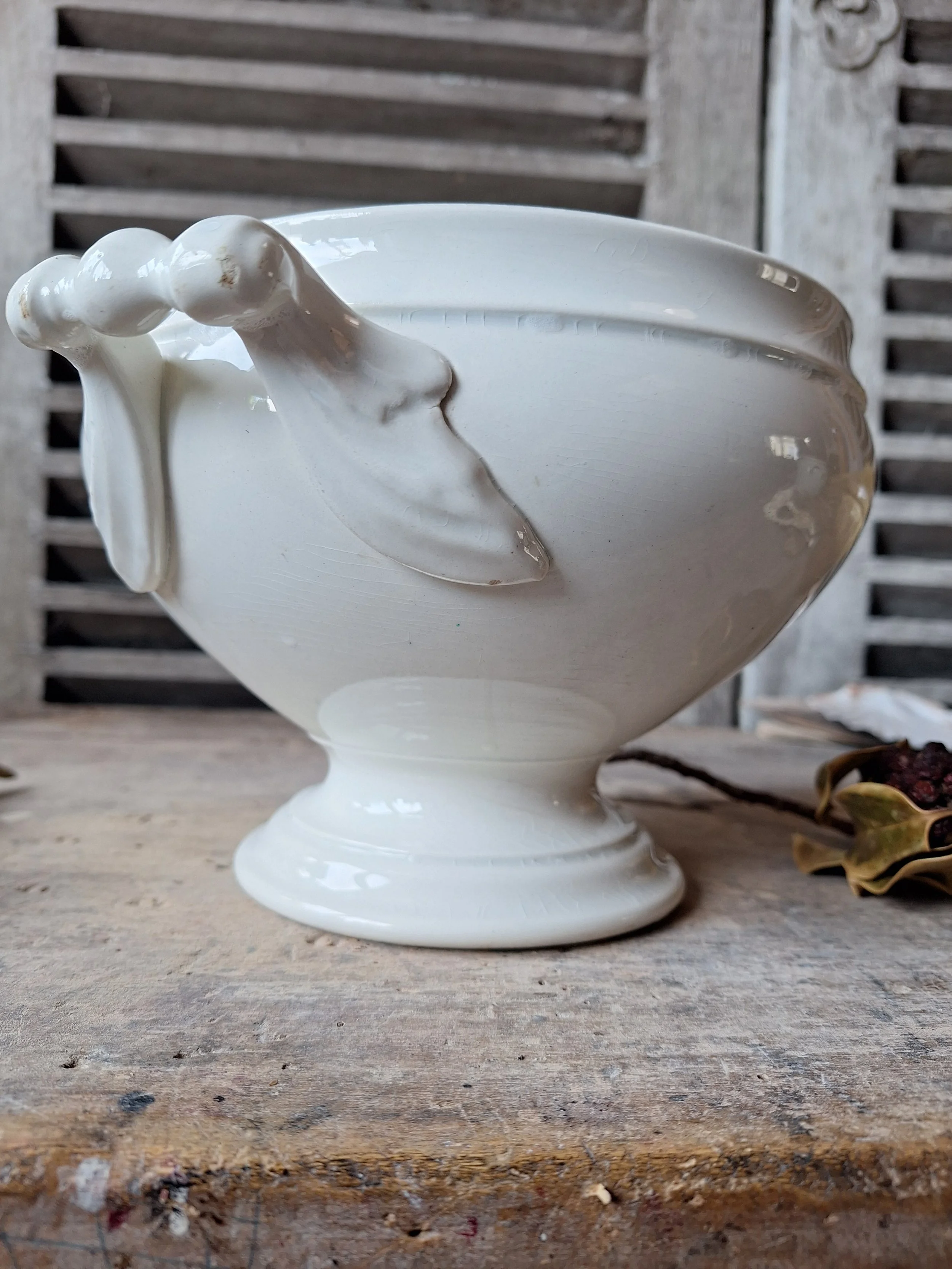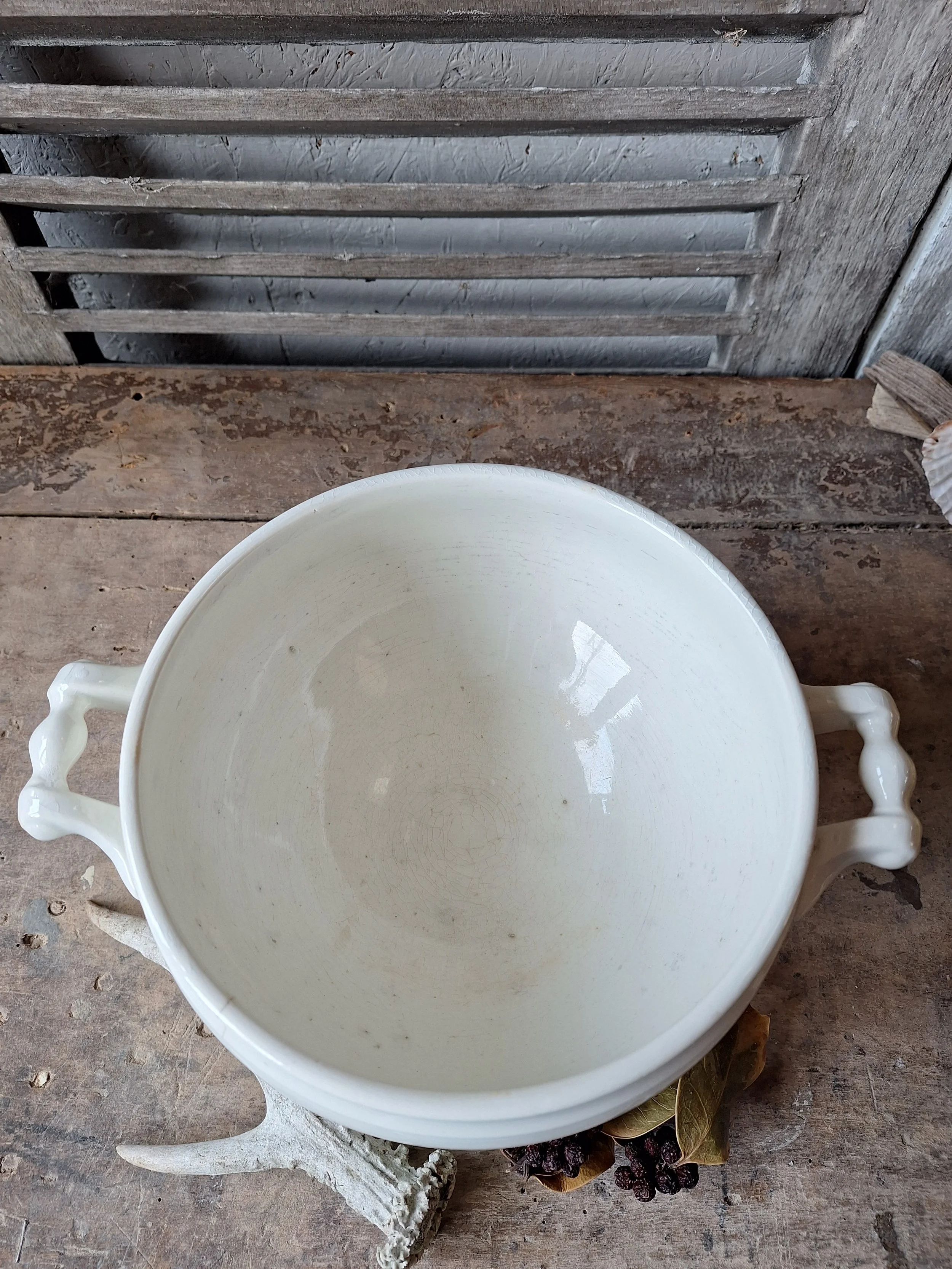 Classic white French Soupiere, found on a recent trip to France. Height 13.5cm tall. Width with handles 26cm.