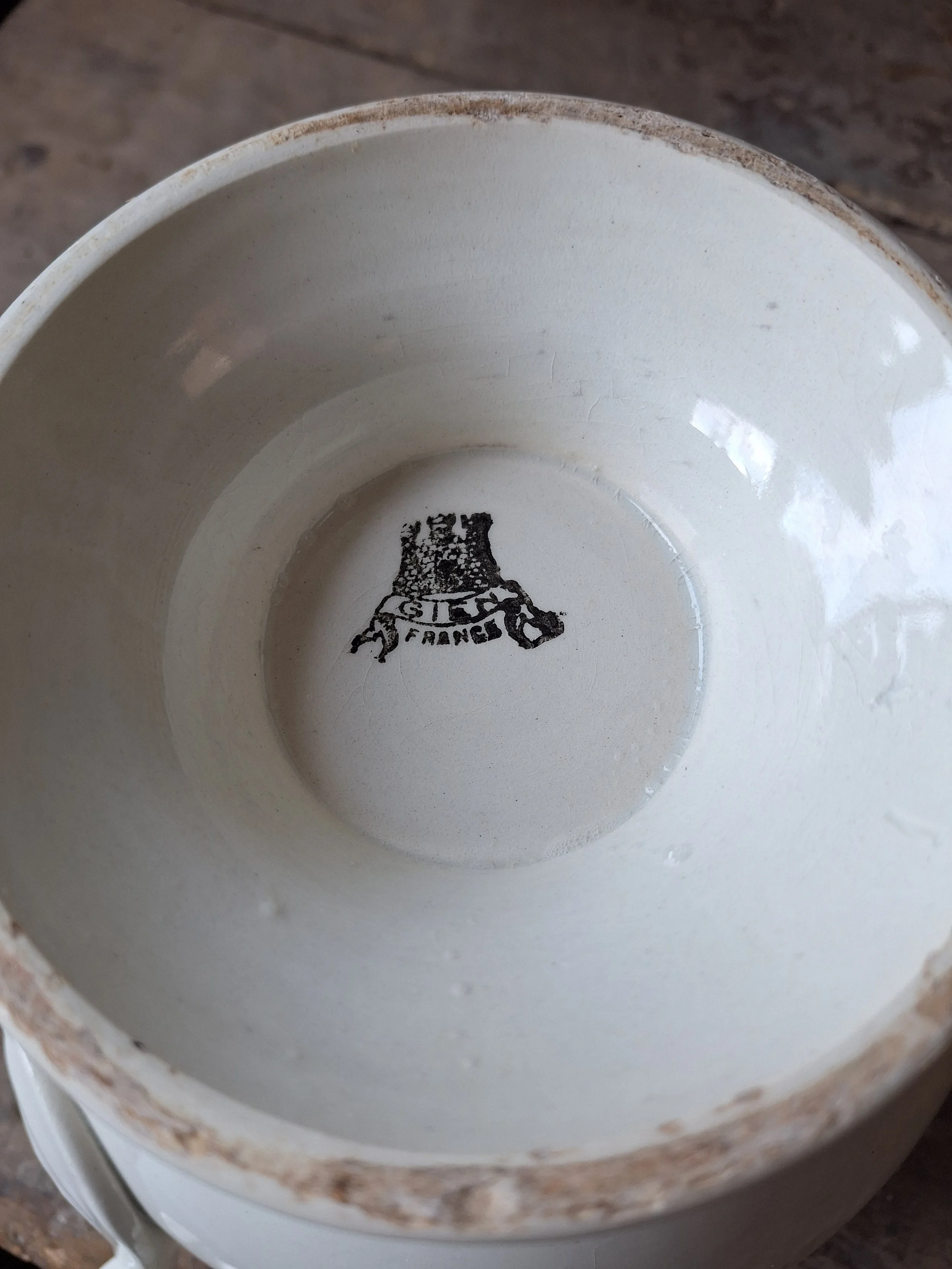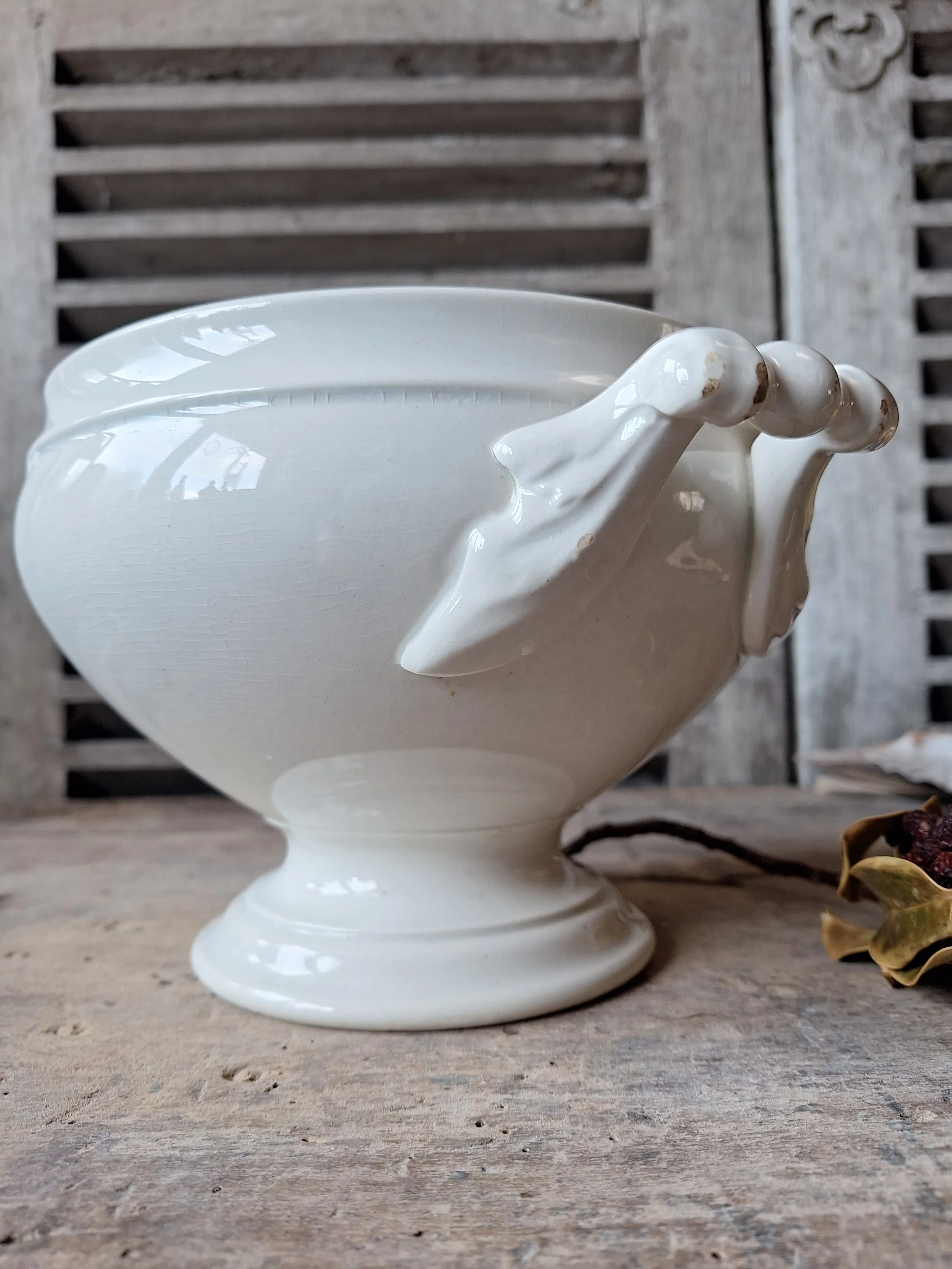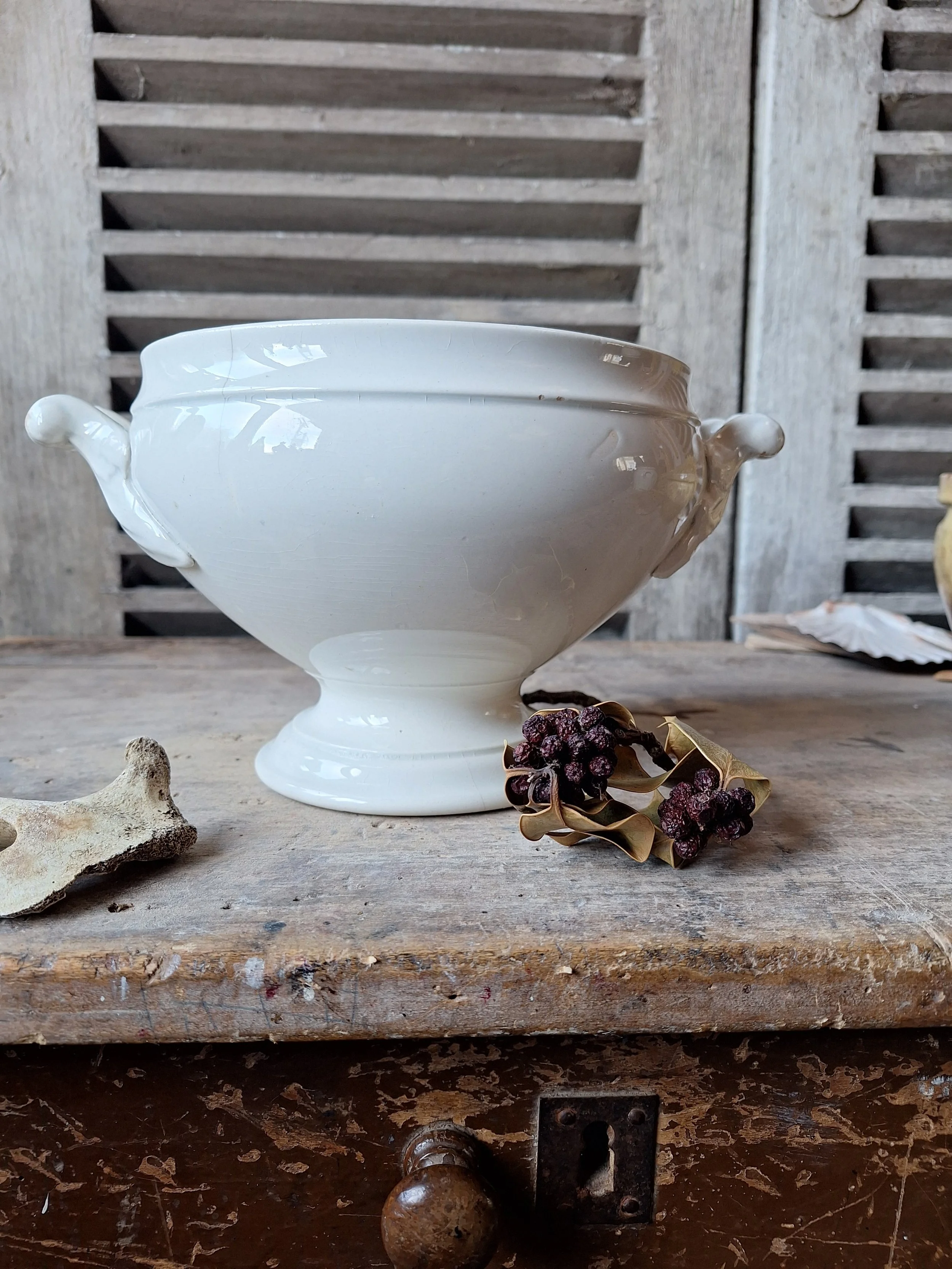 Classic white French Soupiere, found on a recent trip to France. Height 13.5cm tall. Width with handles 26cm.
