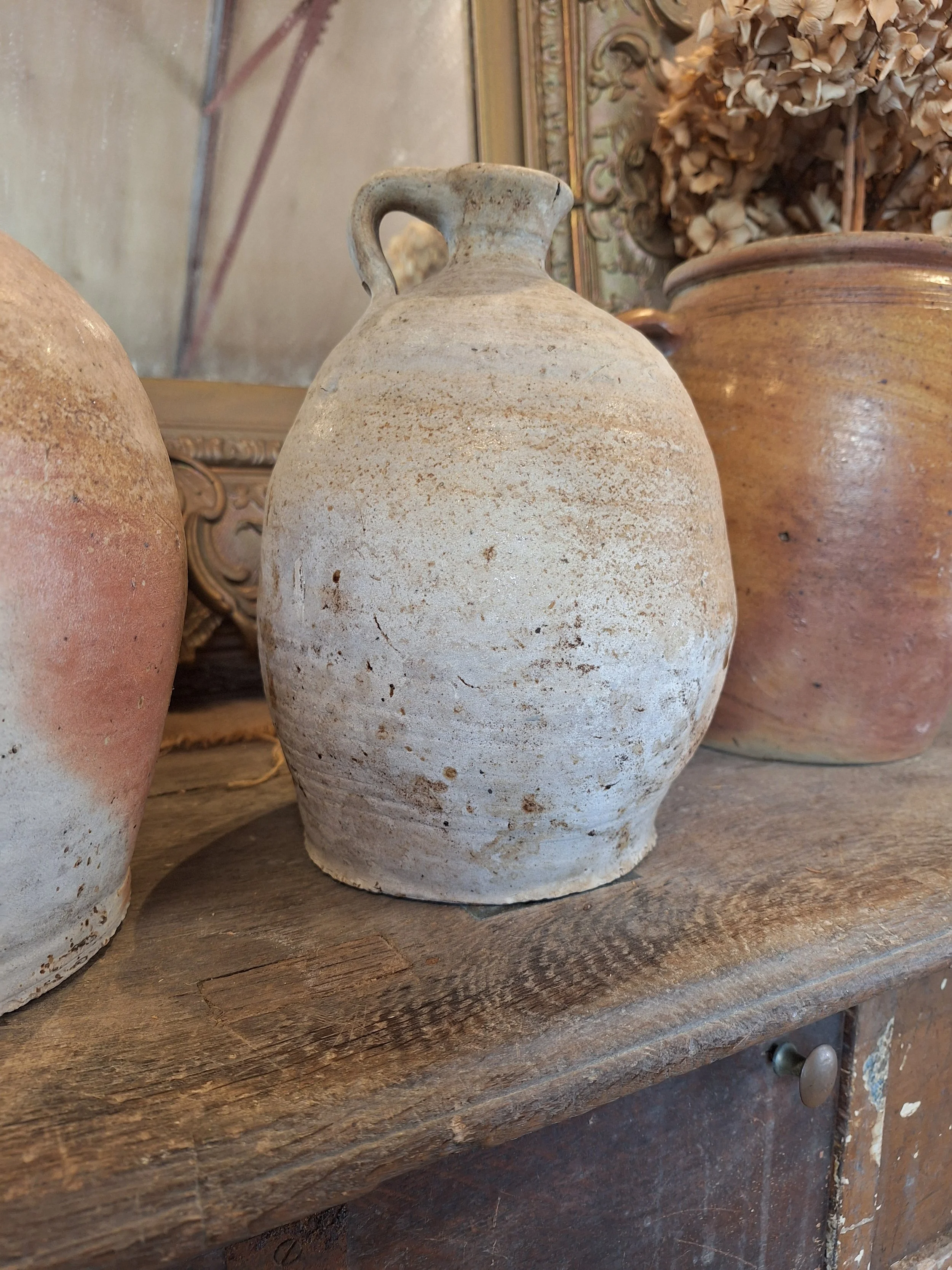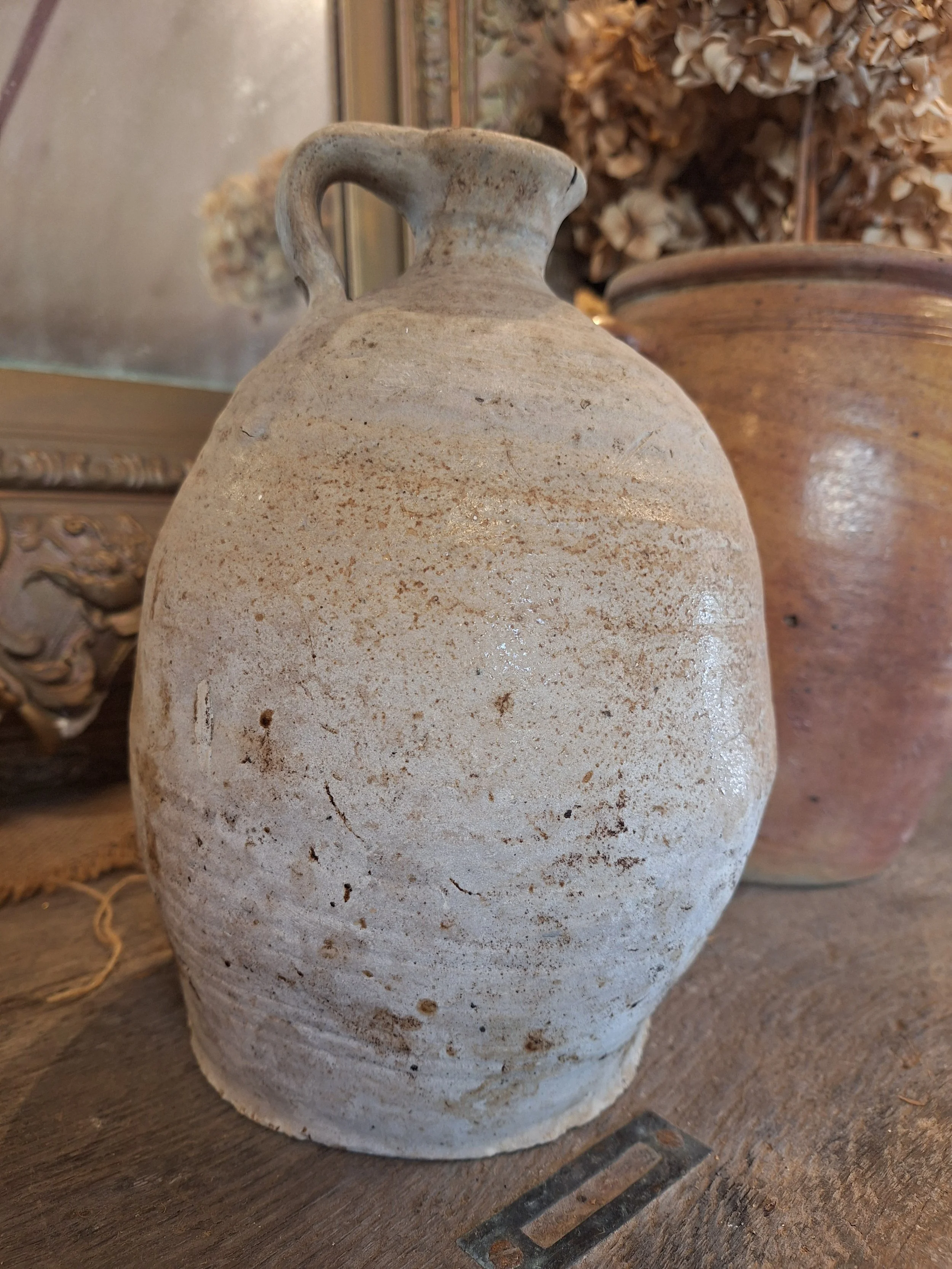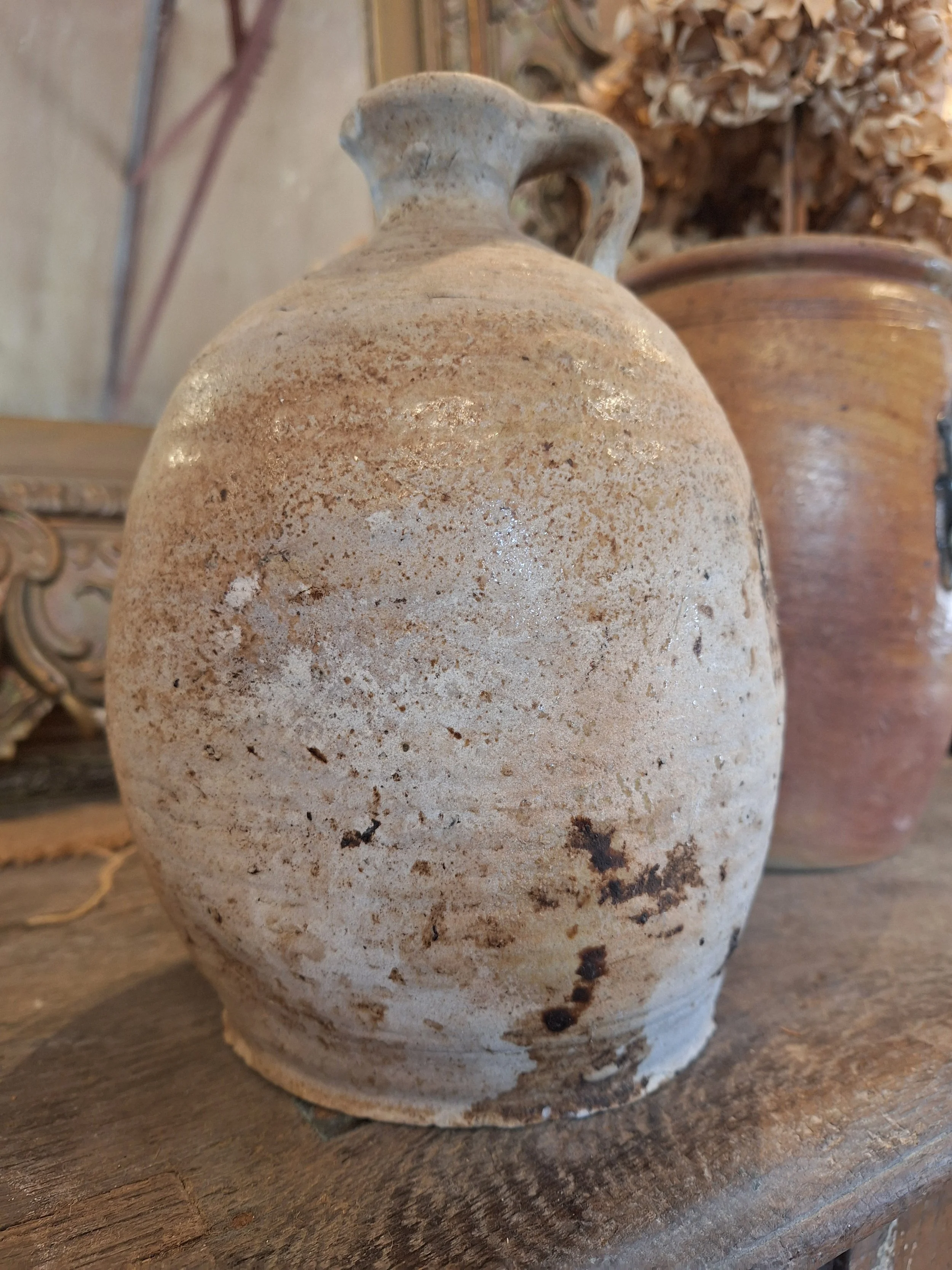 Lovely rustic stoneware jug. Some small nibbles, rough texture, these were handmade, they have dents, marks and drips of glaze when made, making each one individual and beautiful. Height 23cm base diameter 12.5cm.