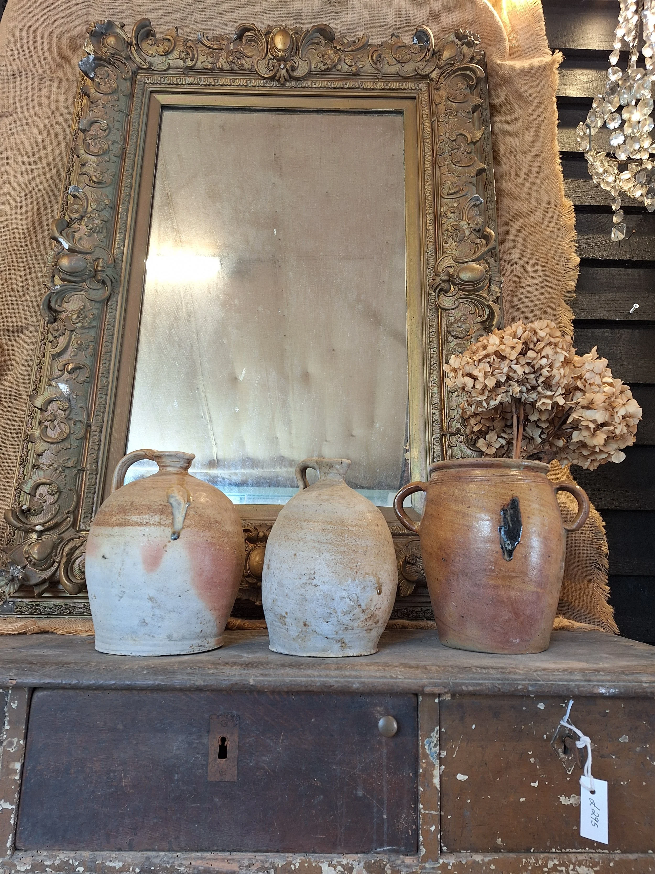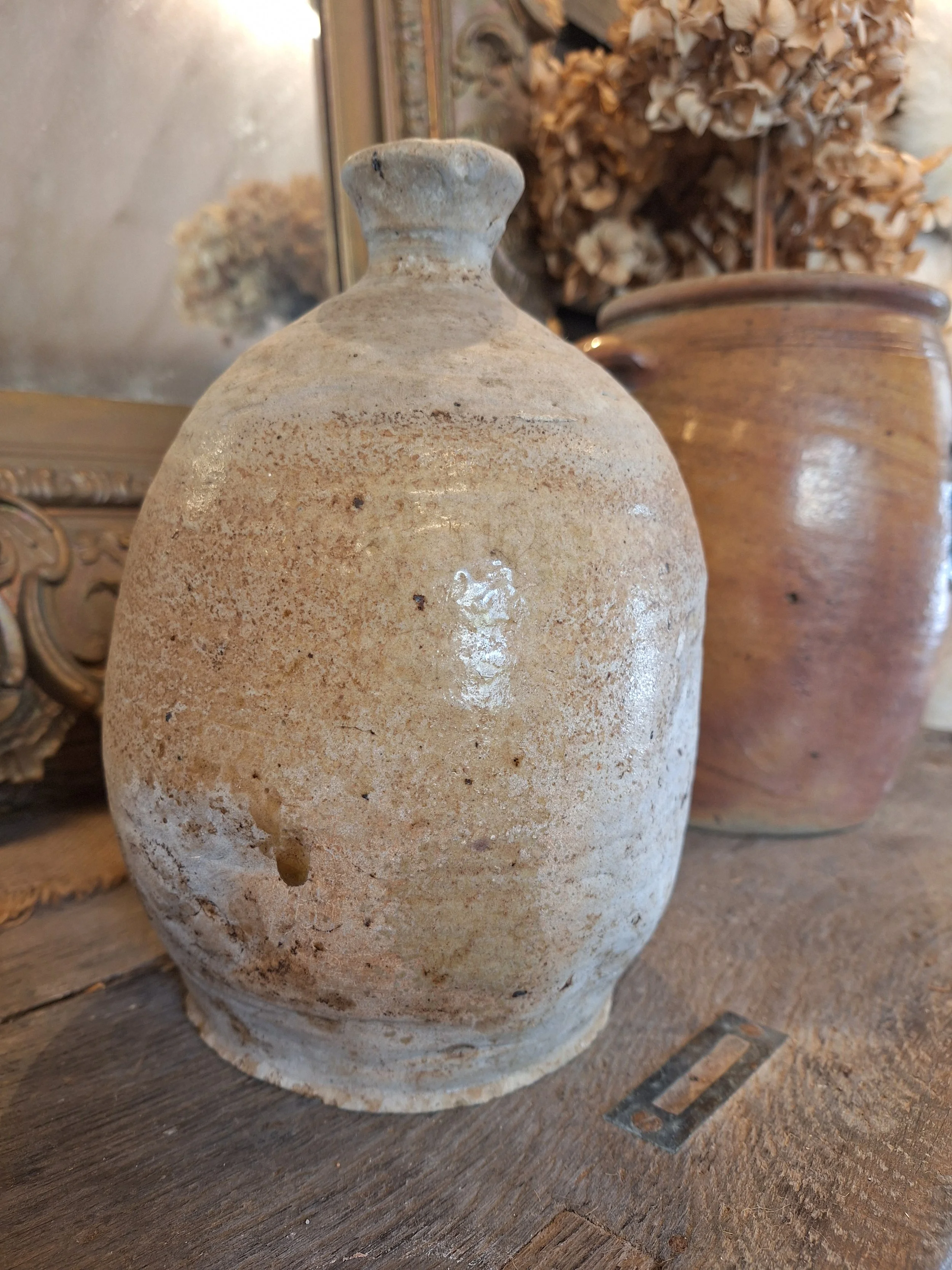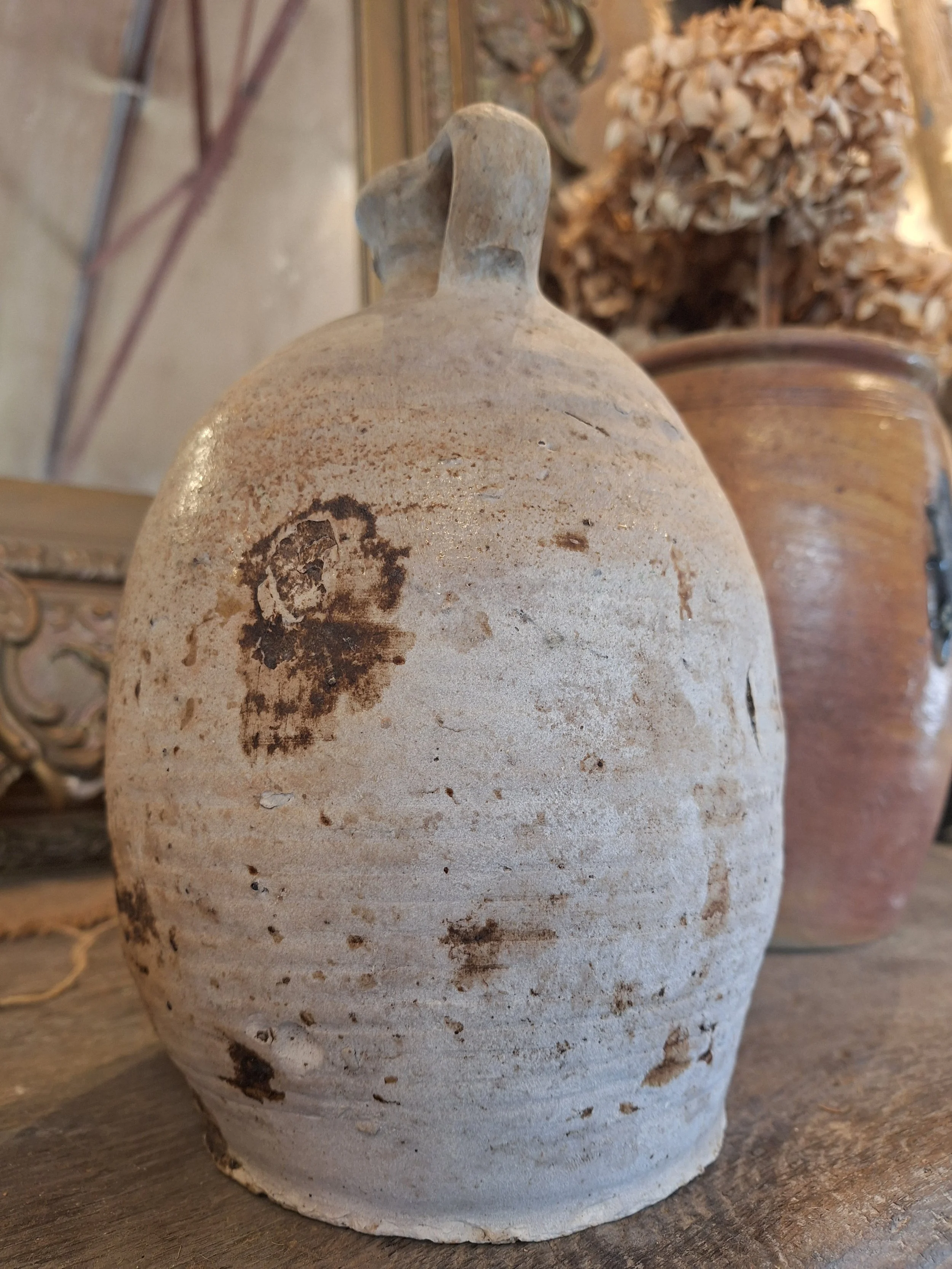 Lovely rustic stoneware jug. Some small nibbles, rough texture, these were handmade, they have dents, marks and drips of glaze when made, making each one individual and beautiful. Height 23cm base diameter 12.5cm.