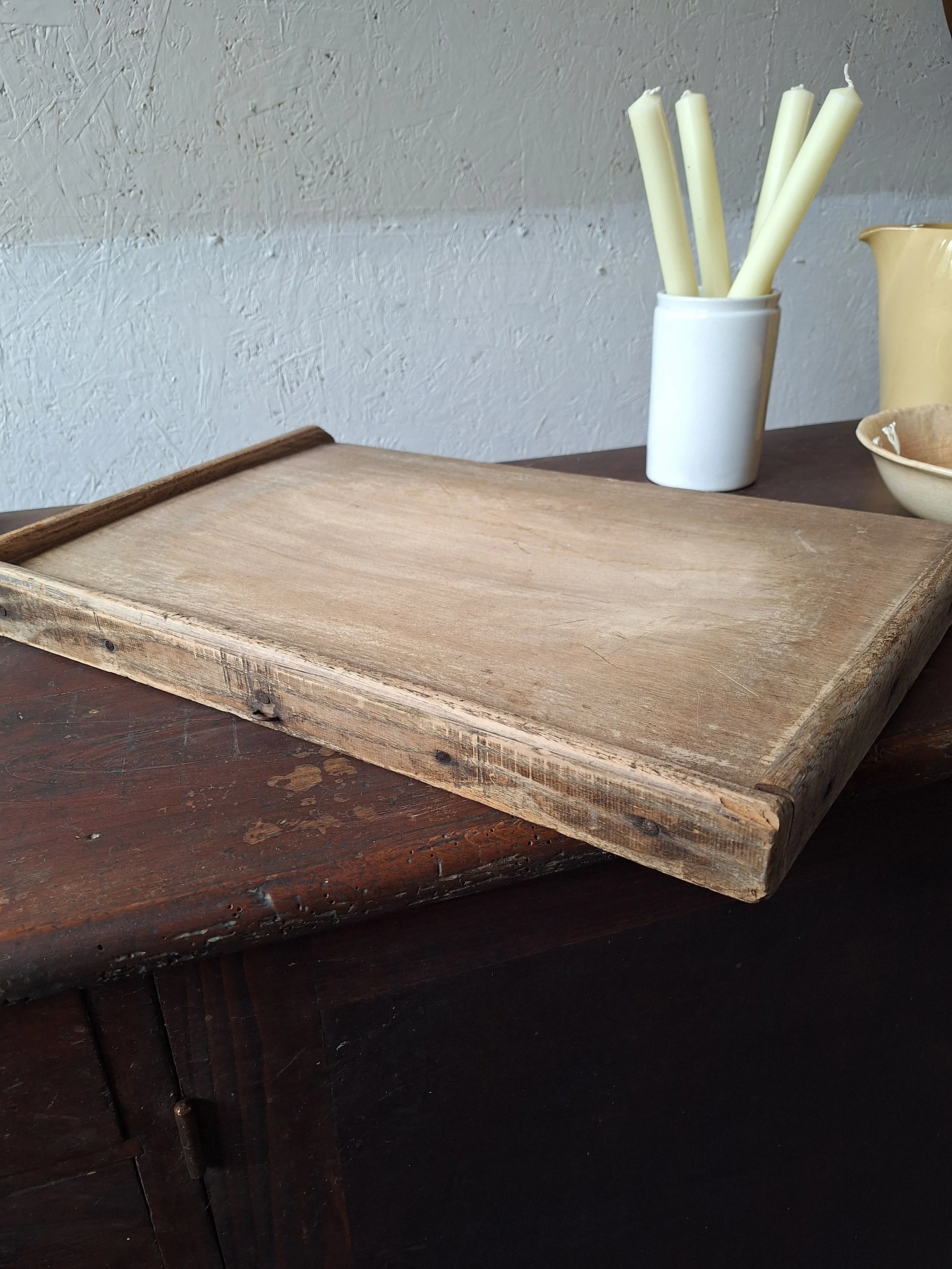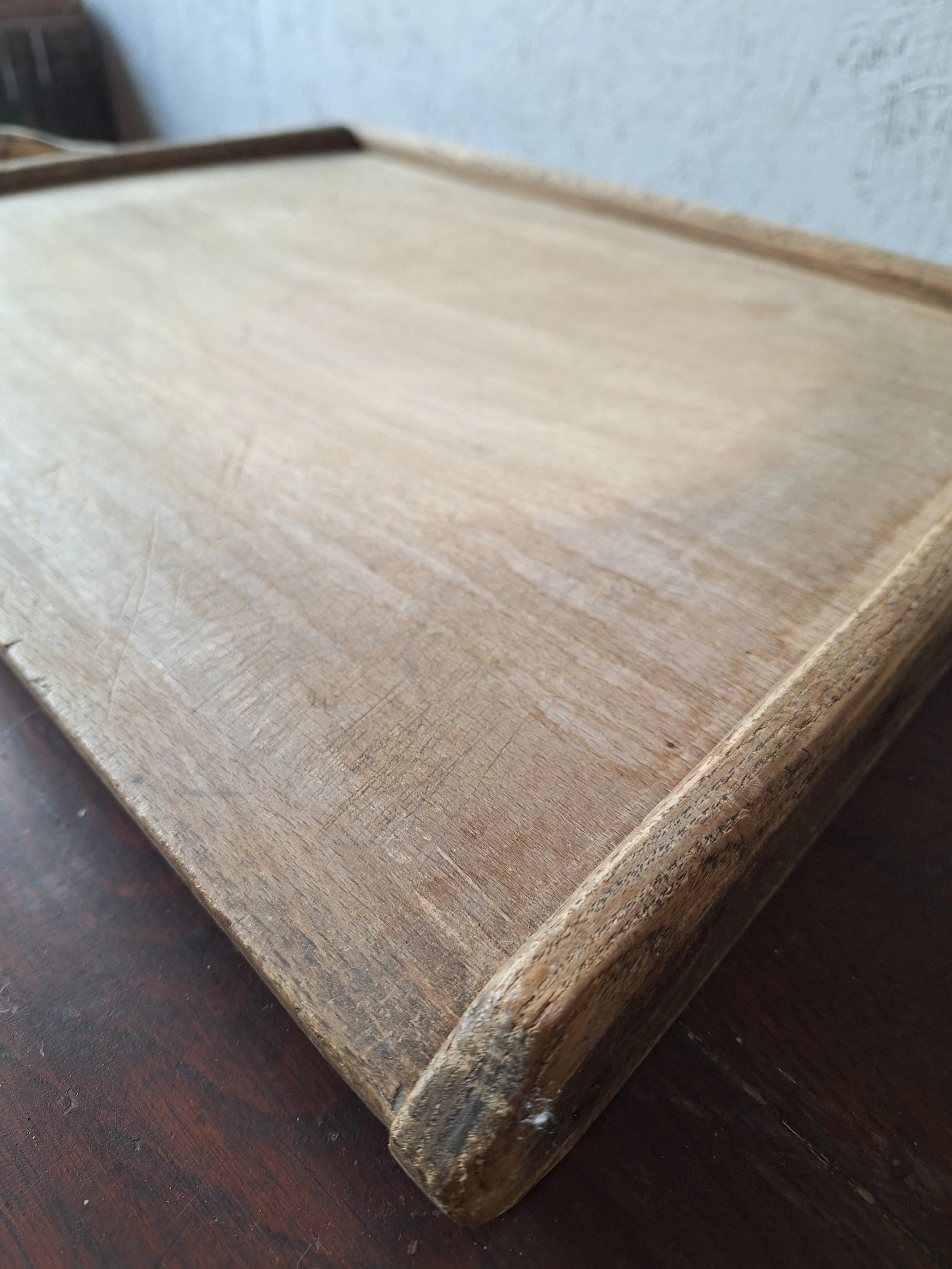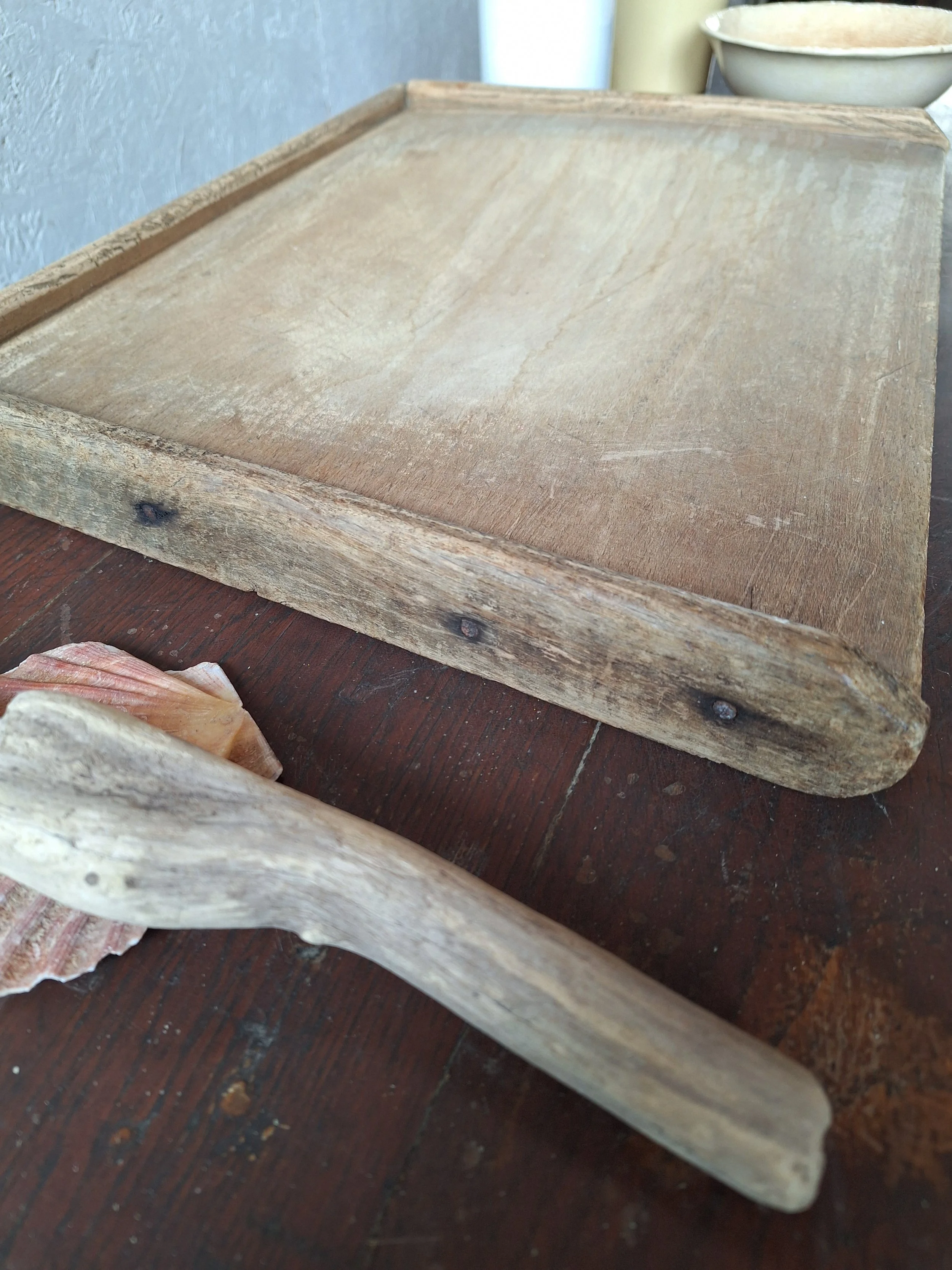 Vintage French board with edging. Lovely wooden board with small hook at end. Good condition. This item is vintage and will show signs of age. Please view all photos carefully. Max length 50cm. Depth 34cm. 4cm thick.