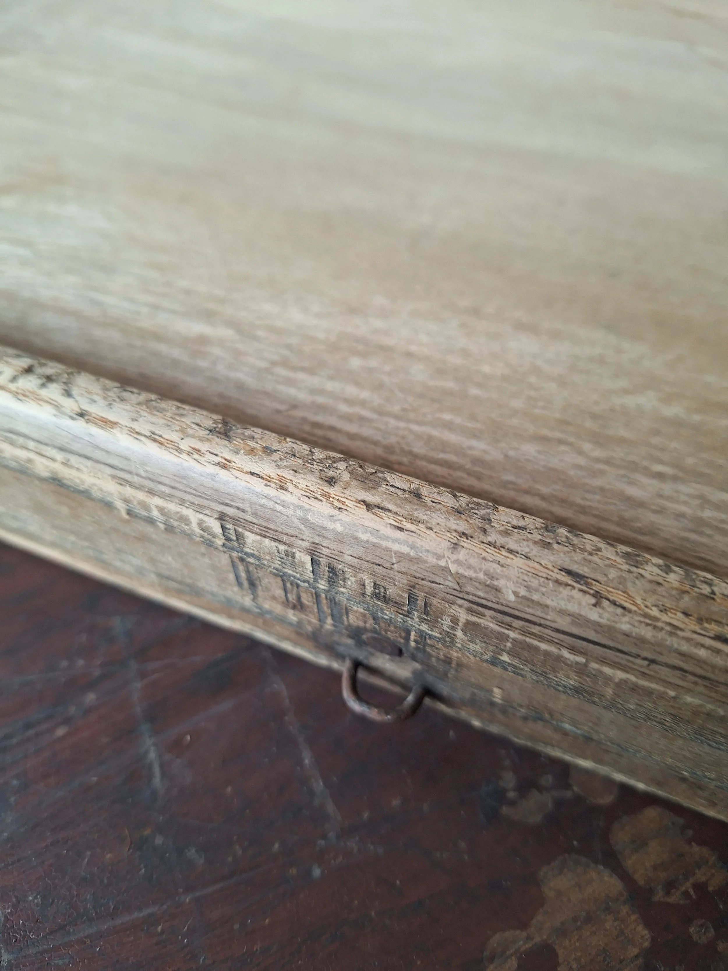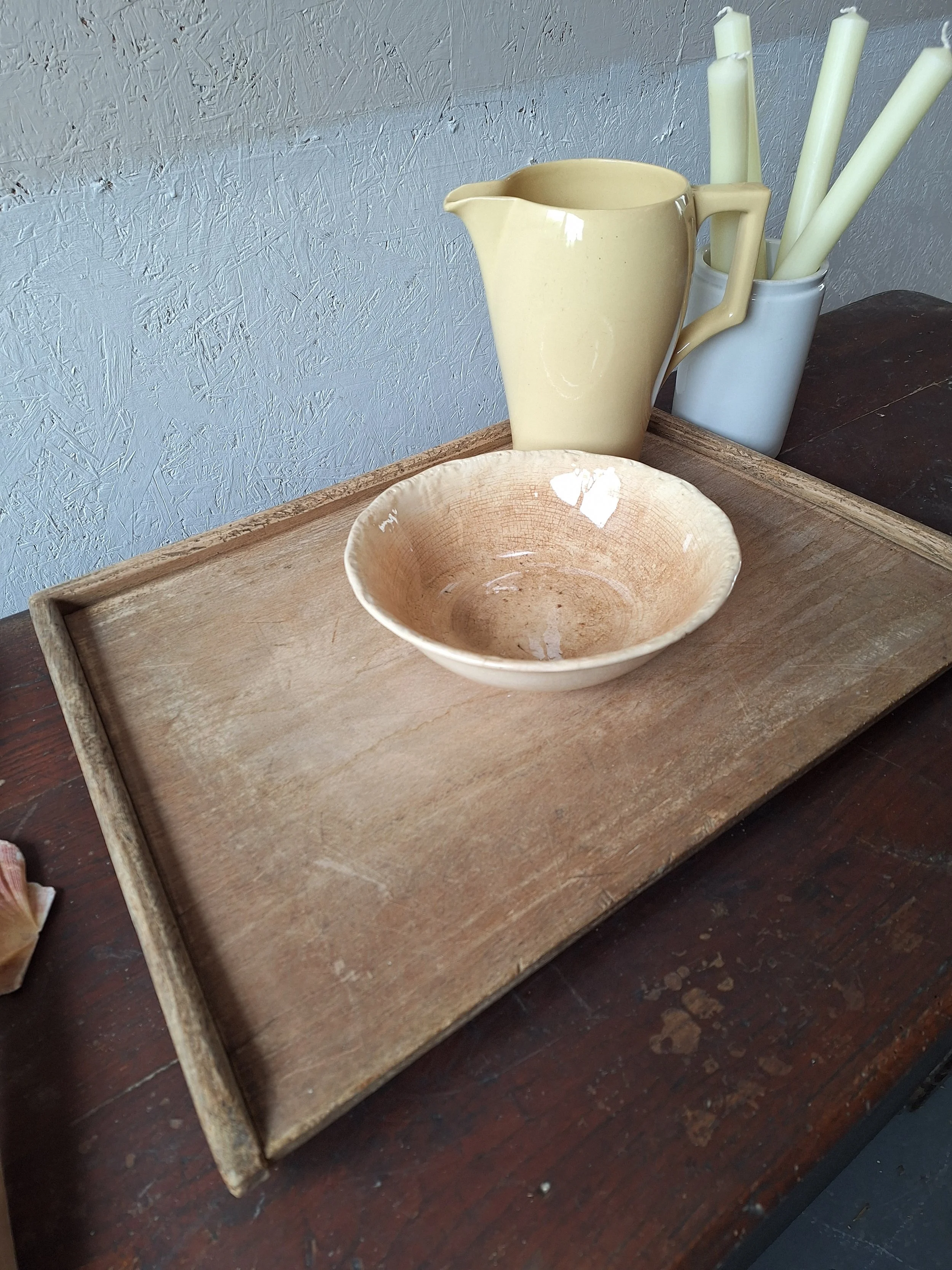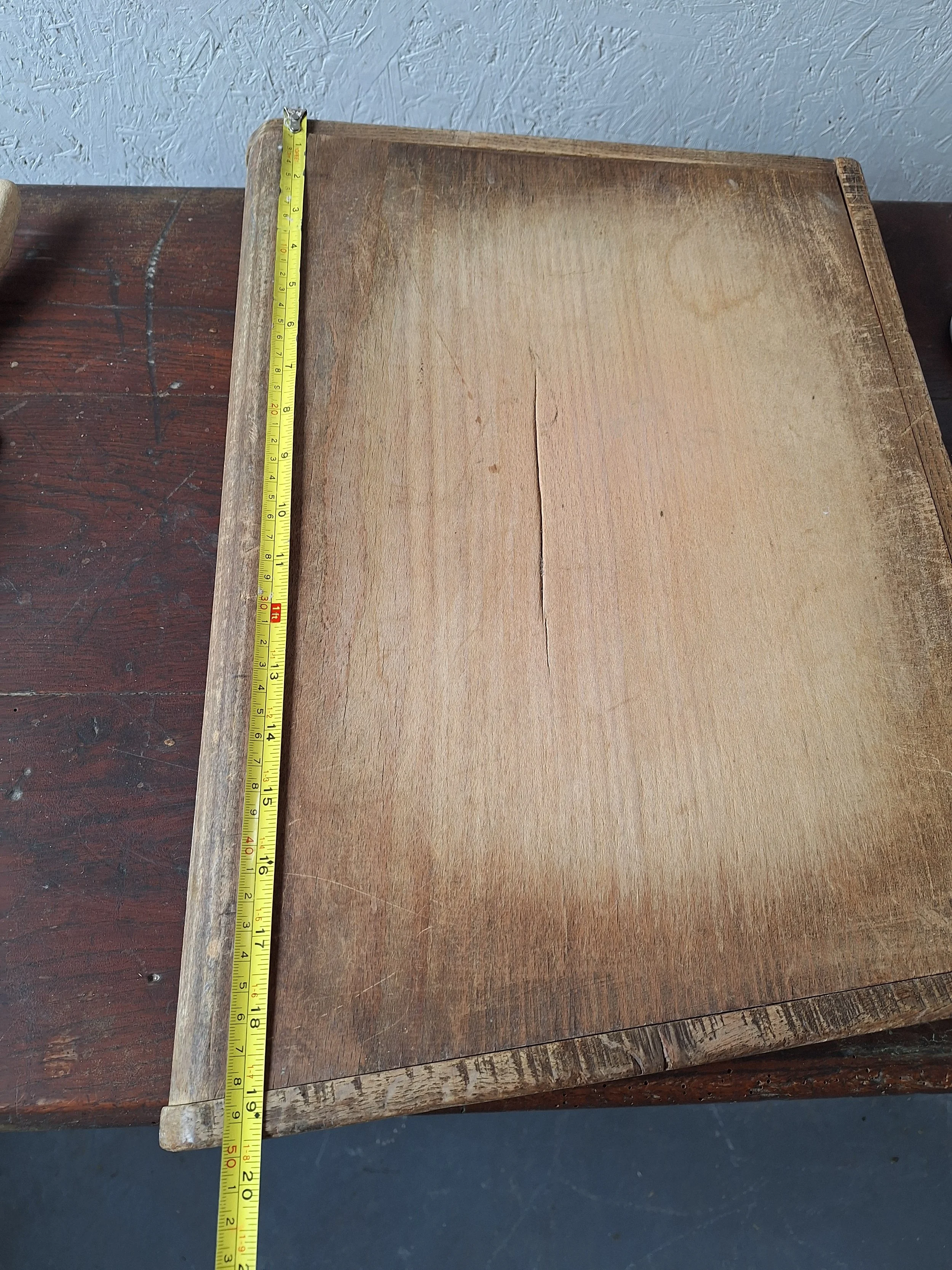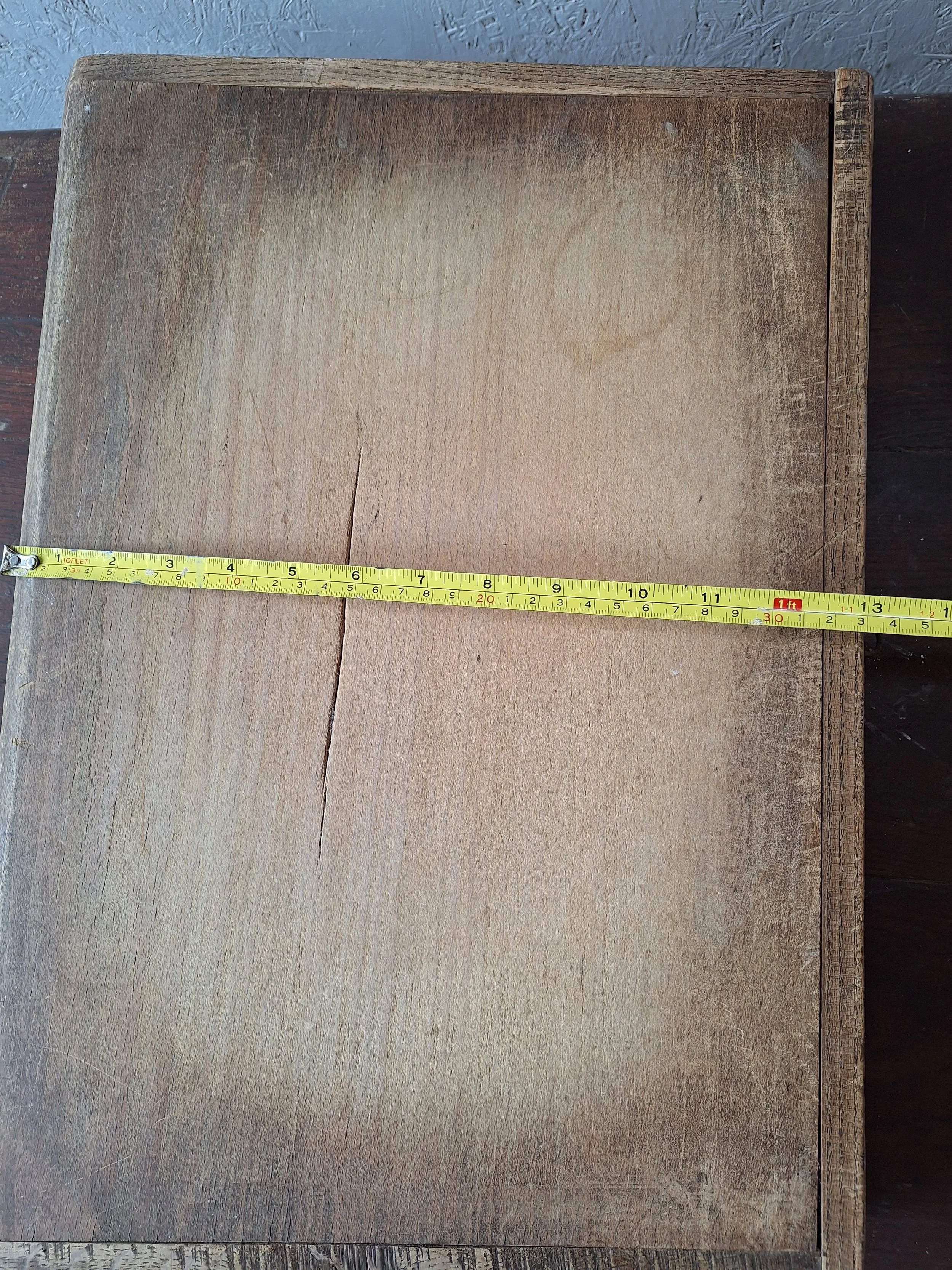 Vintage French board with edging. Lovely wooden board with small hook at end. Good condition. This item is vintage and will show signs of age. Please view all photos carefully. Max length 50cm. Depth 34cm. 4cm thick.