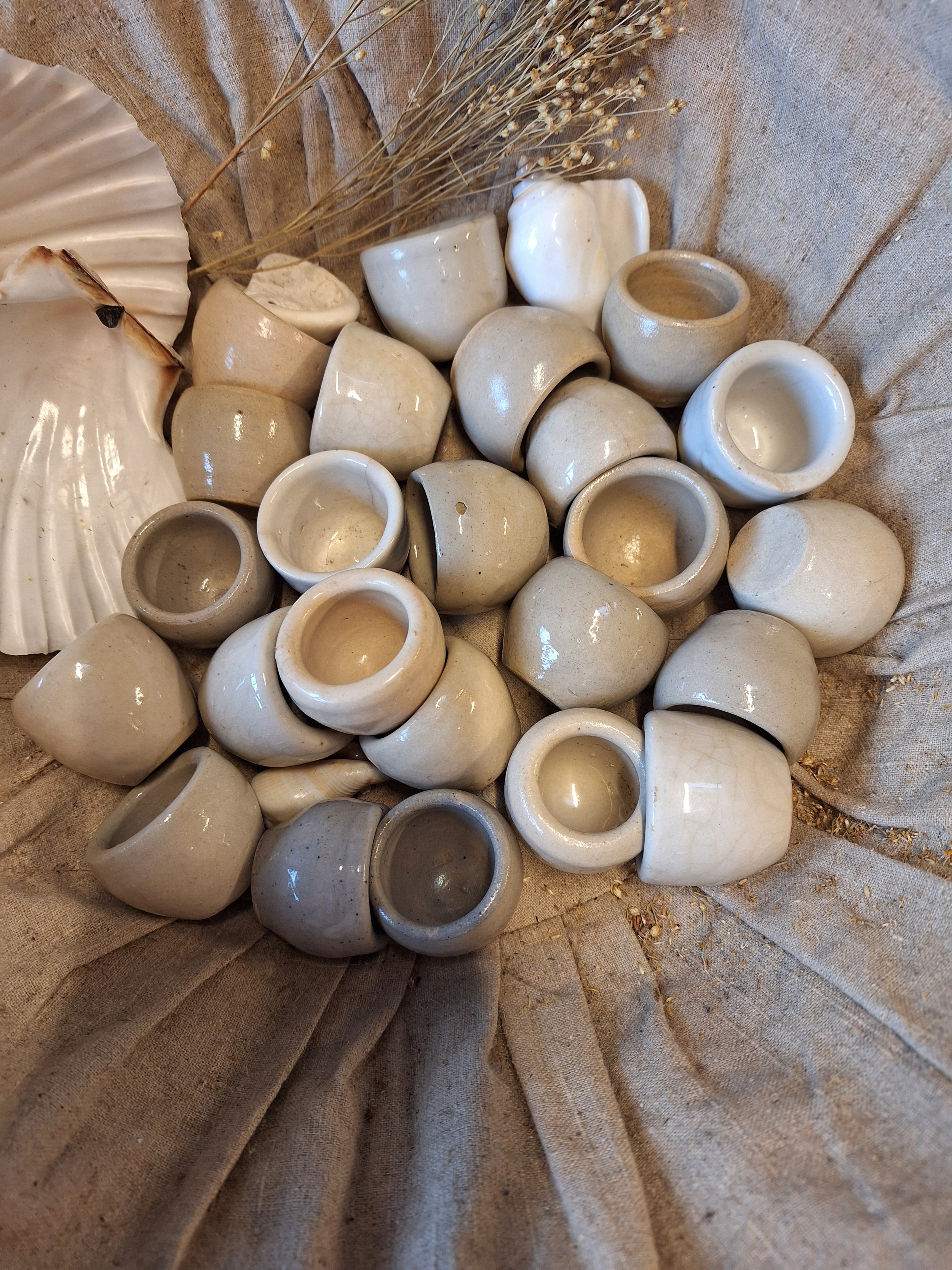 21 mixed grey and cream tones. From France. Some woth fine cracks, and little chips, sold as one lot. Decorative item, useful for butter or sauce or create small candle. All my items are vintage and will show signs of age. Please view all pictures. These are pottery and have glaze patches. They are all unique. No chips, cracks or damage.