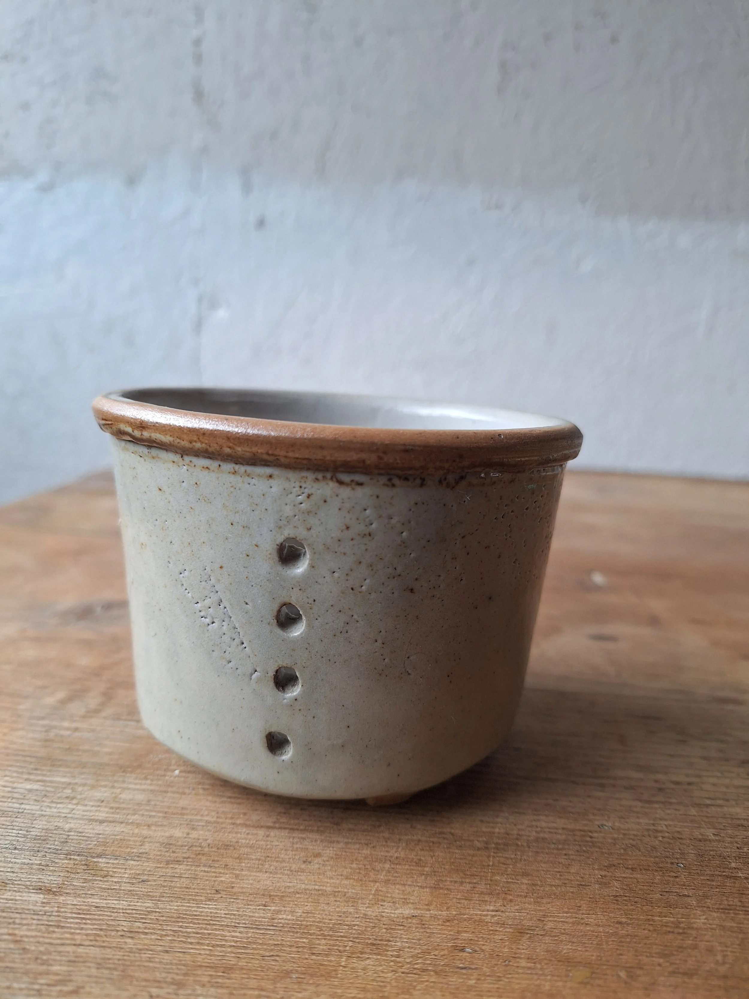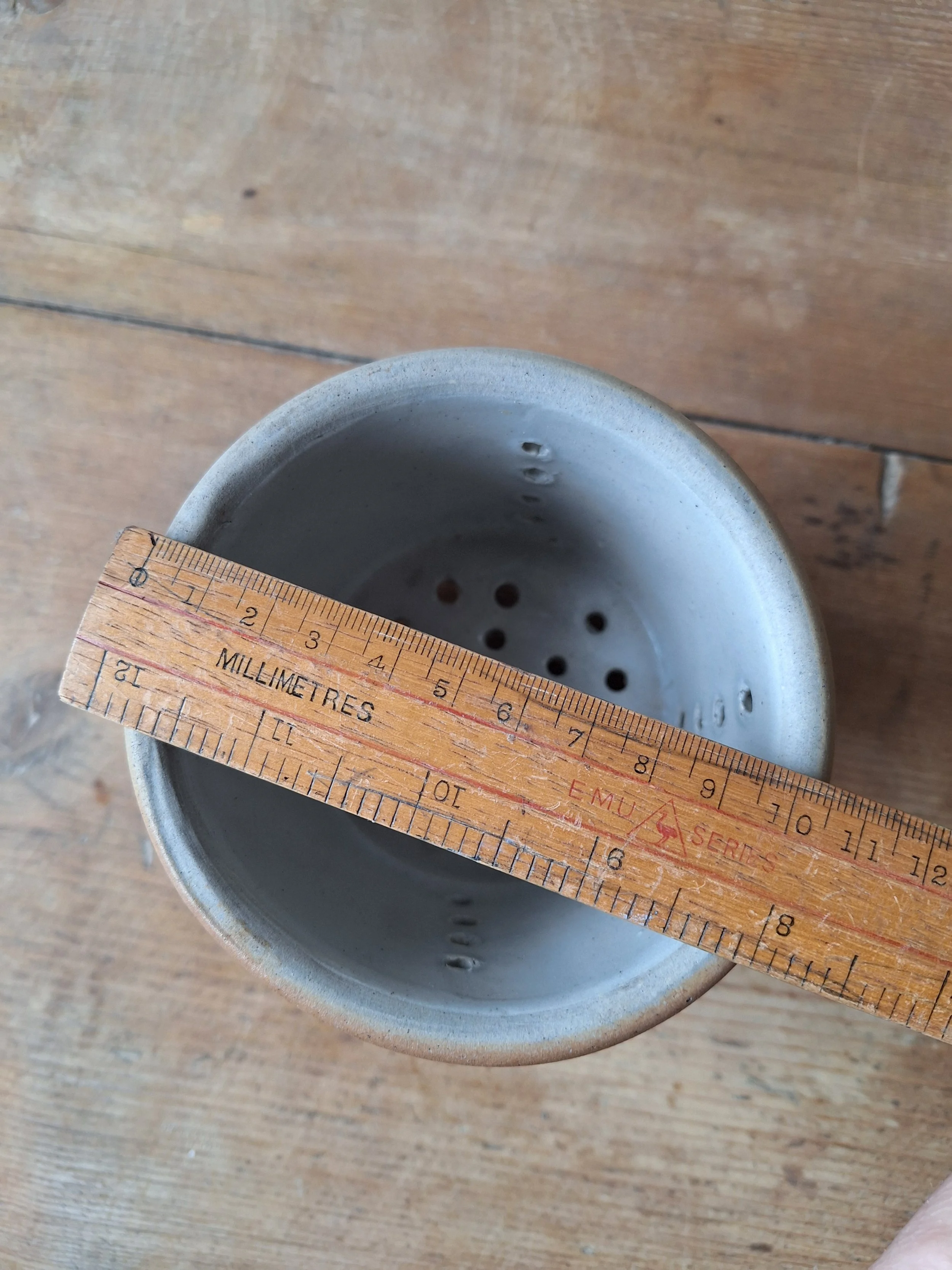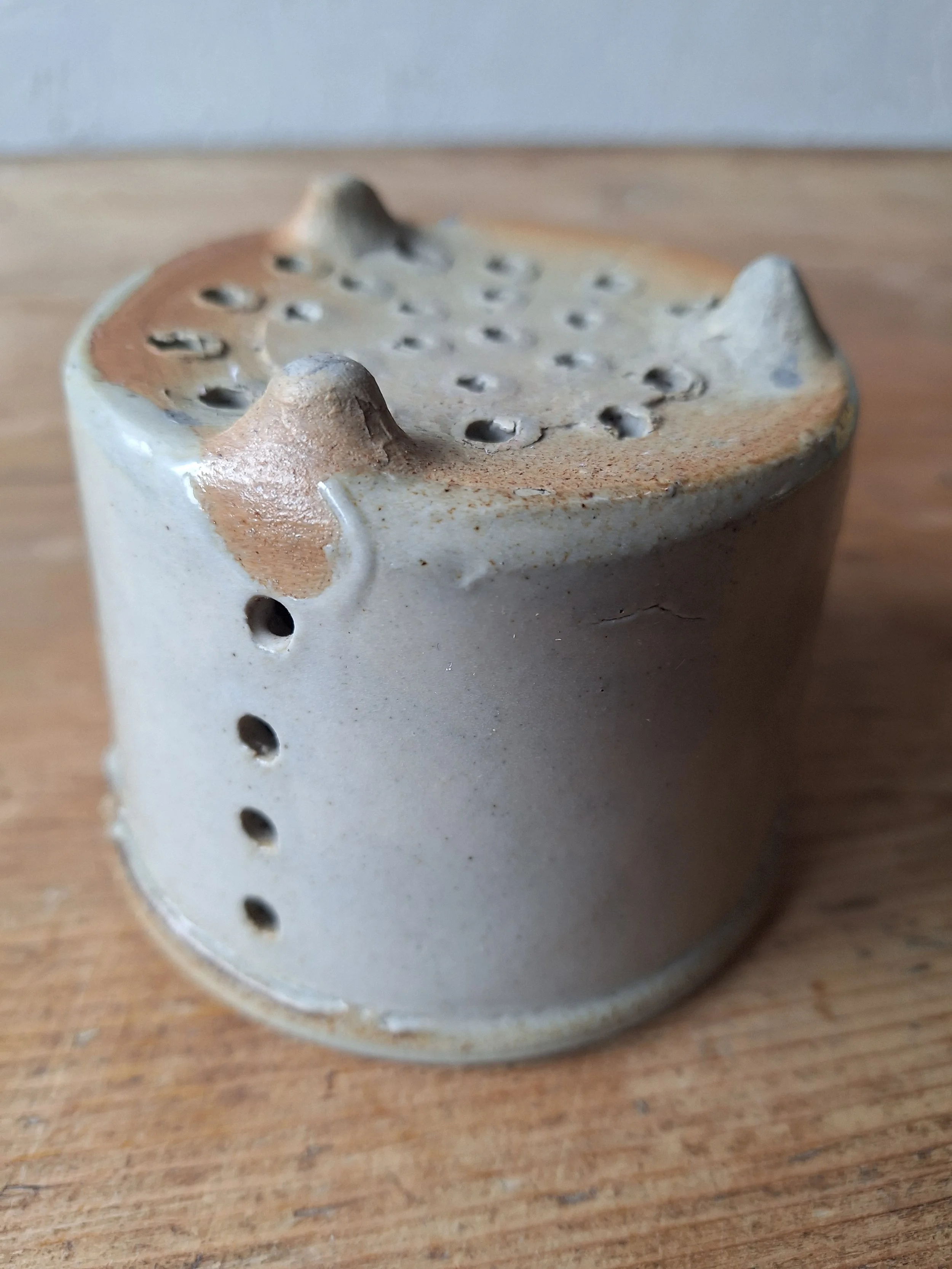 Lovely little cheese strainer in a classic grey/cream glaze. Height 8cm. Diameter 11cm.