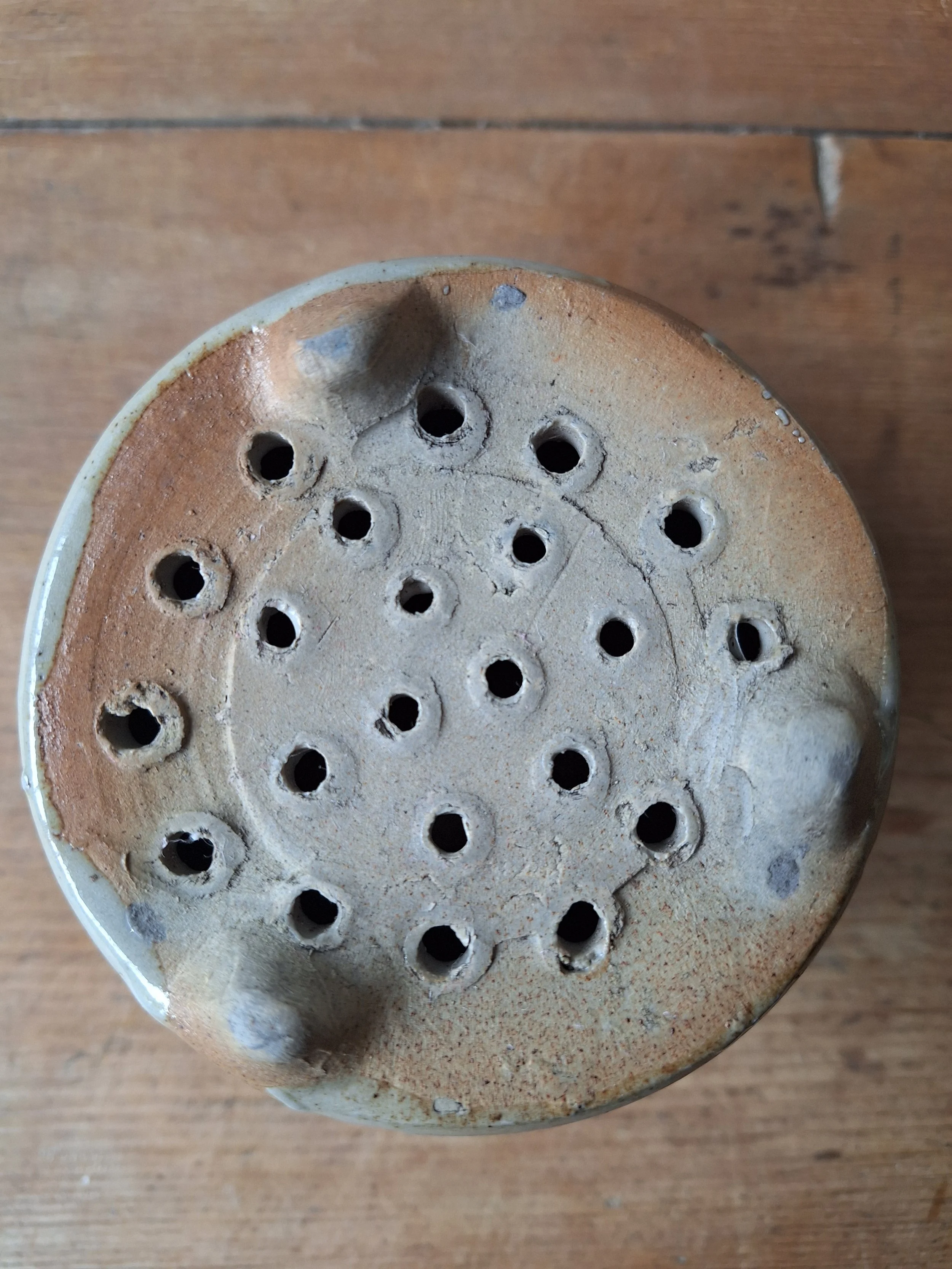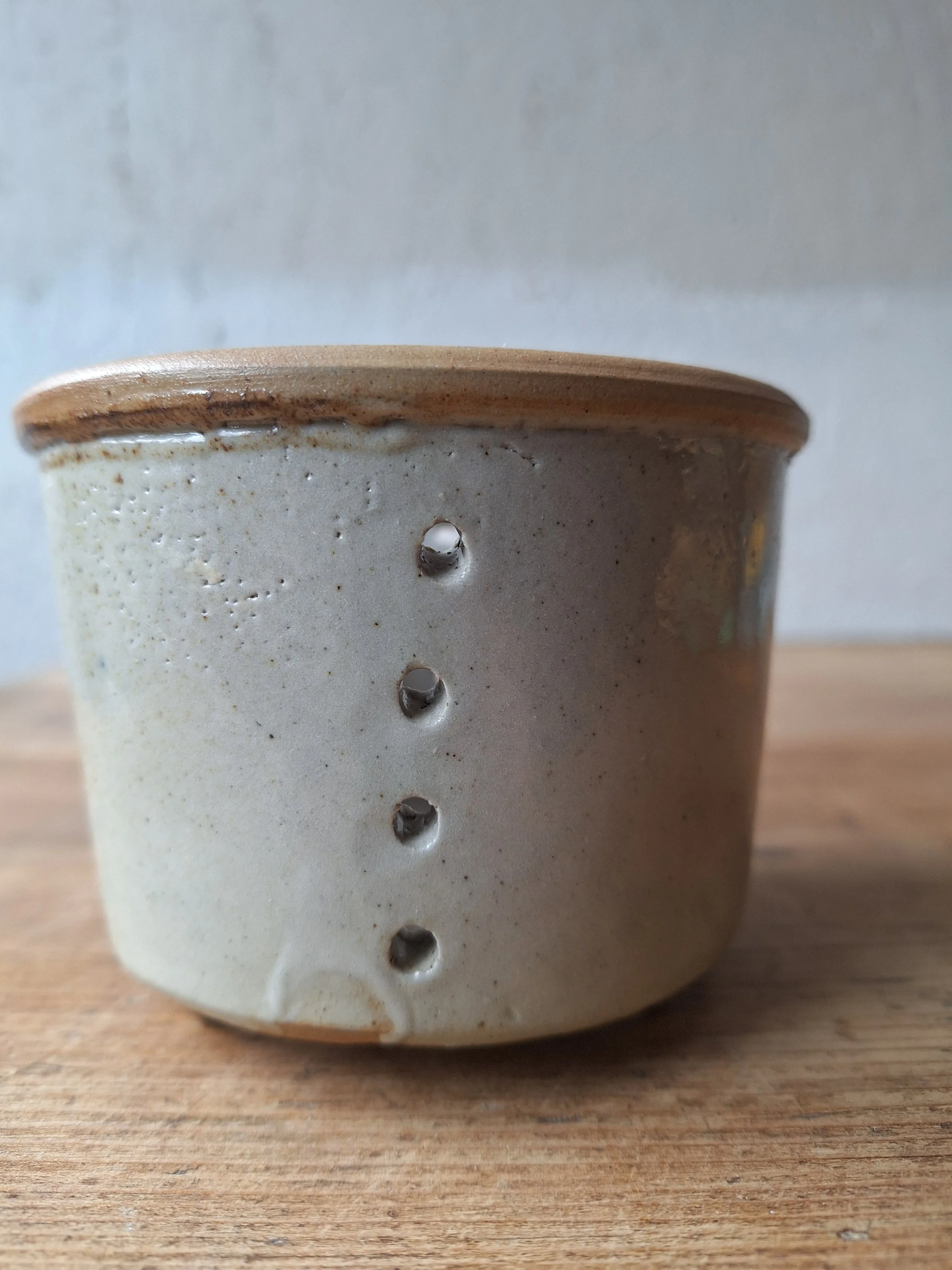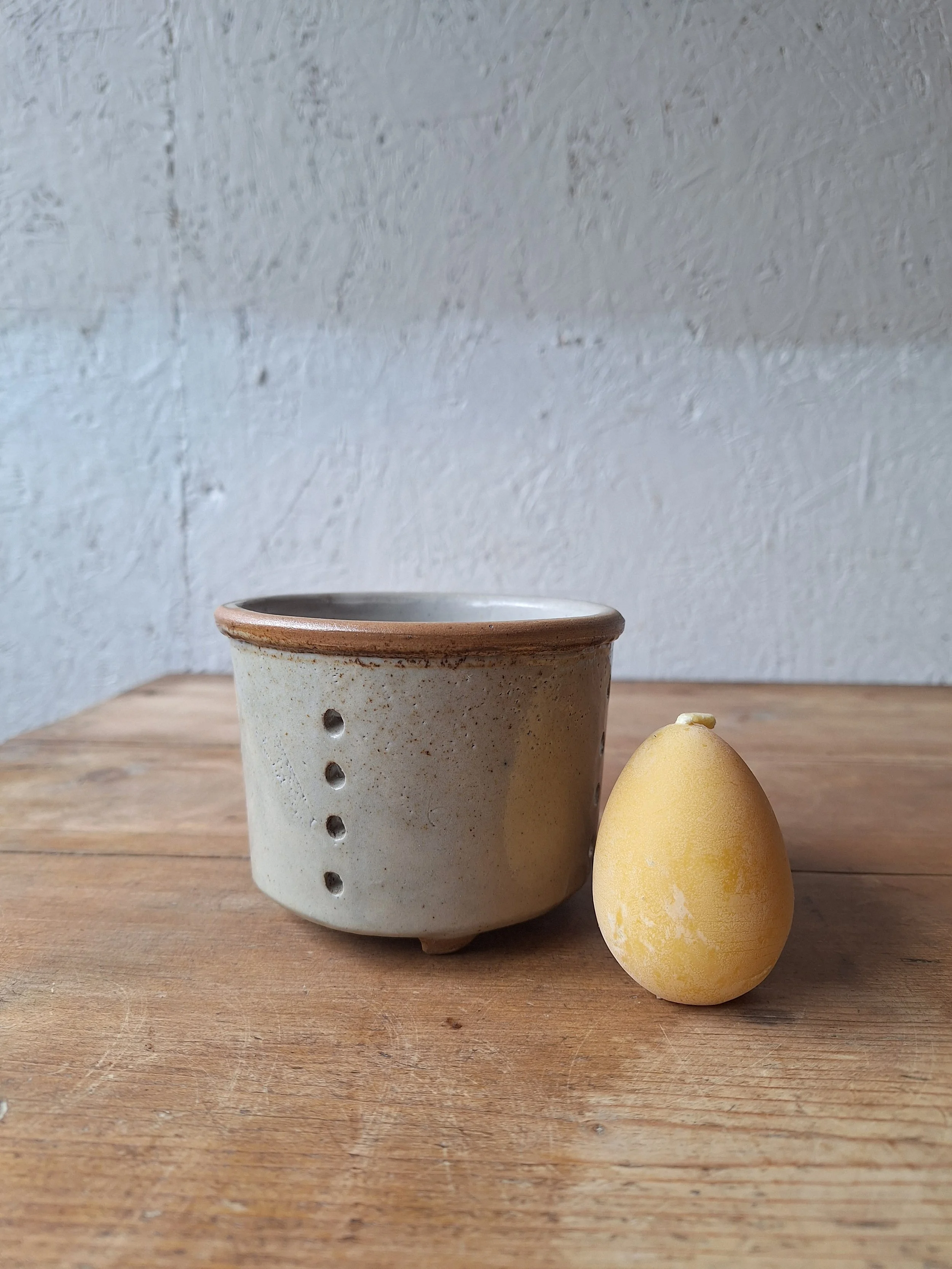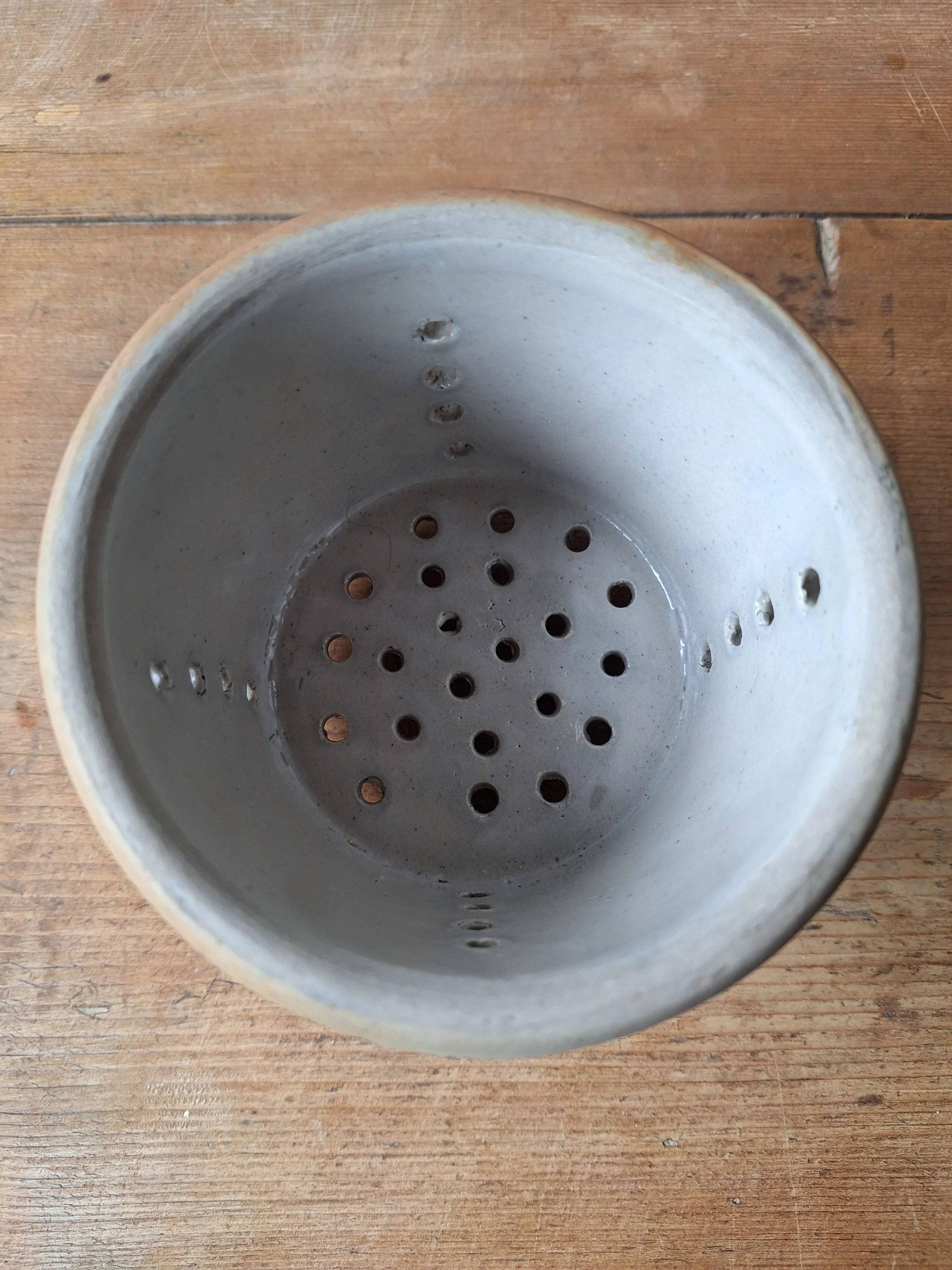 Lovely little cheese strainer in a classic grey/cream glaze. Height 8cm. Diameter 11cm.