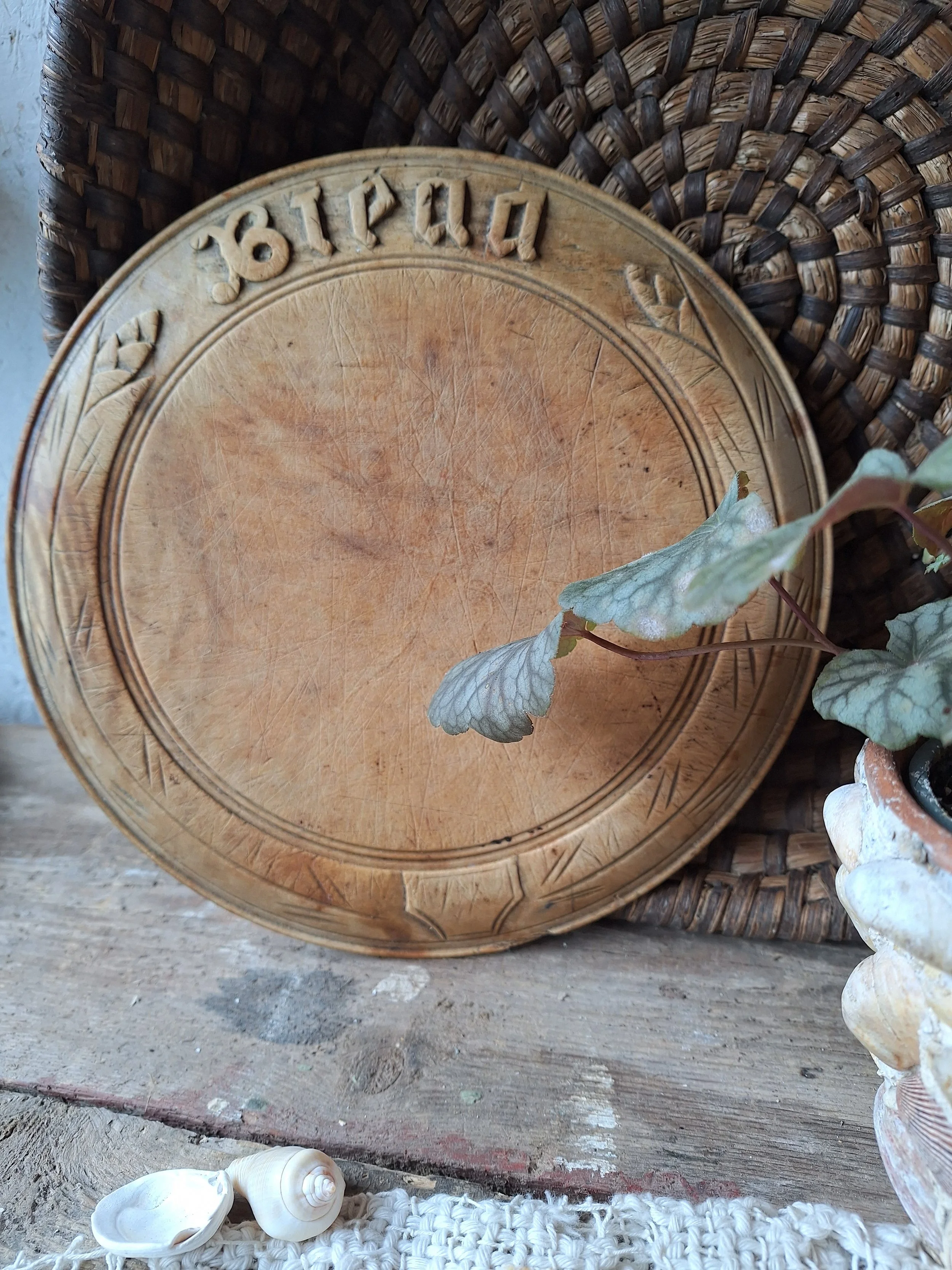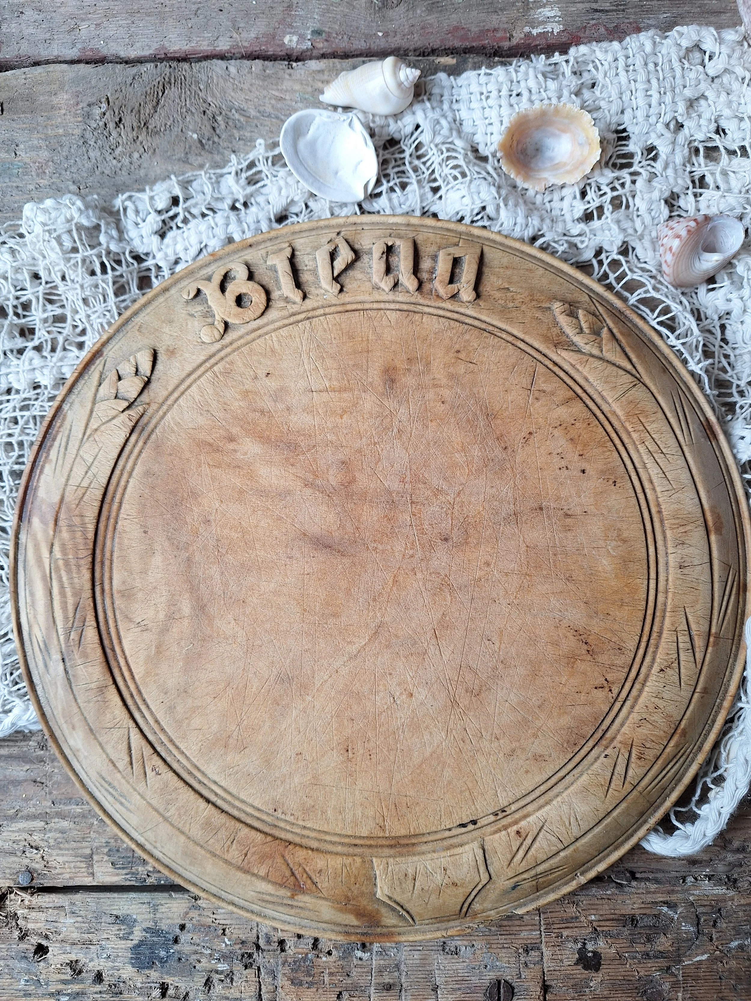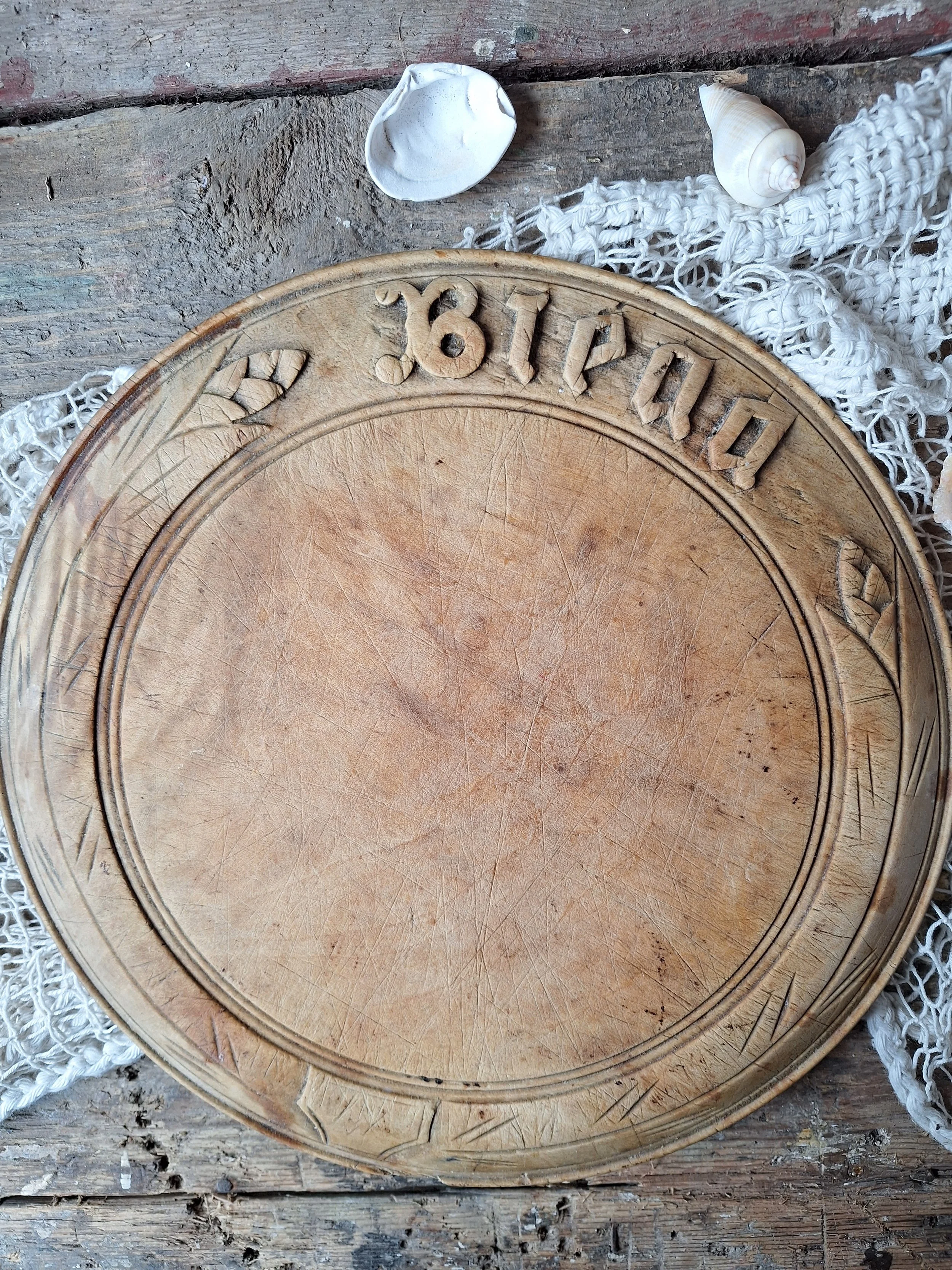 Lovely decorative wooden breadboard with ‘bread’ at the top and wheat design. This has a small chip to the wood, some stains and of course cut marks across it. It would have been used in the kitchen for carving bread on. The size is approx. 24.6cm across and depth is 2cm.