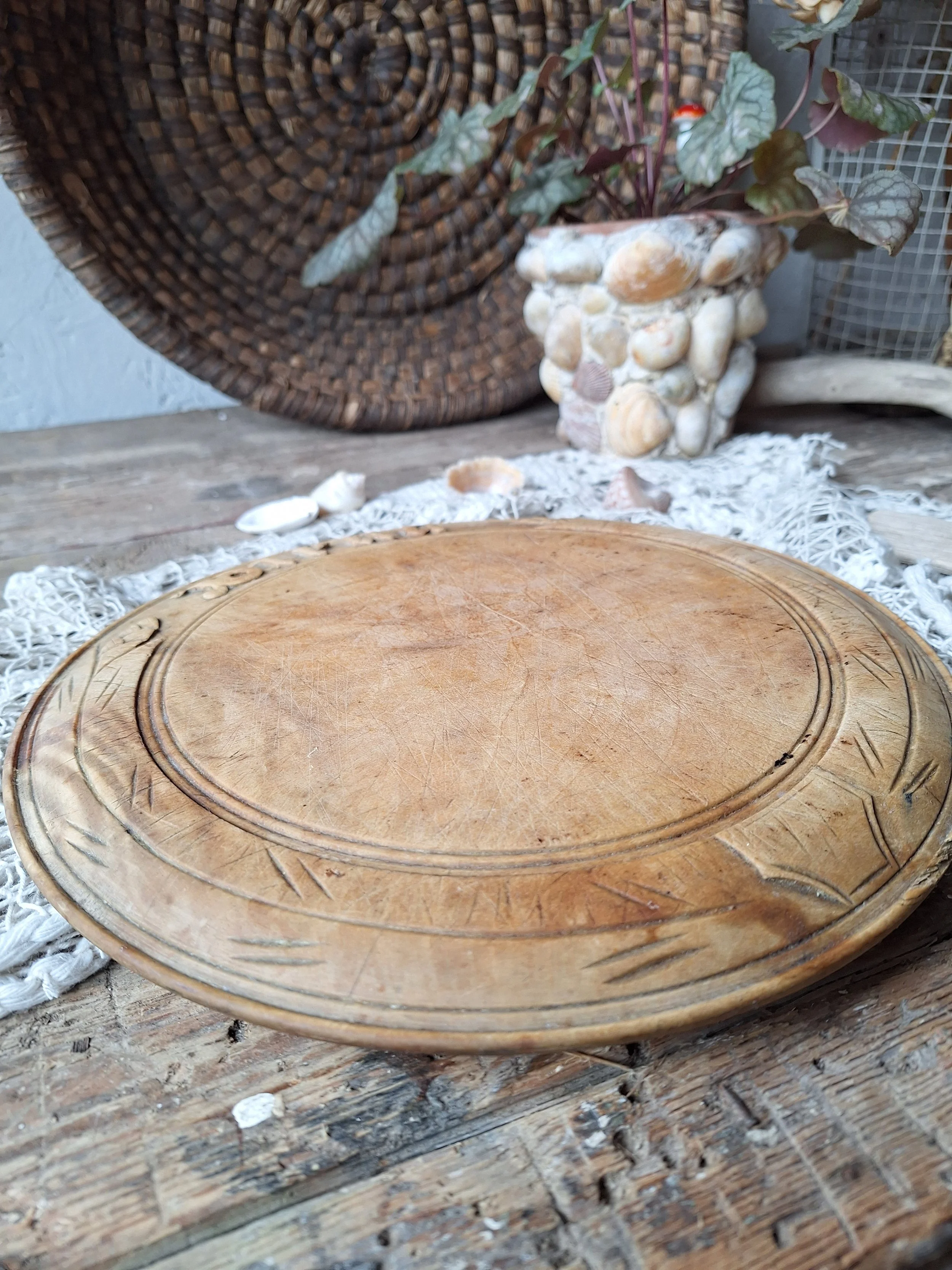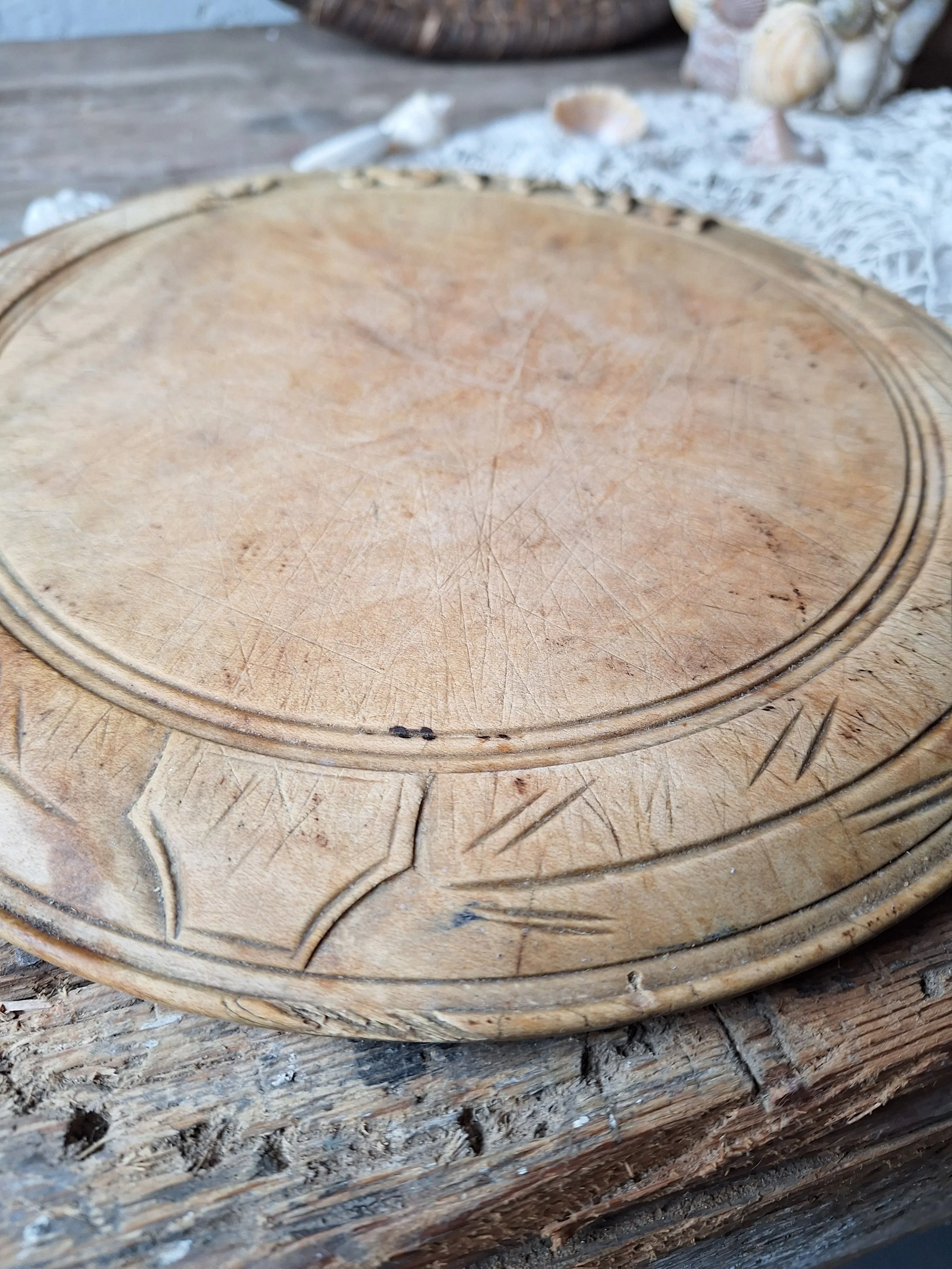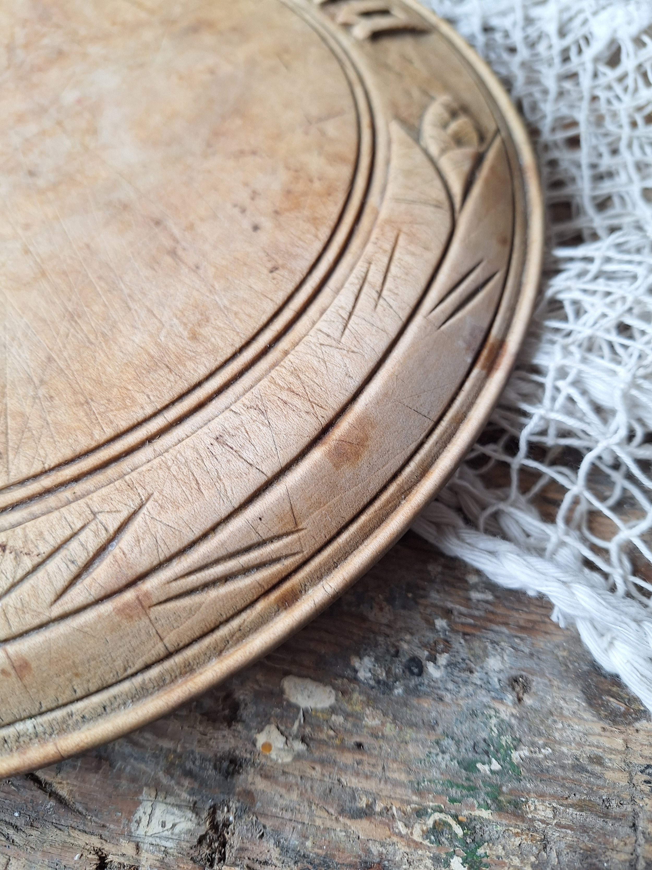 Lovely decorative wooden breadboard with ‘bread’ at the top and wheat design. This has a small chip to the wood, some stains and of course cut marks across it. It would have been used in the kitchen for carving bread on. The size is approx. 24.6cm across and depth is 2cm.