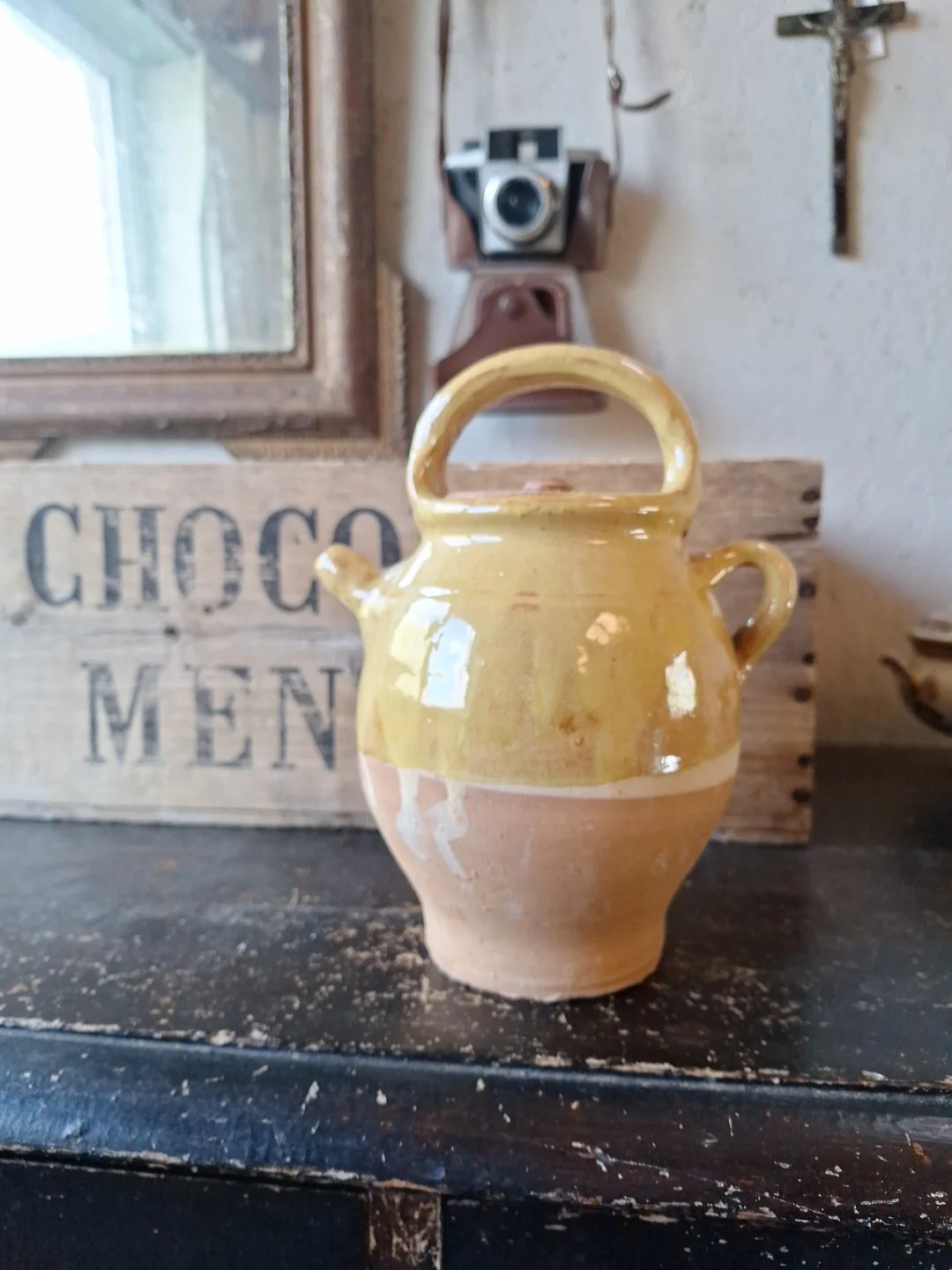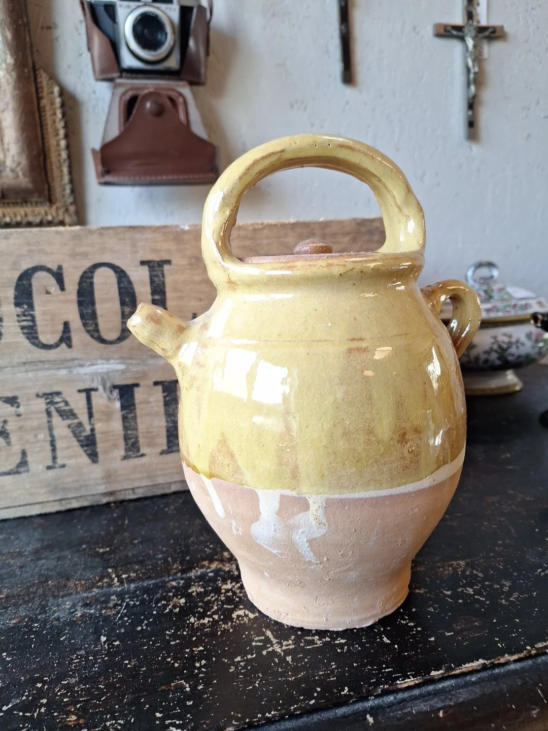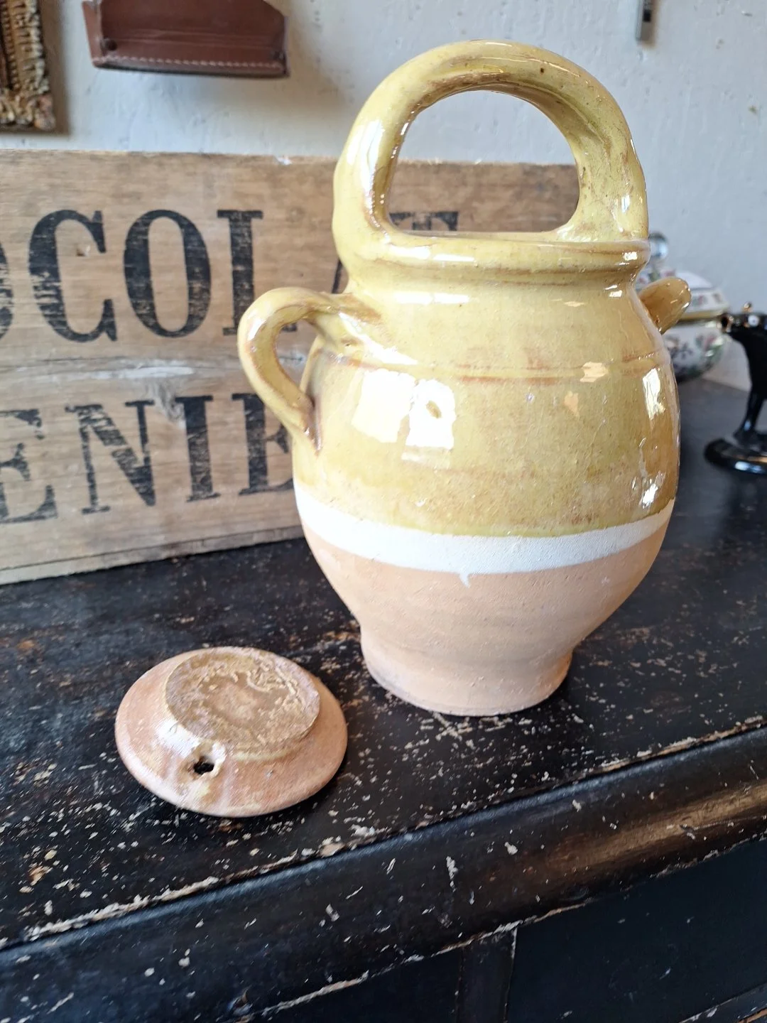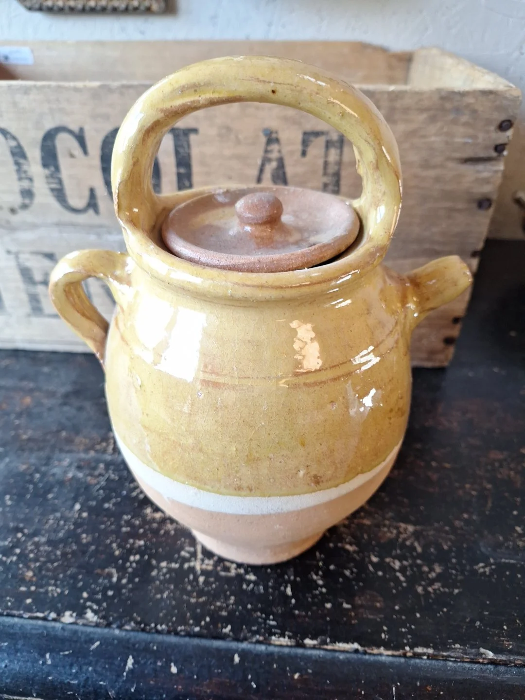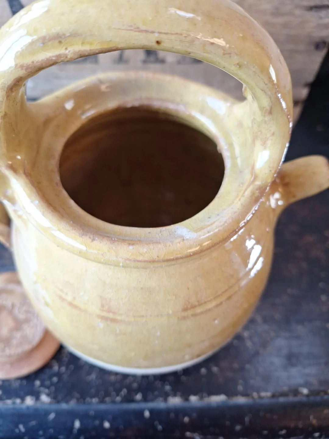Lovely yellow glazed pot from France. Not old. Height 21cm. Width 17cm. Good condition.