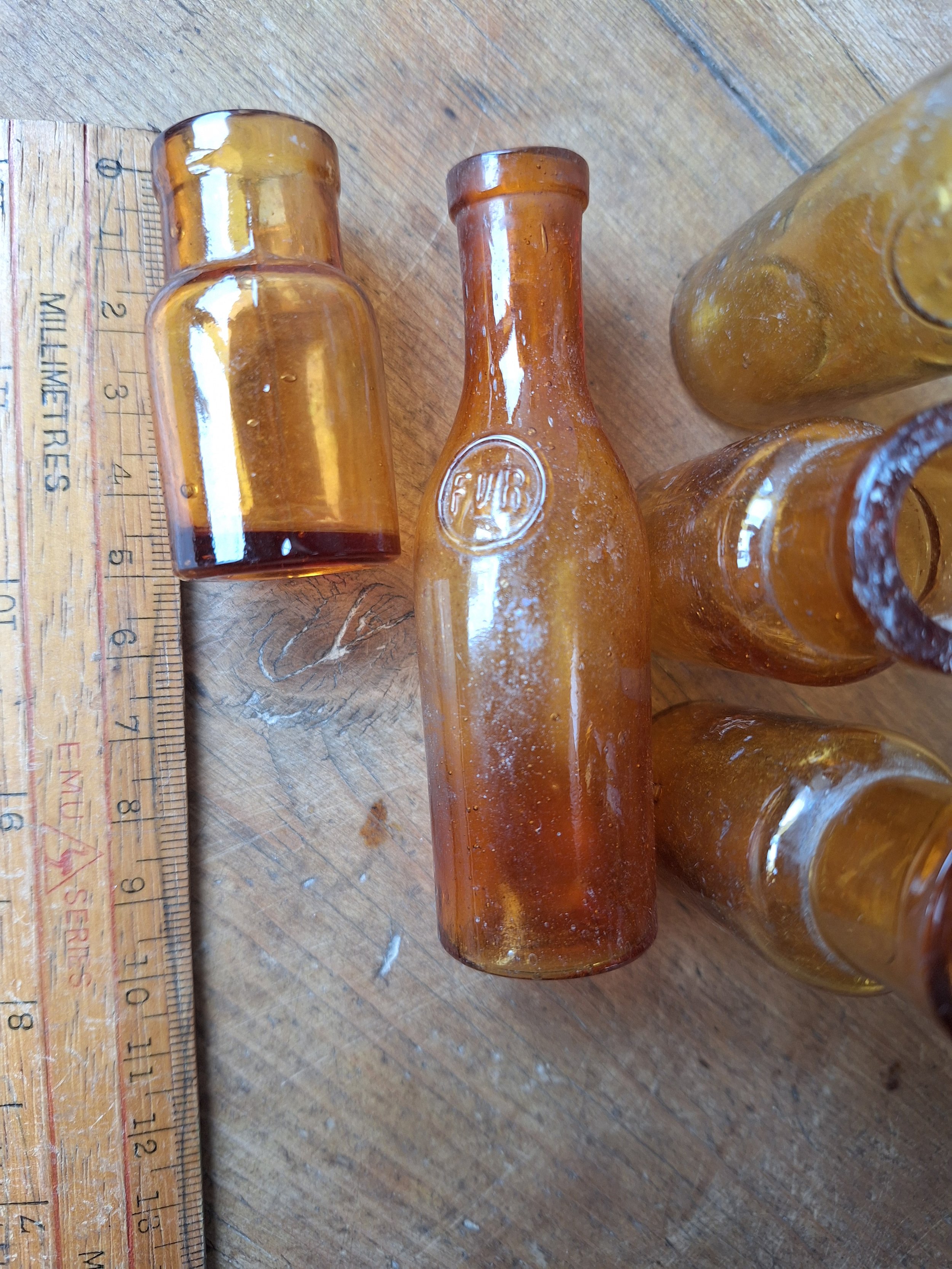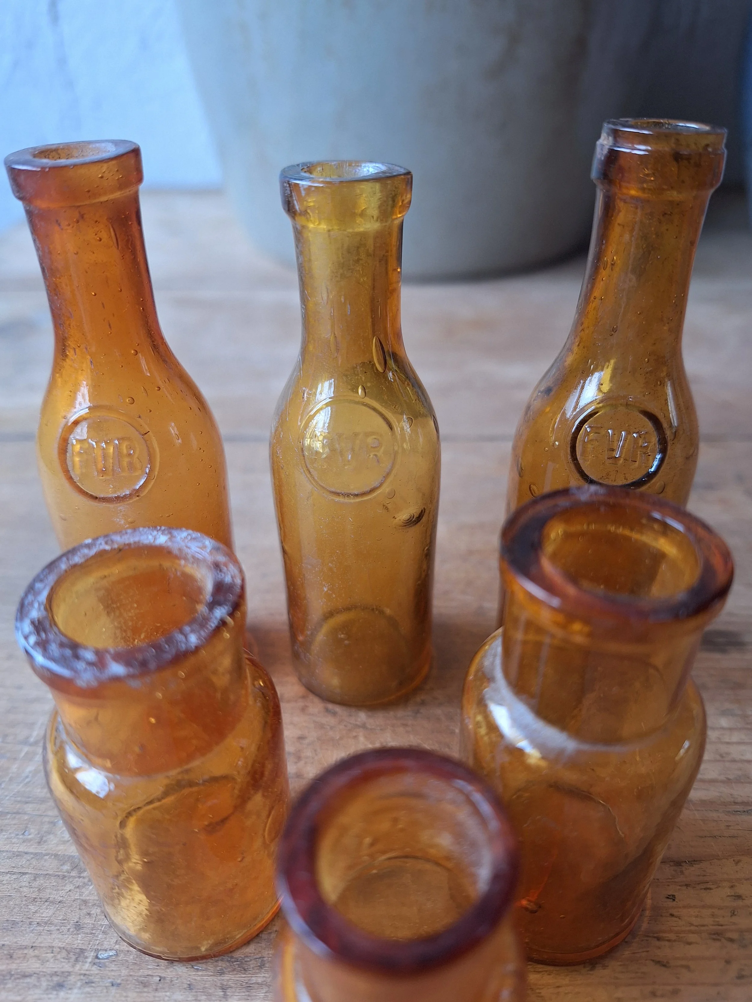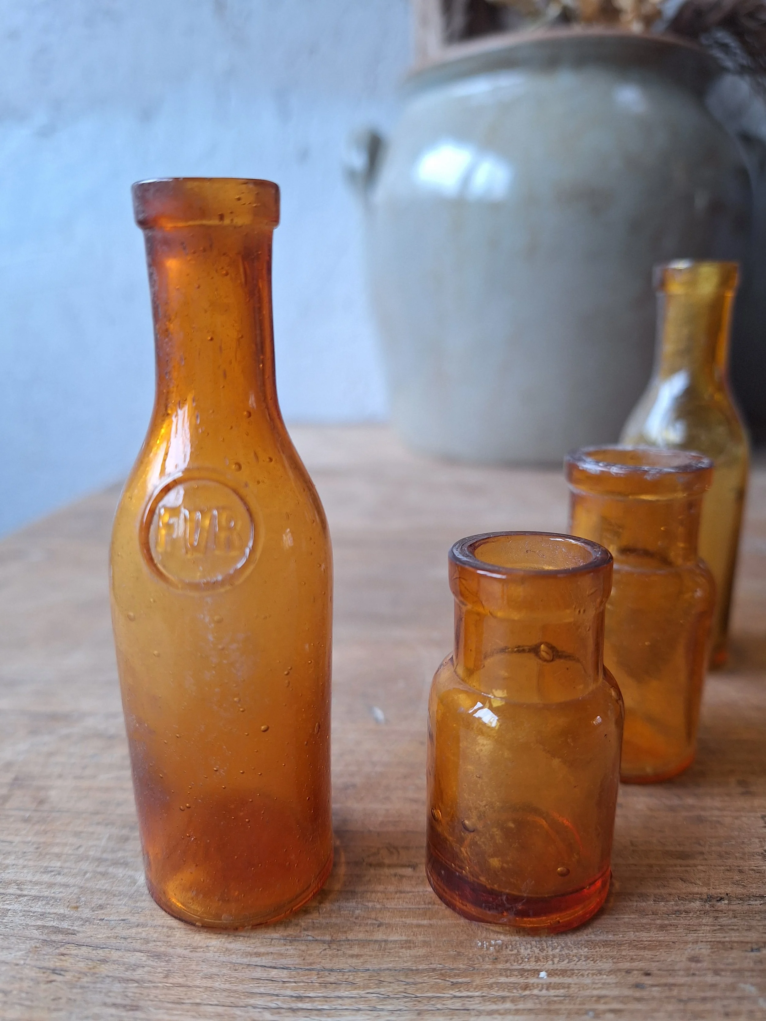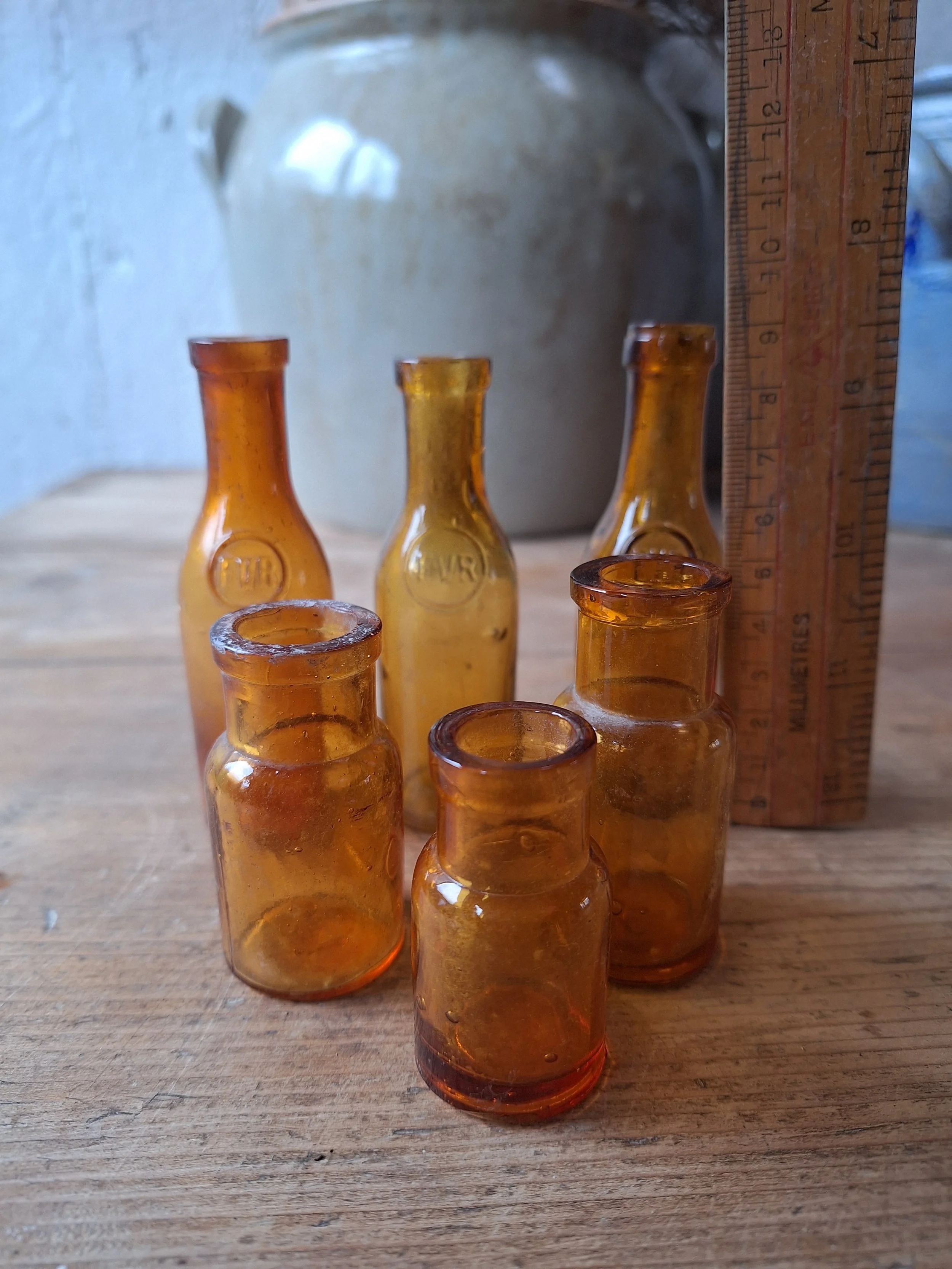 Lovely collection of vintage French amber orange coloured glass bottles. The tallest is 9cm and the smallest 4.5cm.