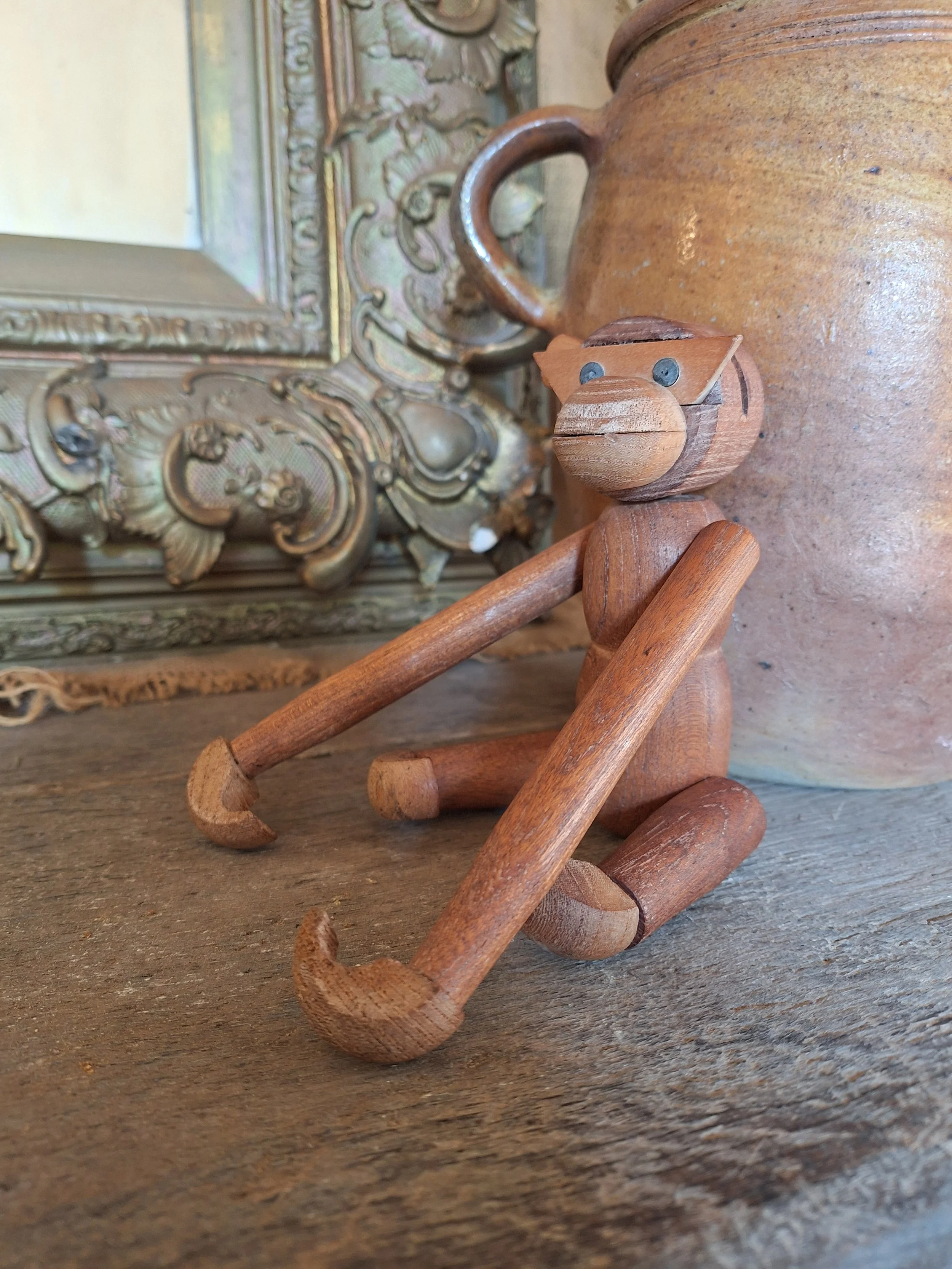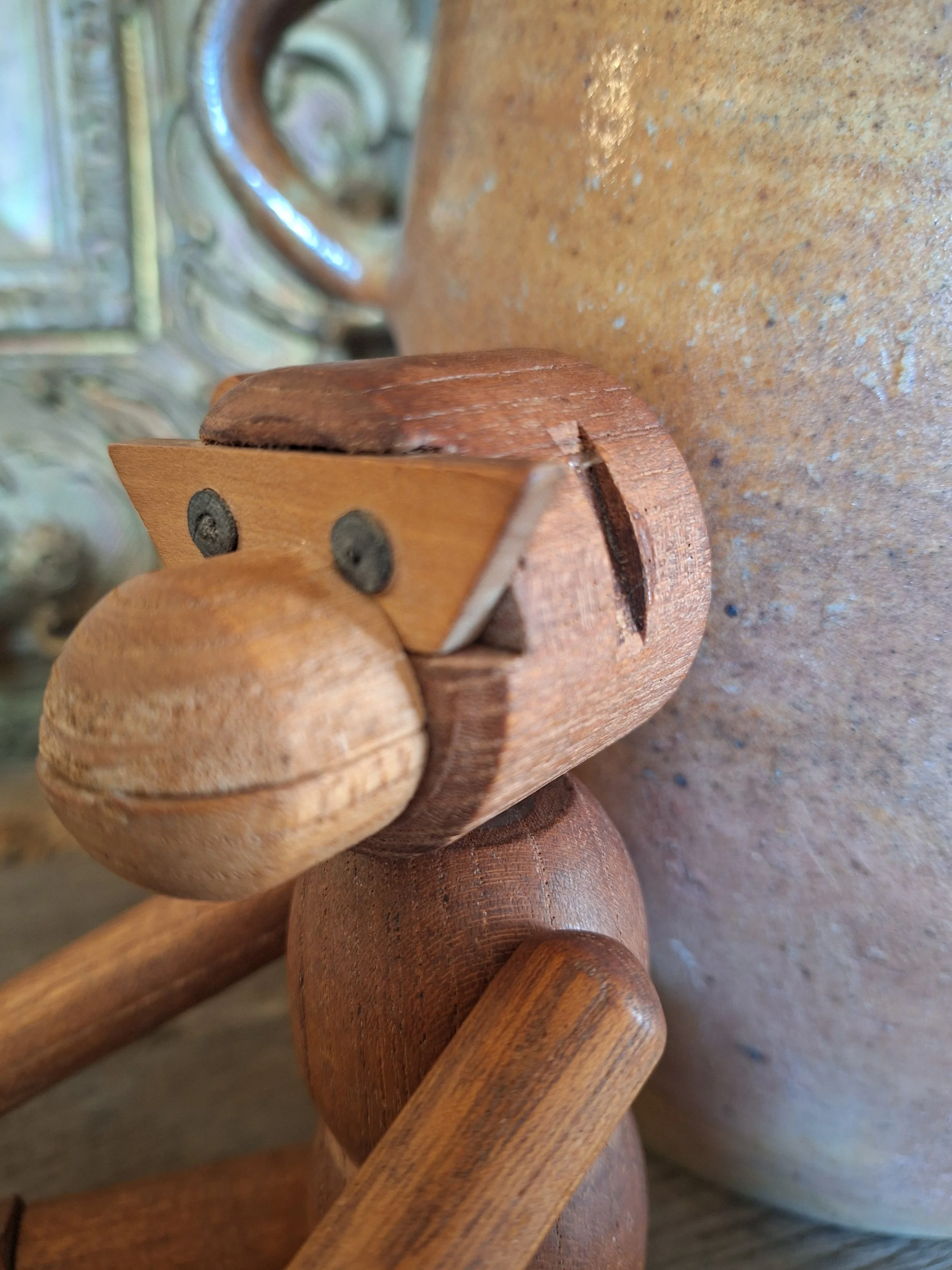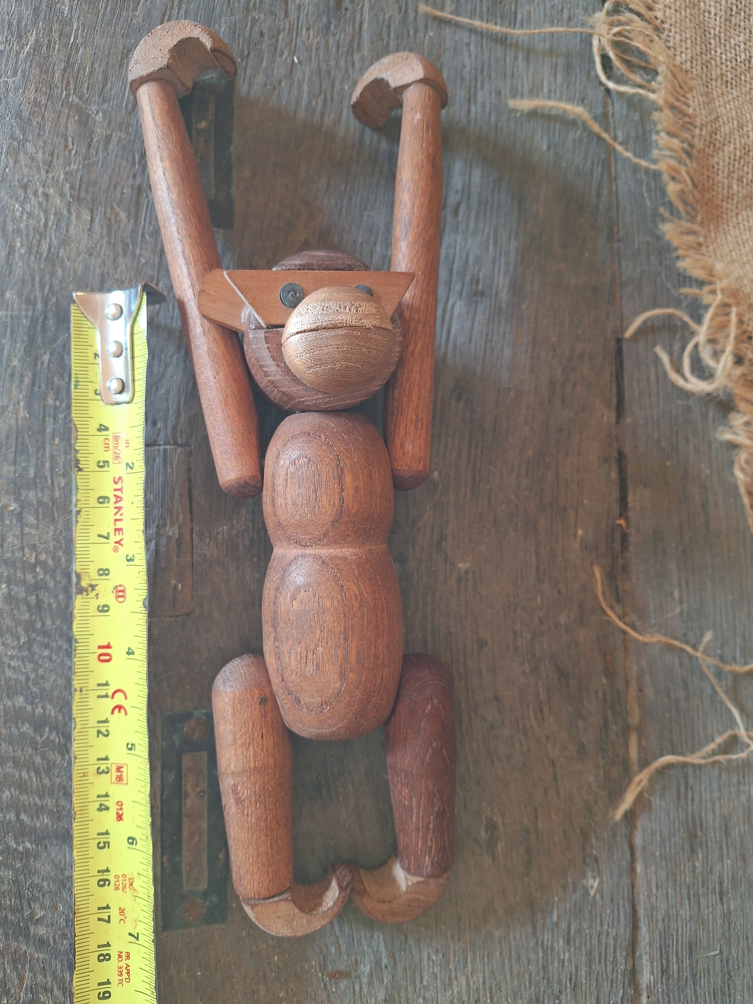 Sweet wooden monkey found on a recent trip to France. Lovely little chap with moveable arms and legs. Missing an ear. This could be replaced. No markings but looks just like Bojesen. Danish designer. Length just about 20cm.