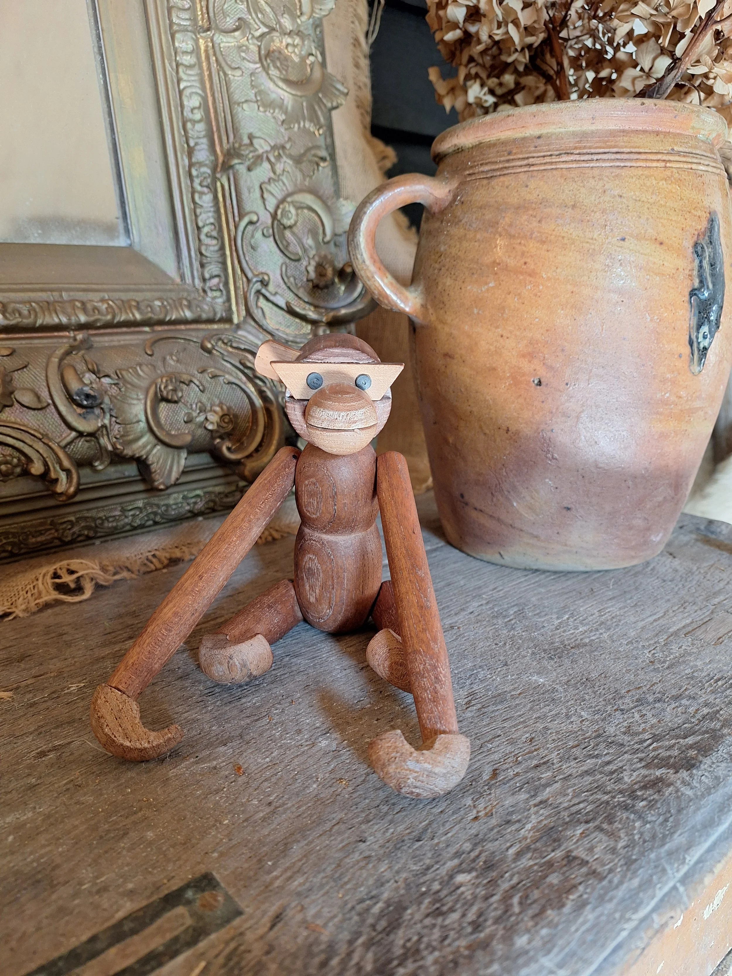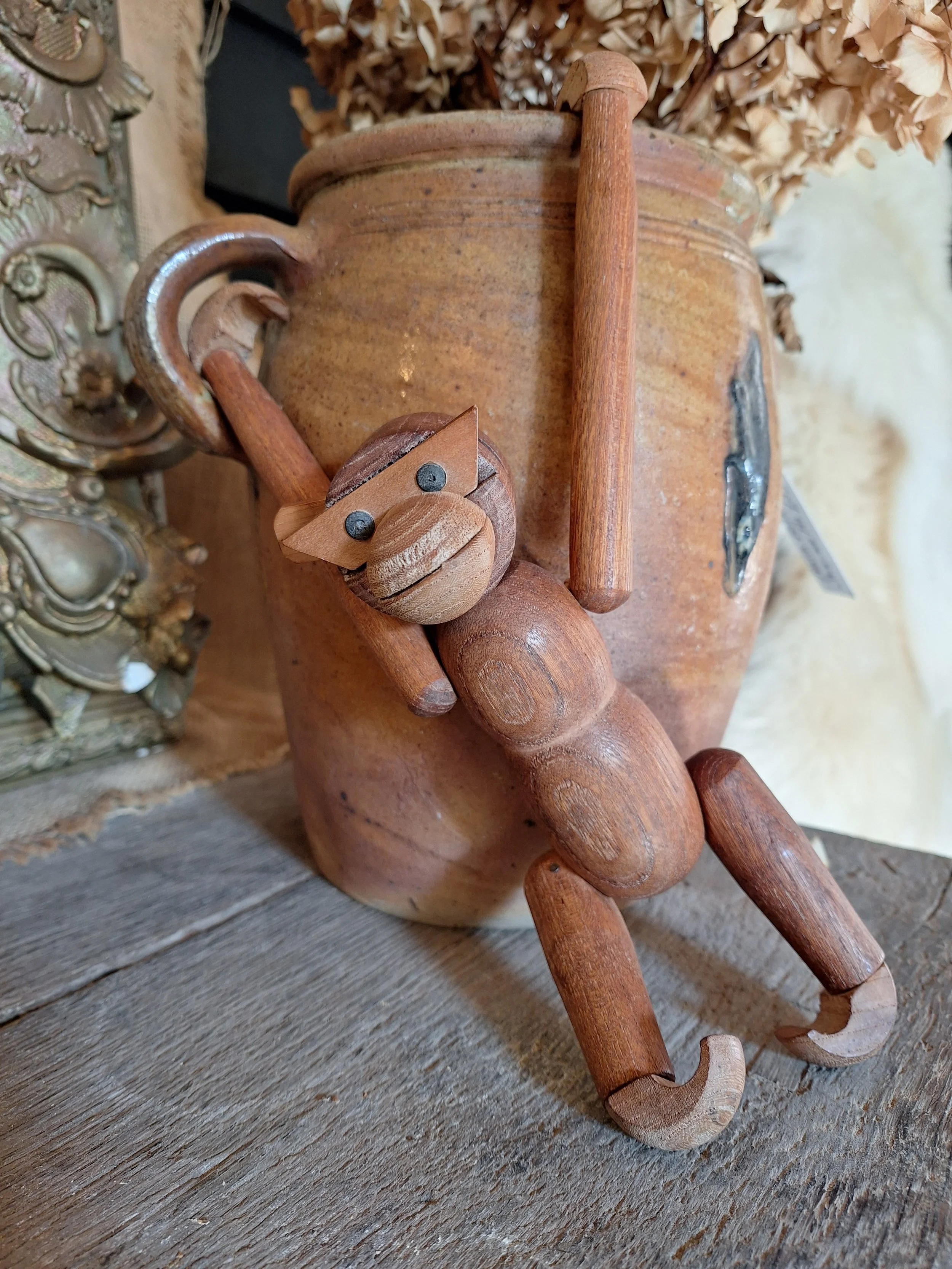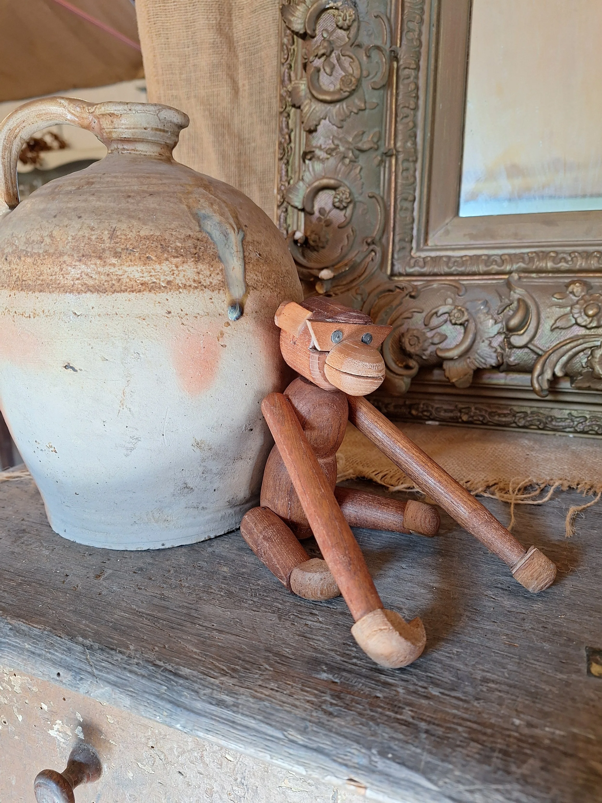 Sweet wooden monkey found on a recent trip to France. Lovely little chap with moveable arms and legs. Missing an ear. This could be replaced. No markings but looks just like Bojesen. Danish designer. Length just about 20cm.