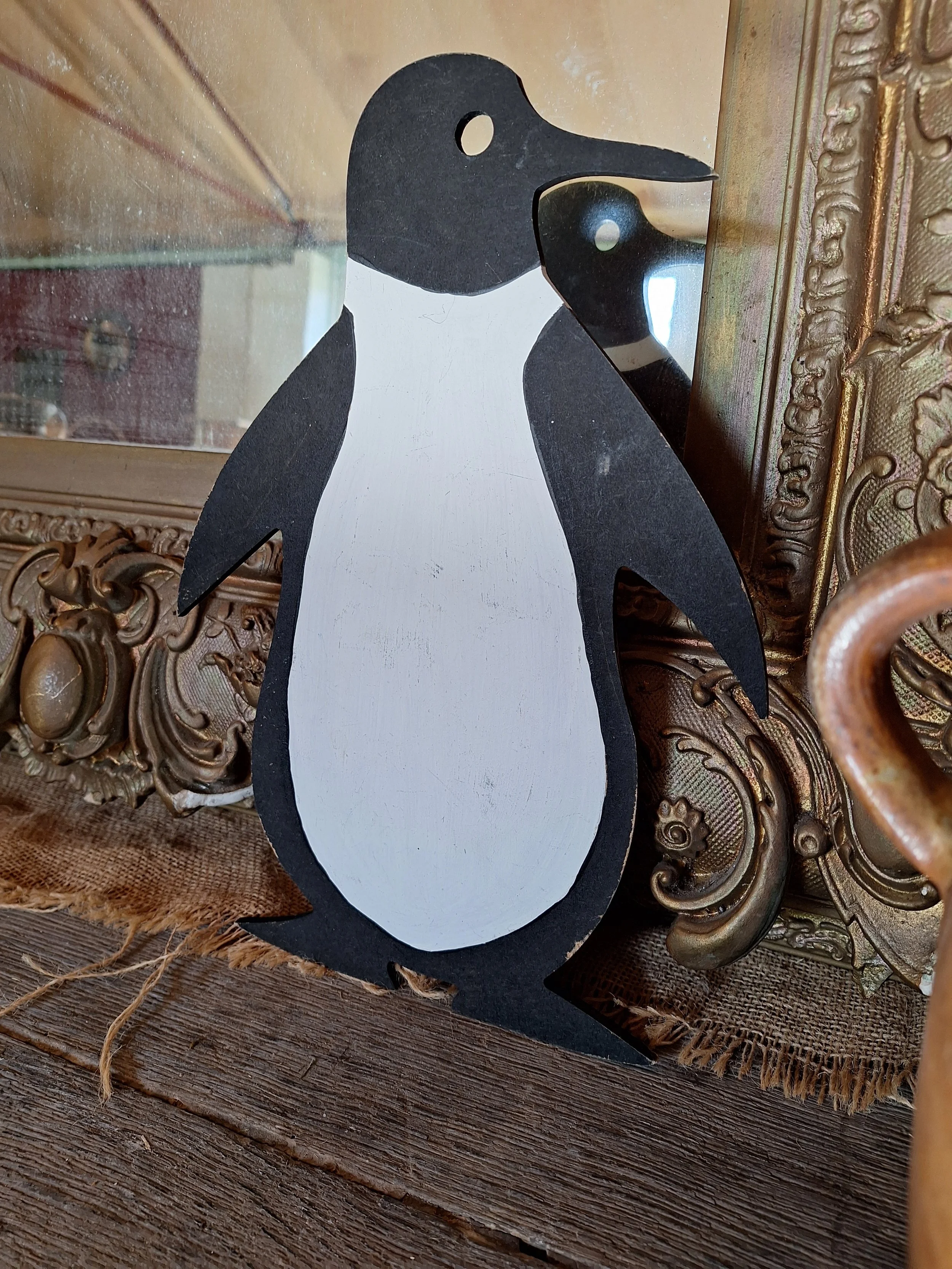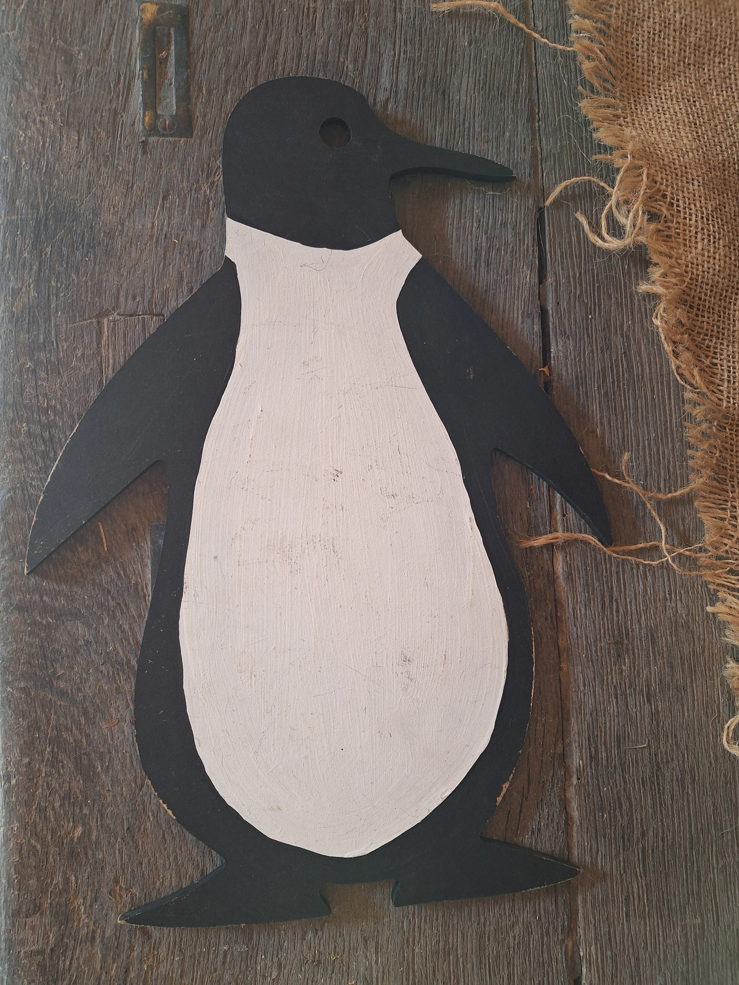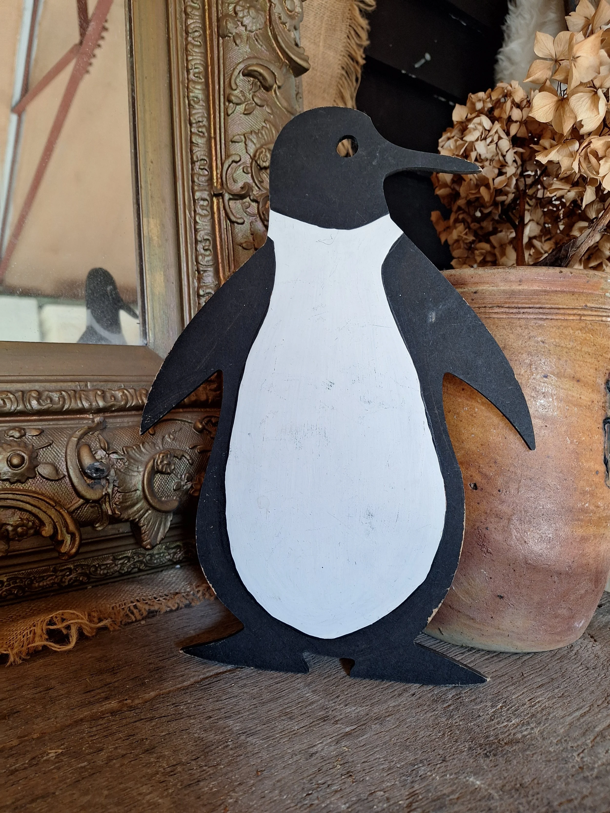Found in France, this simple yet characterful penguin is painted in matt black and white, on a thing plywood type material. He stands 31.2cm tall.