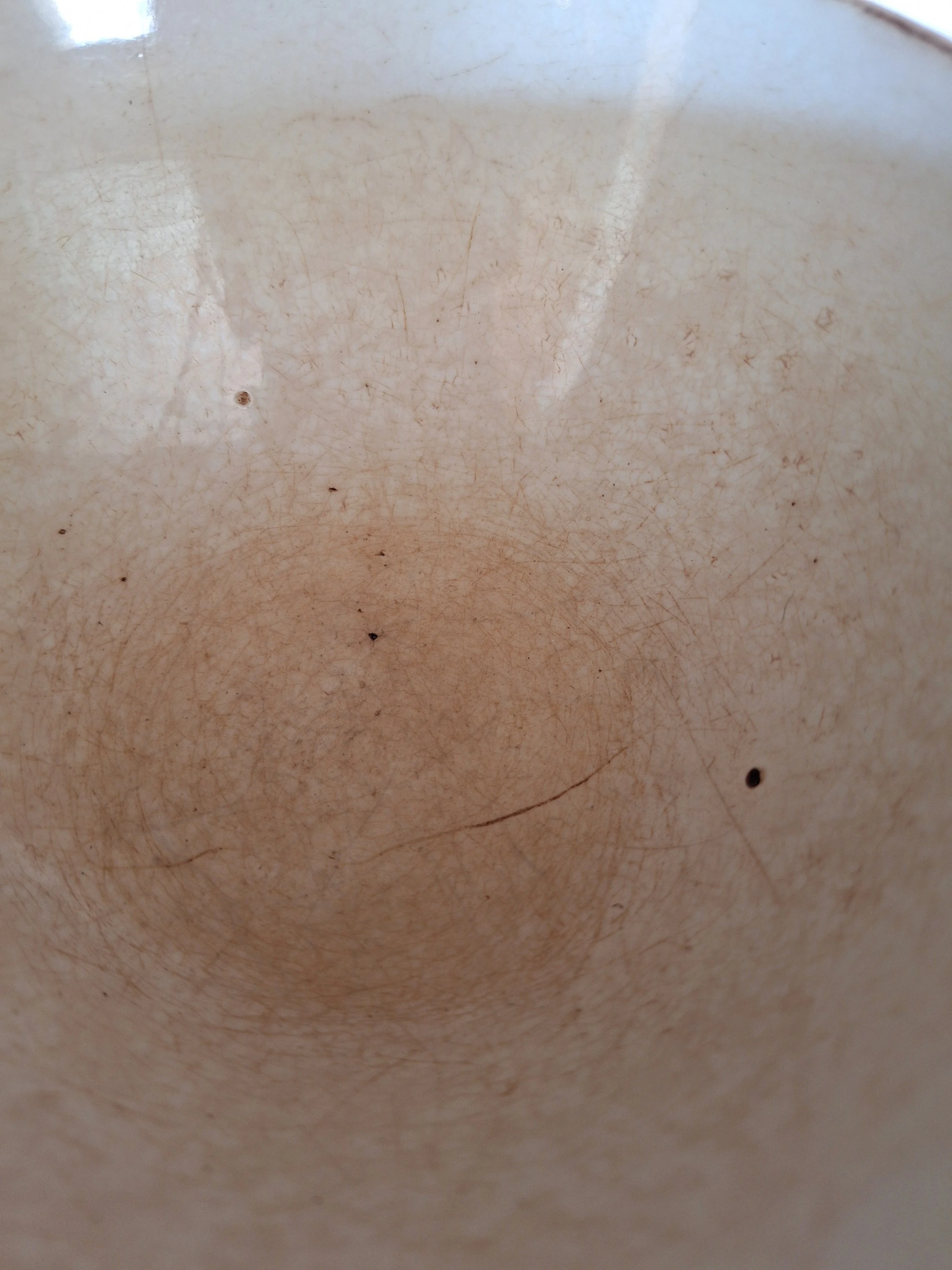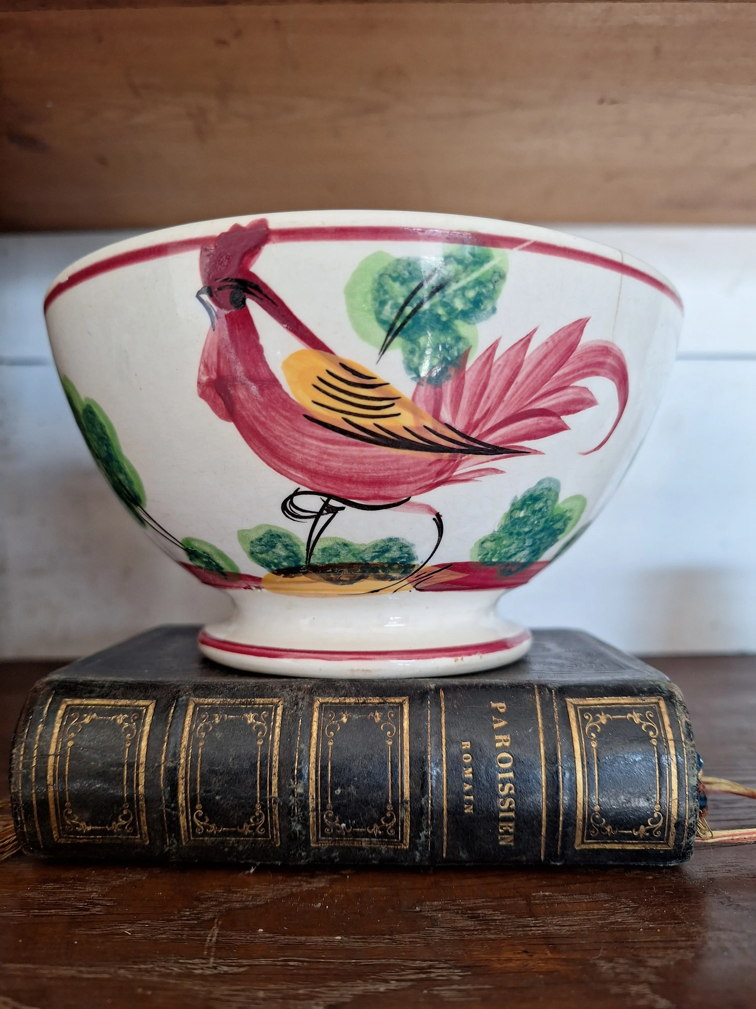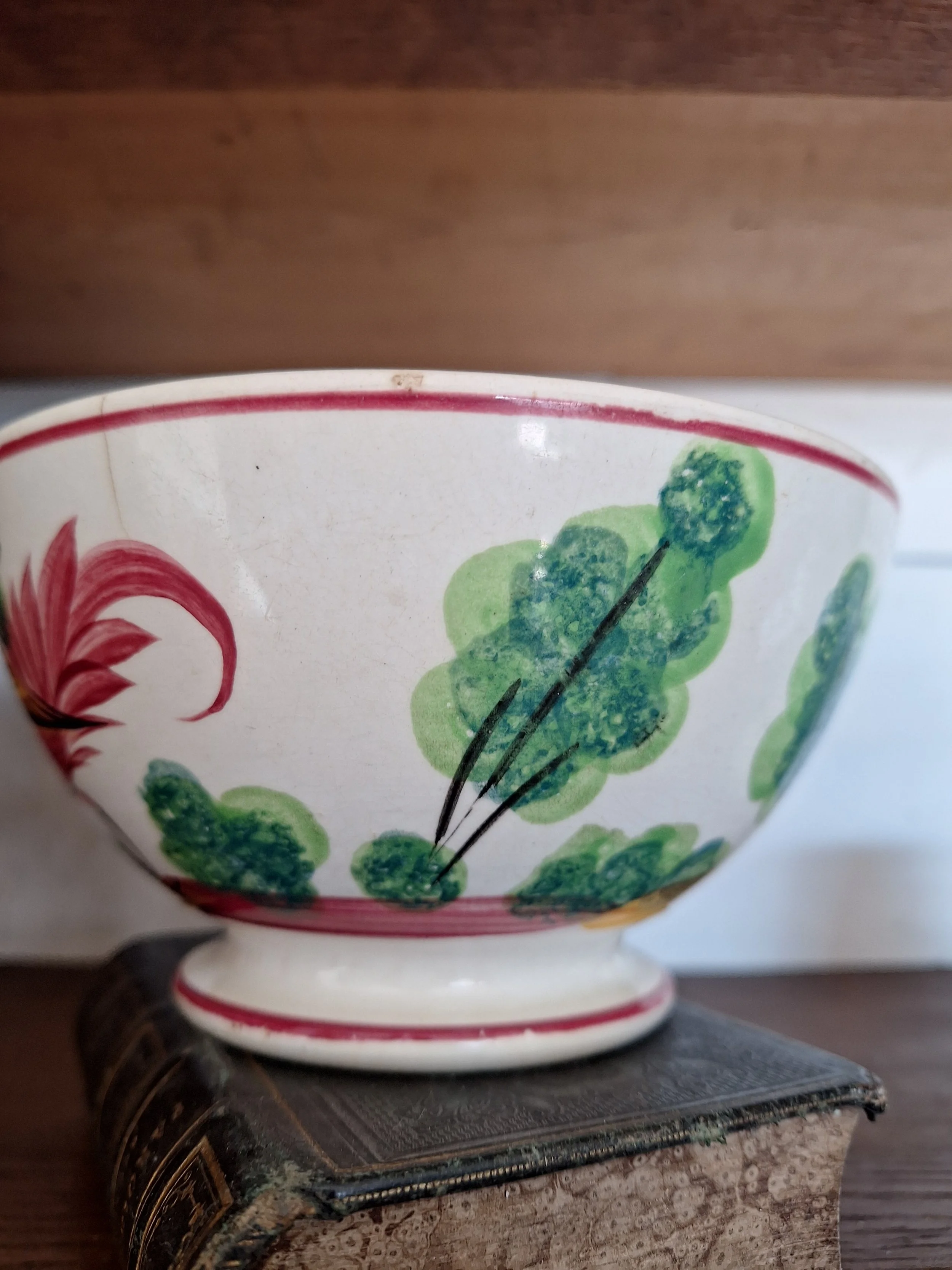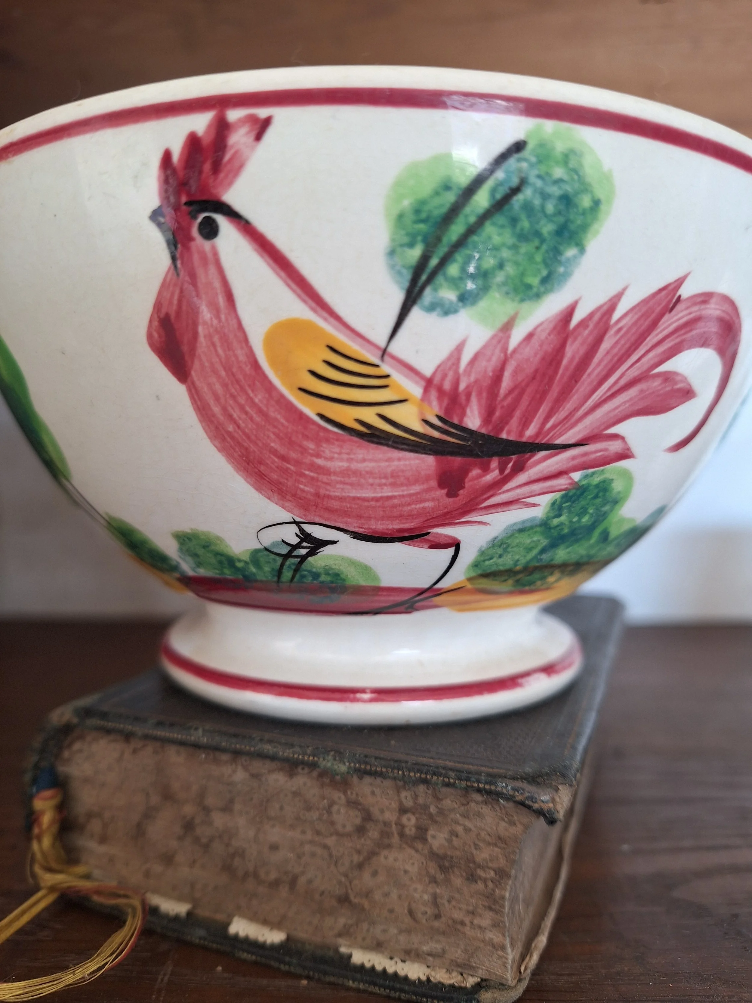 Lovely hand painted design of a rooster on both sides. This bowl is grazed and has discolouration and a hairline. Height 7.5cm diameter 14.5cm.