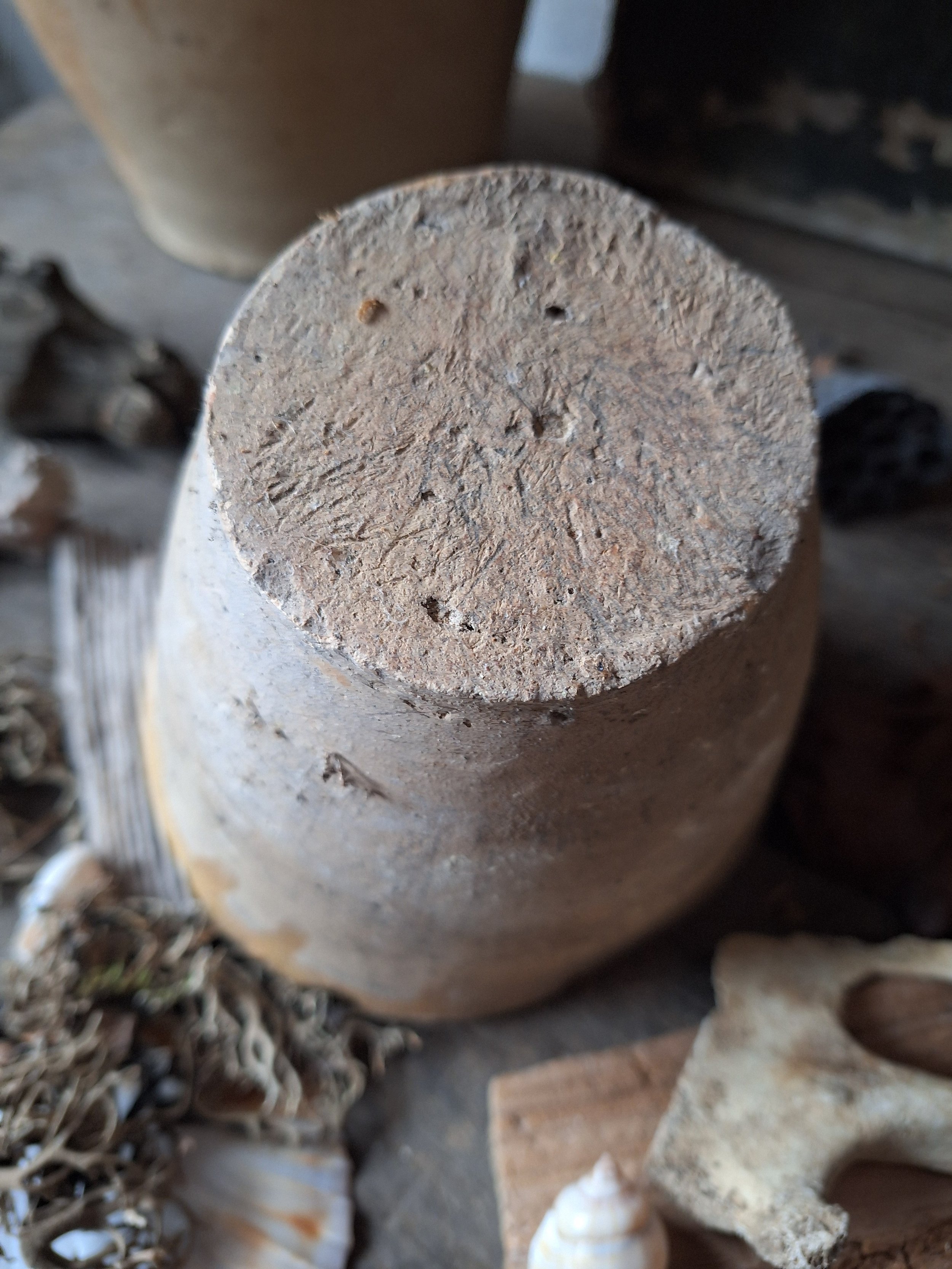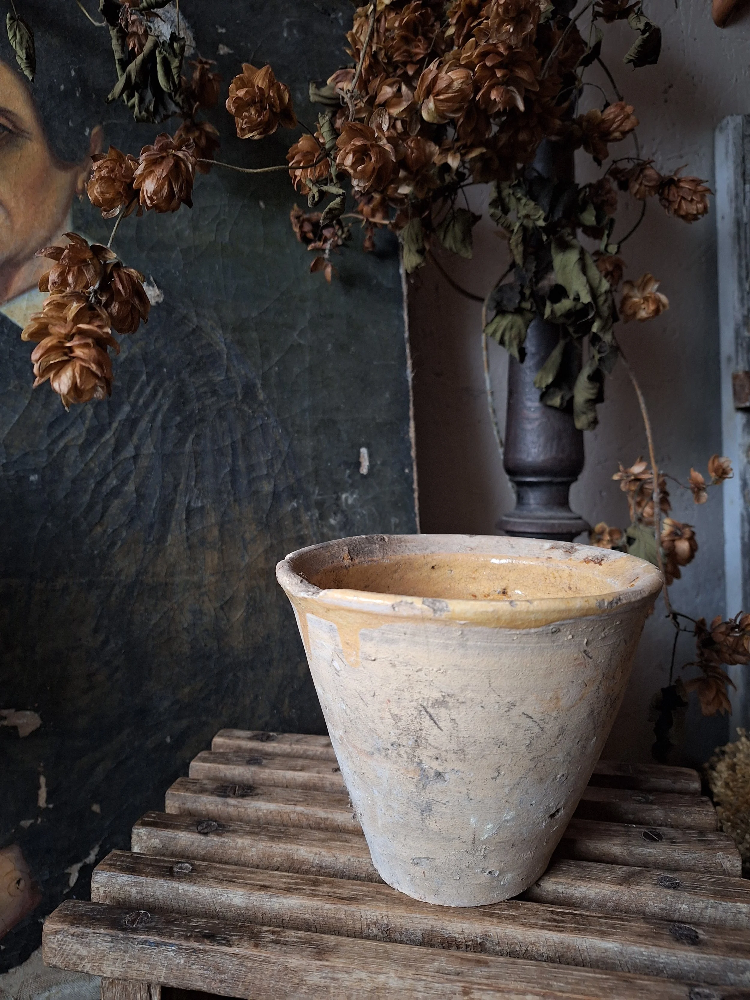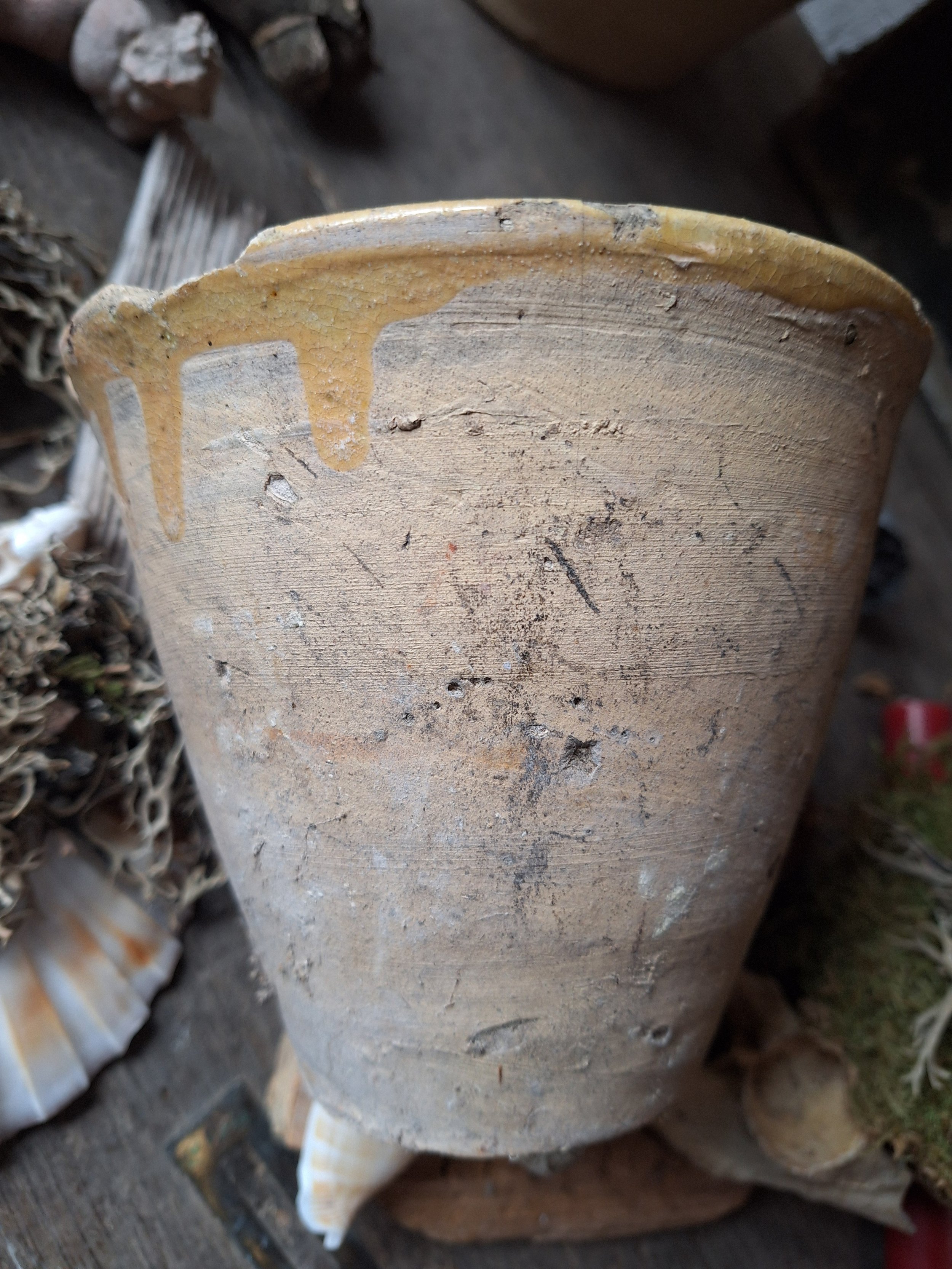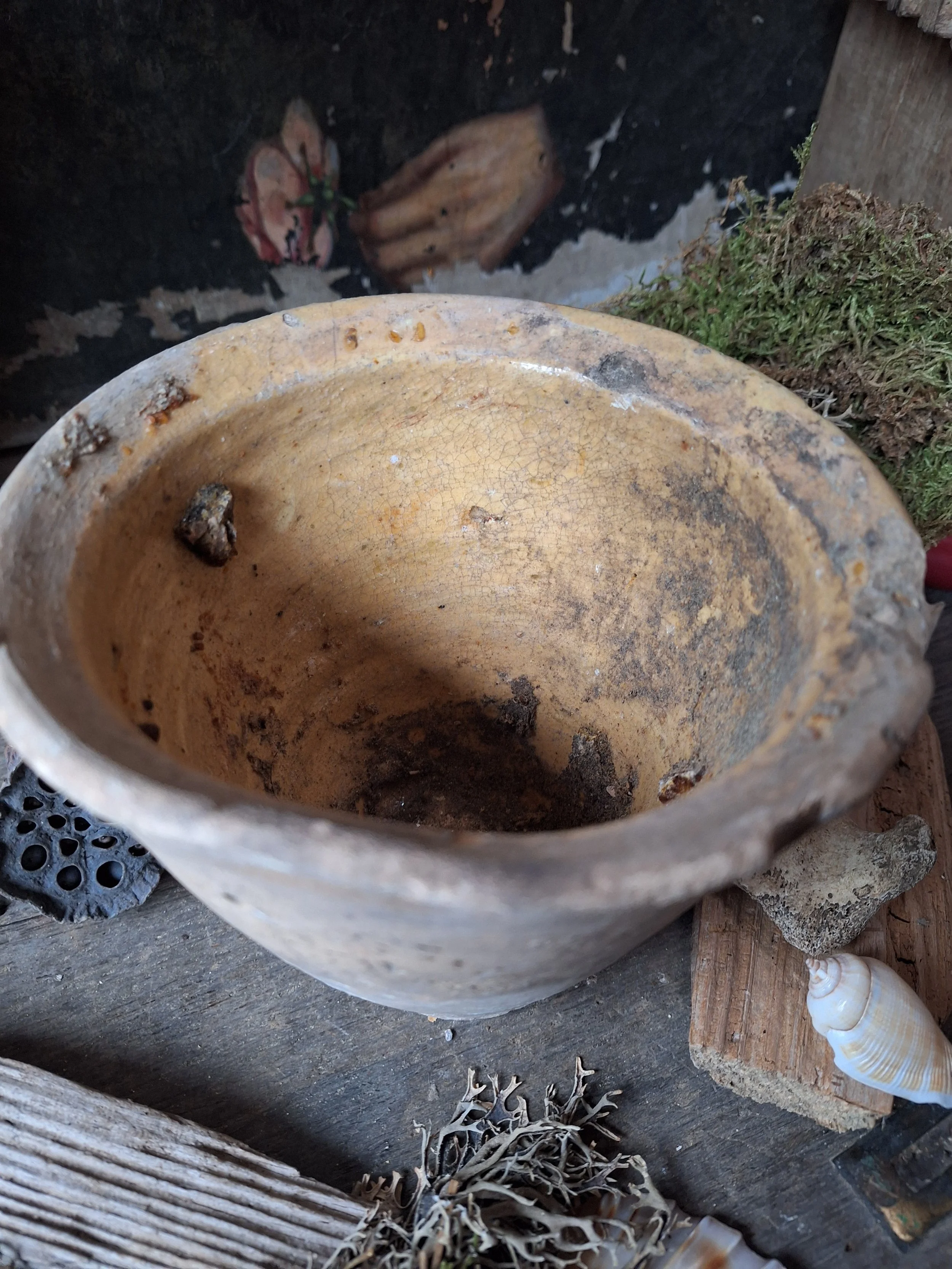Lovely sap pot, with light yellow glaze inside. Small chip to rim. Height 11.5cm.