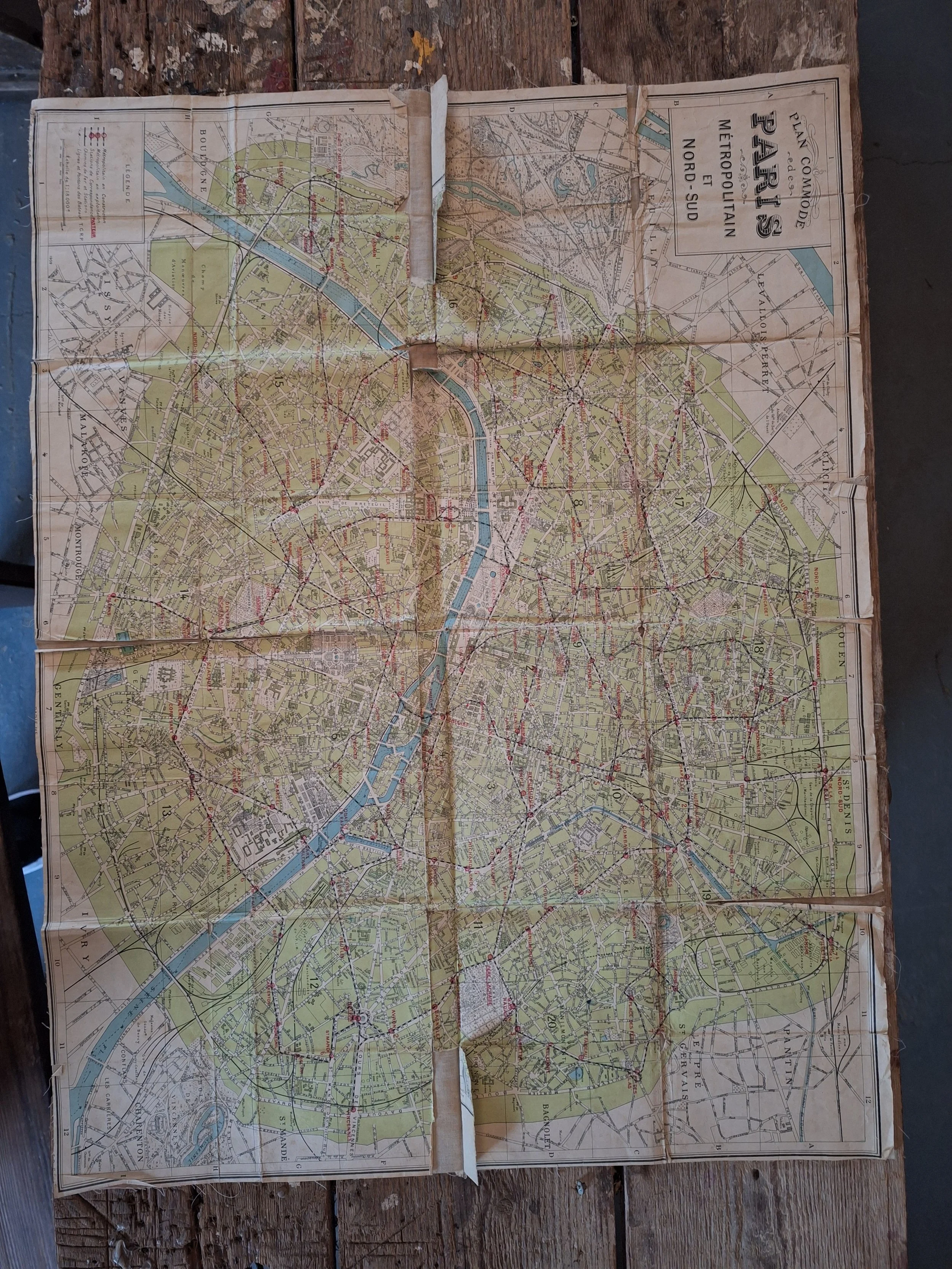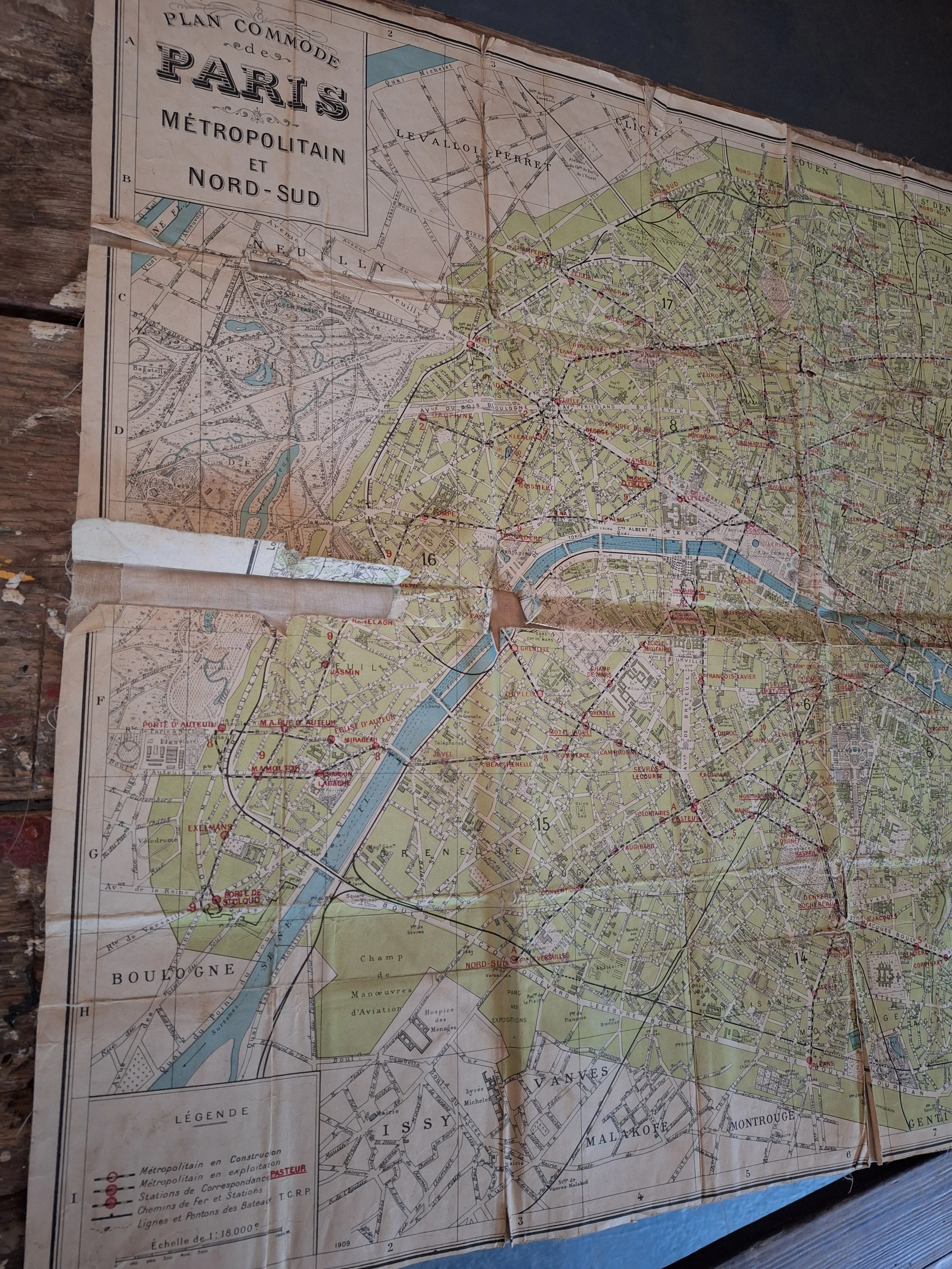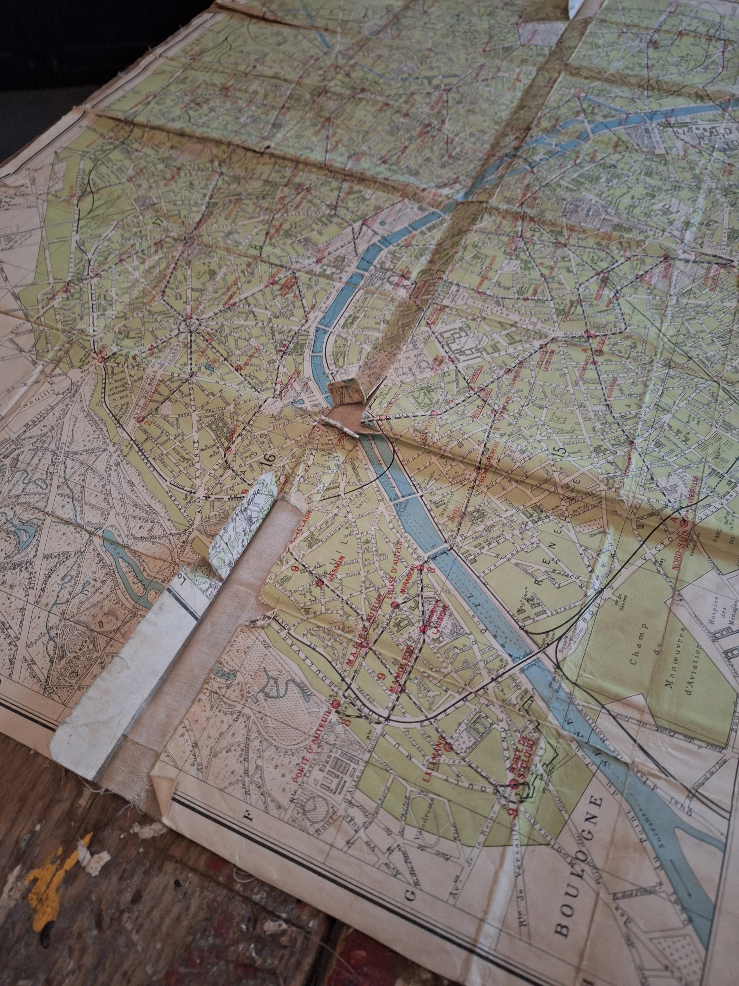 Lovely decorative folded map, on fabric. It is frail in places, you could fold down the raised parts and frame this nicely. Would look great mounted on the wall. Size approx. 68x52cm.