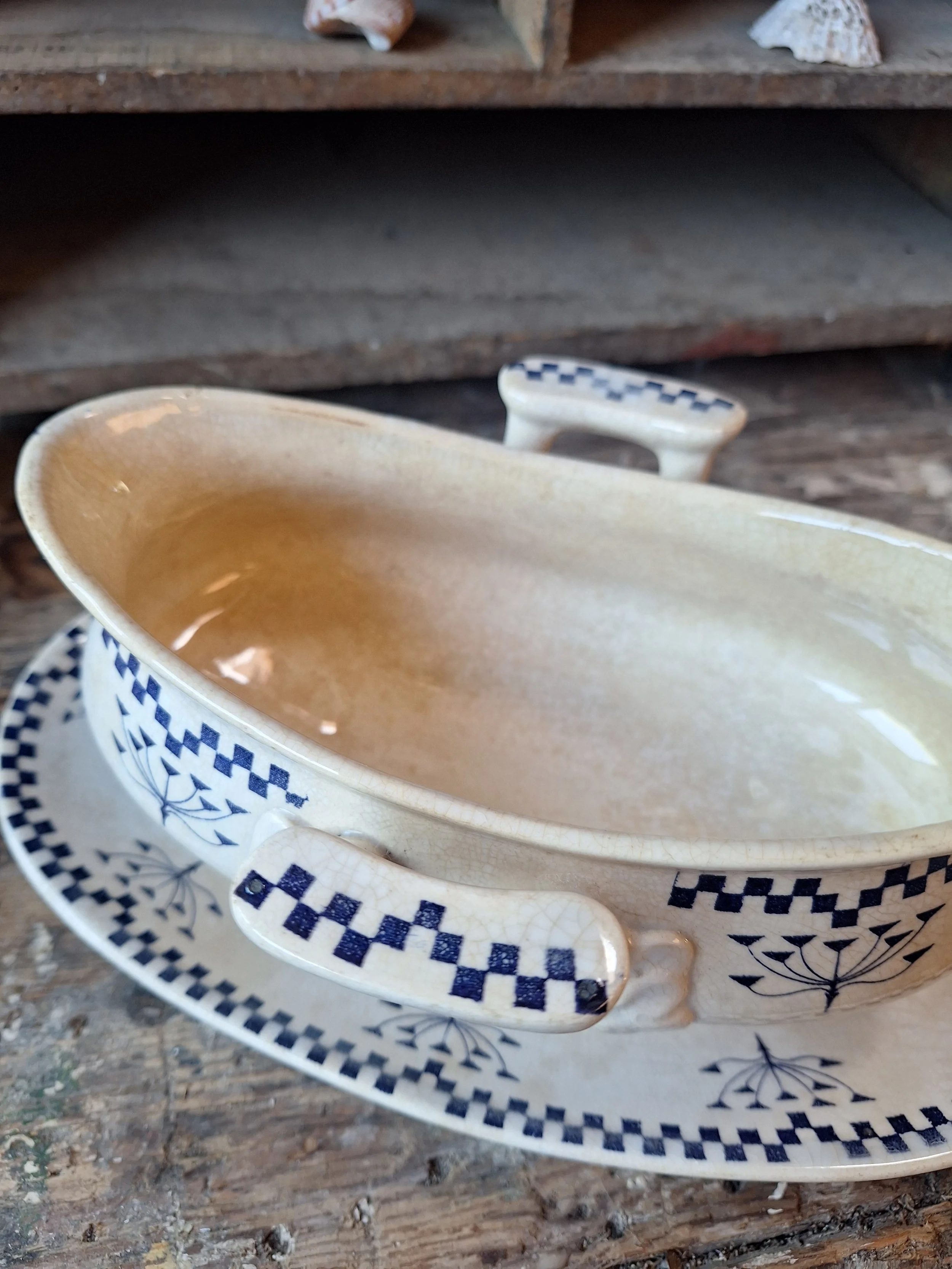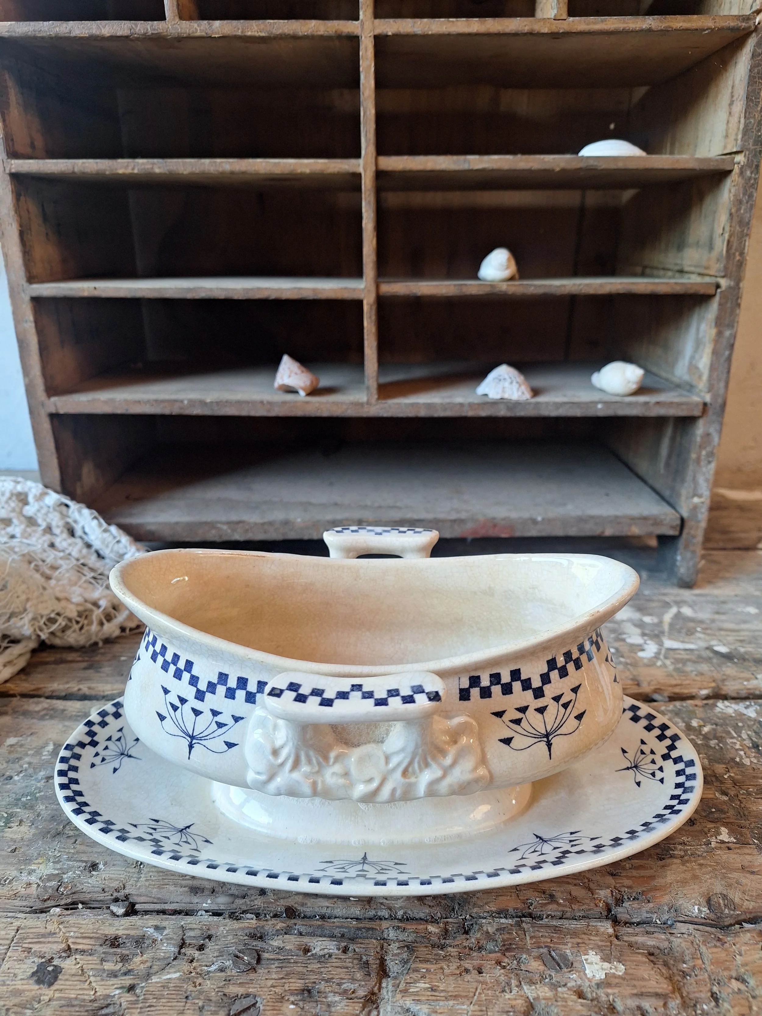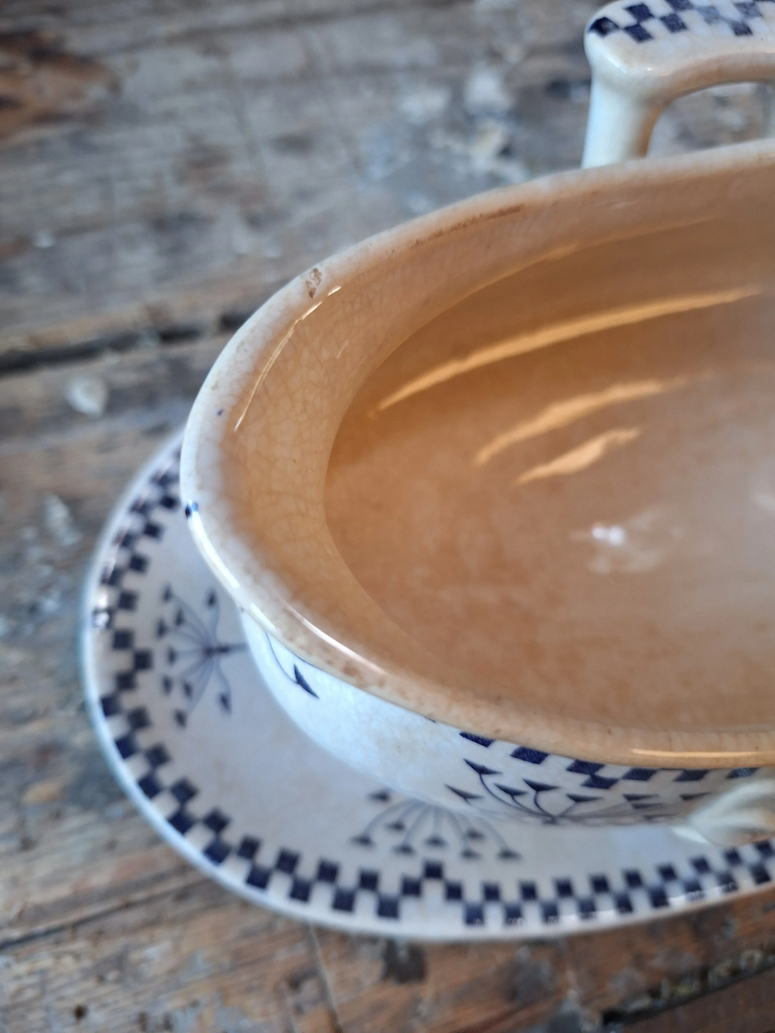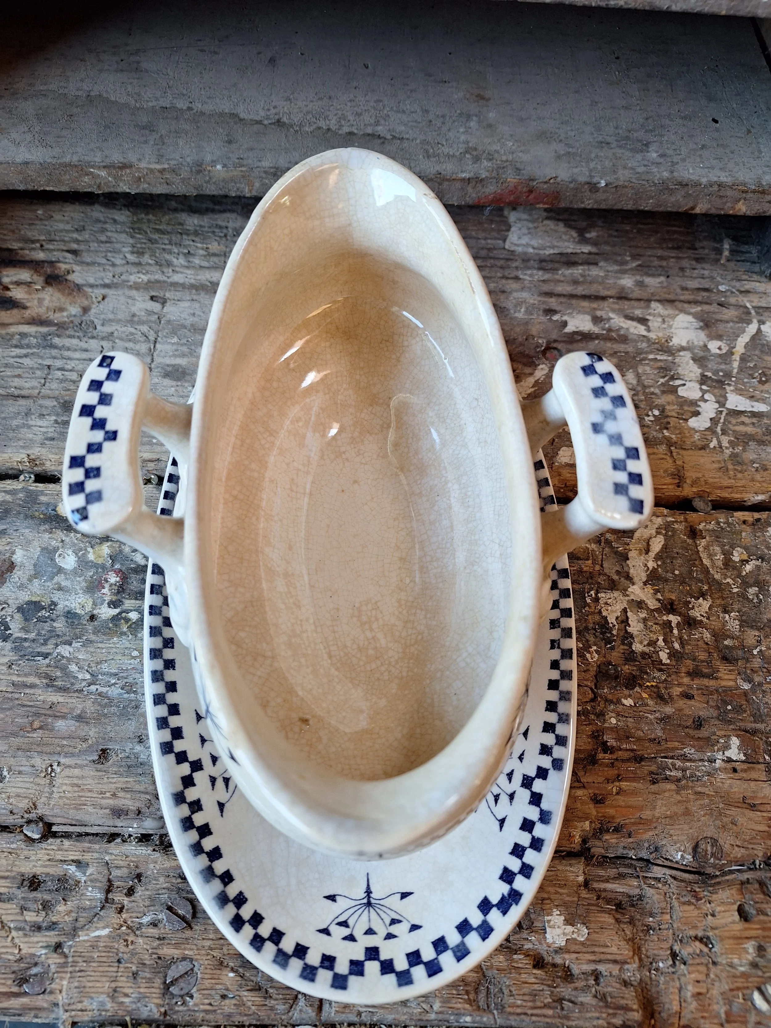 Vintage boat with discolouration and pattern. No chips. Length 14cm and height 10cm.