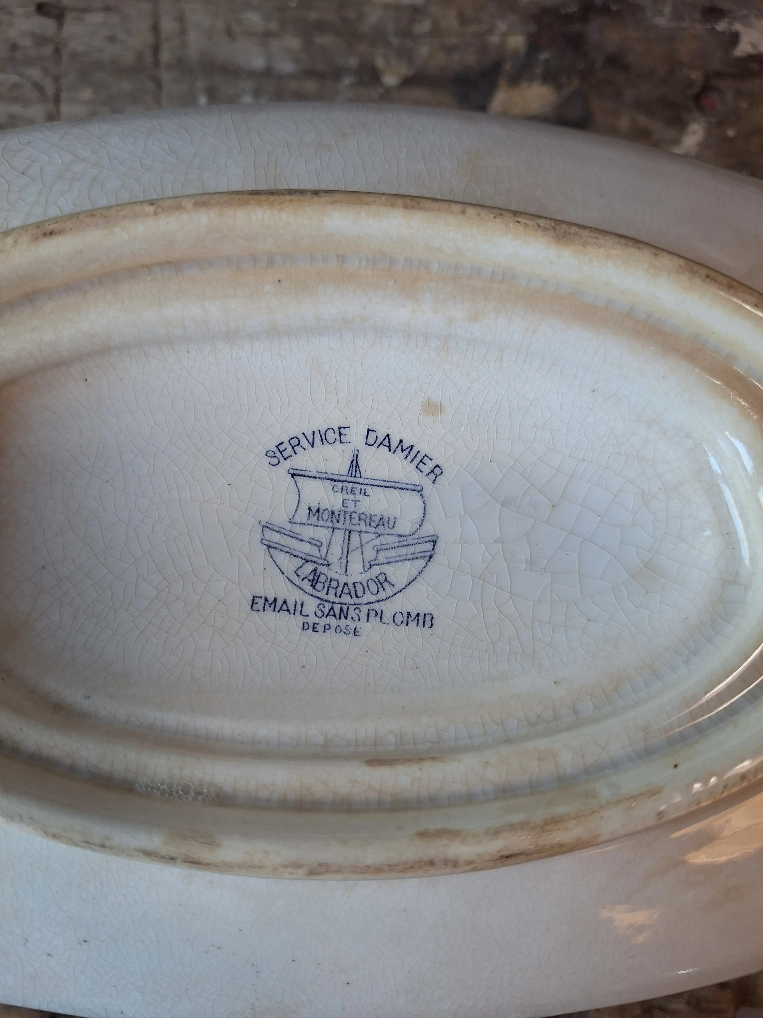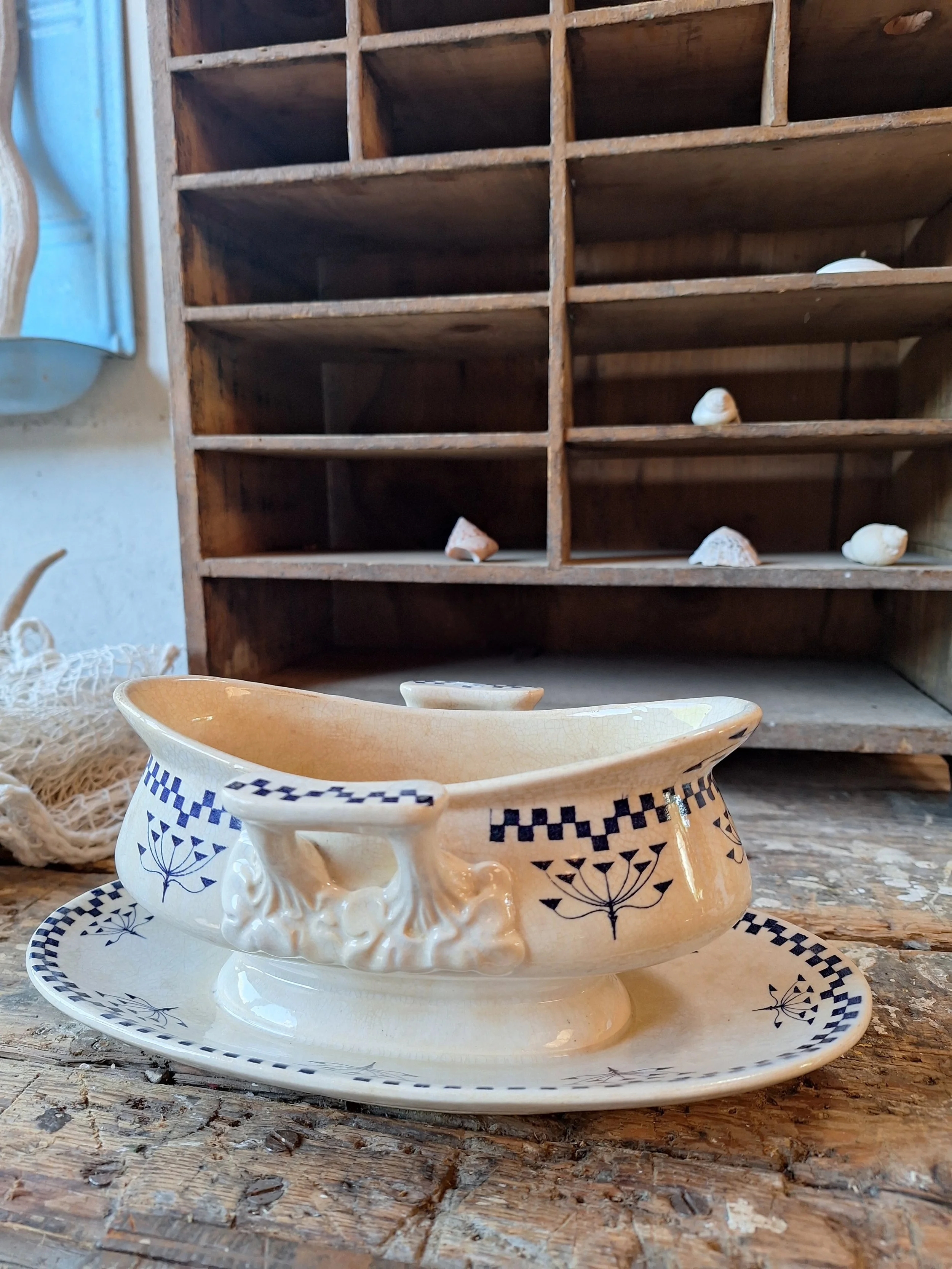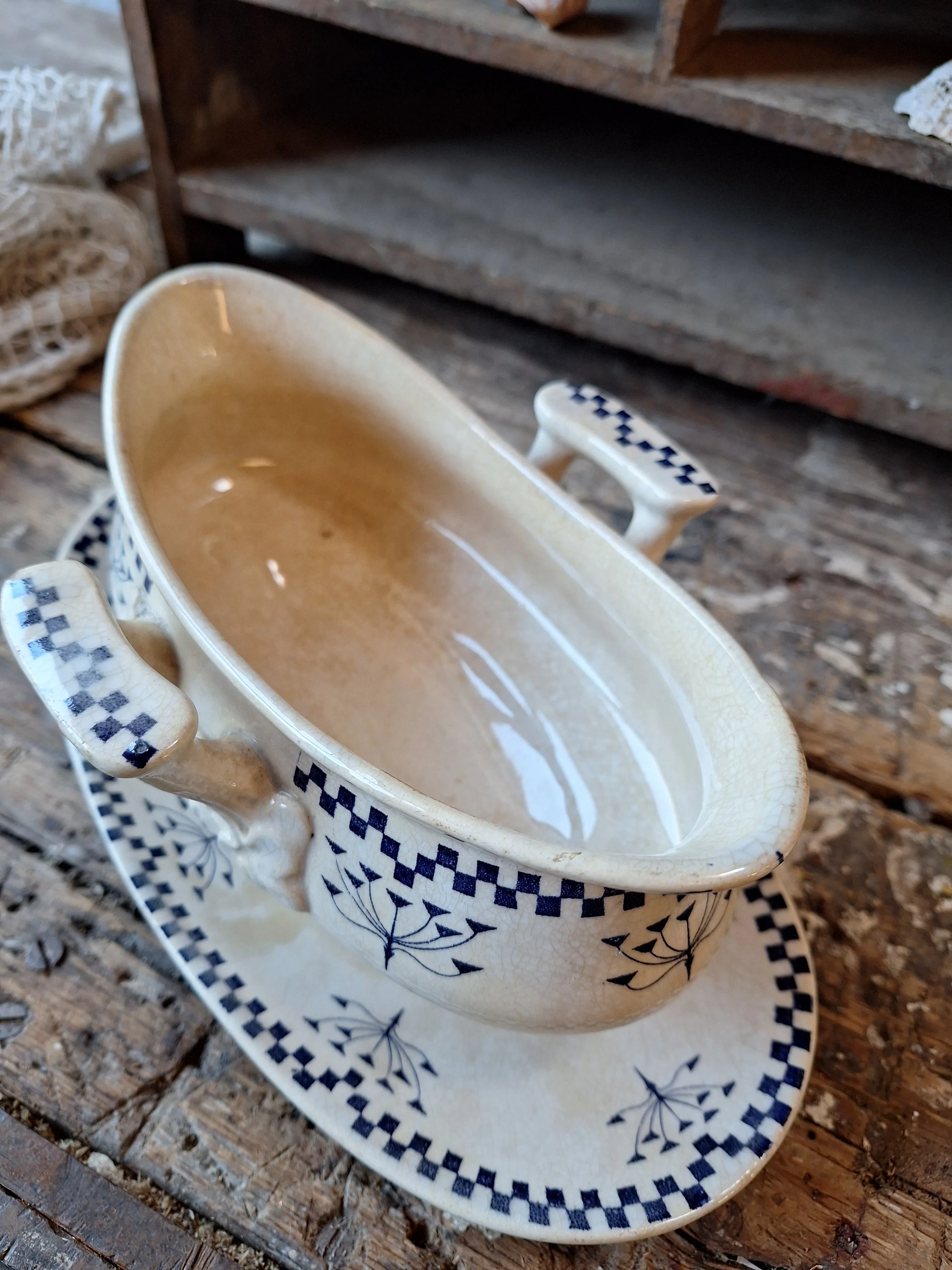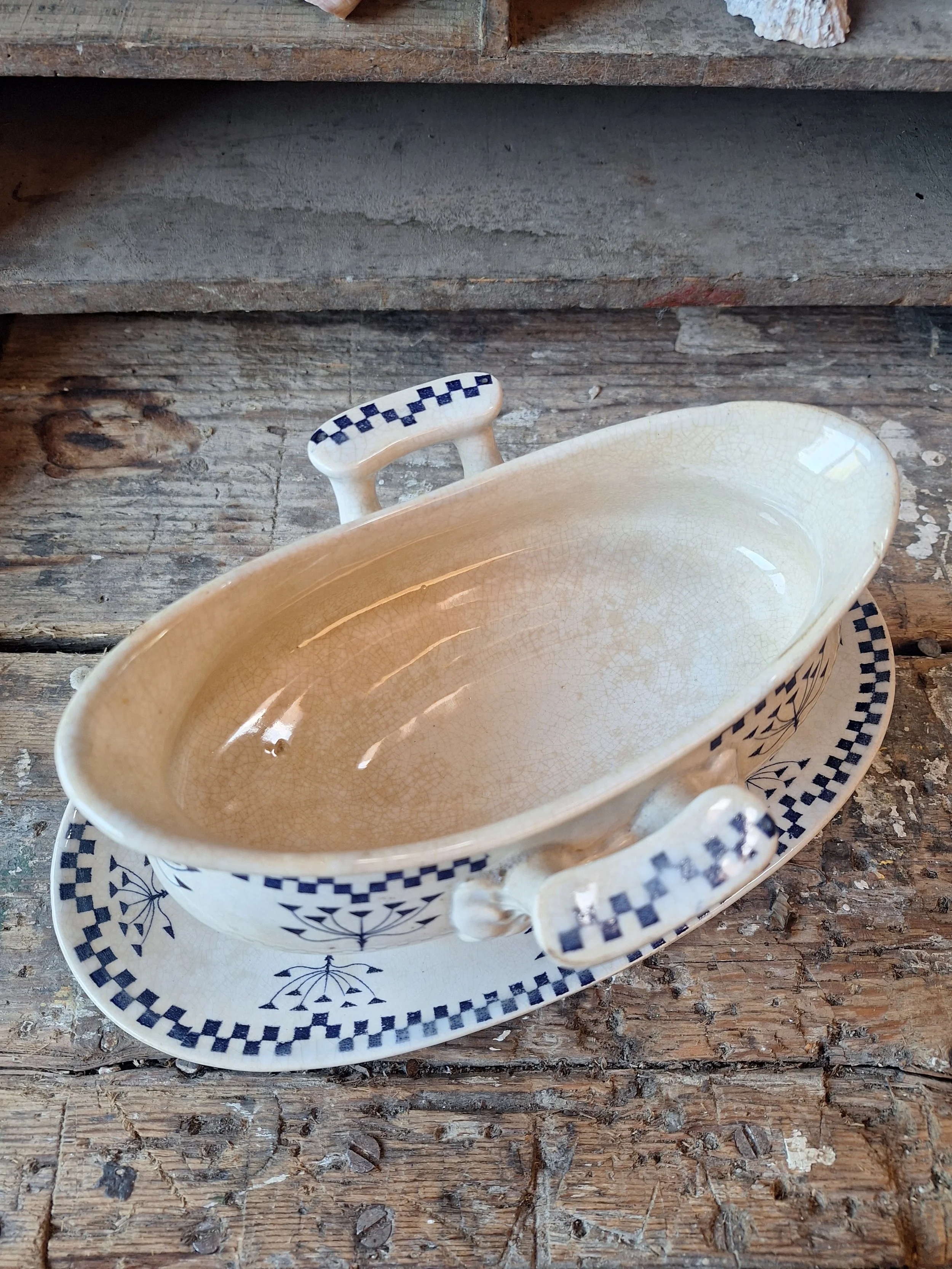 Vintage boat with discolouration and pattern. No chips. Length 14cm and height 10cm.