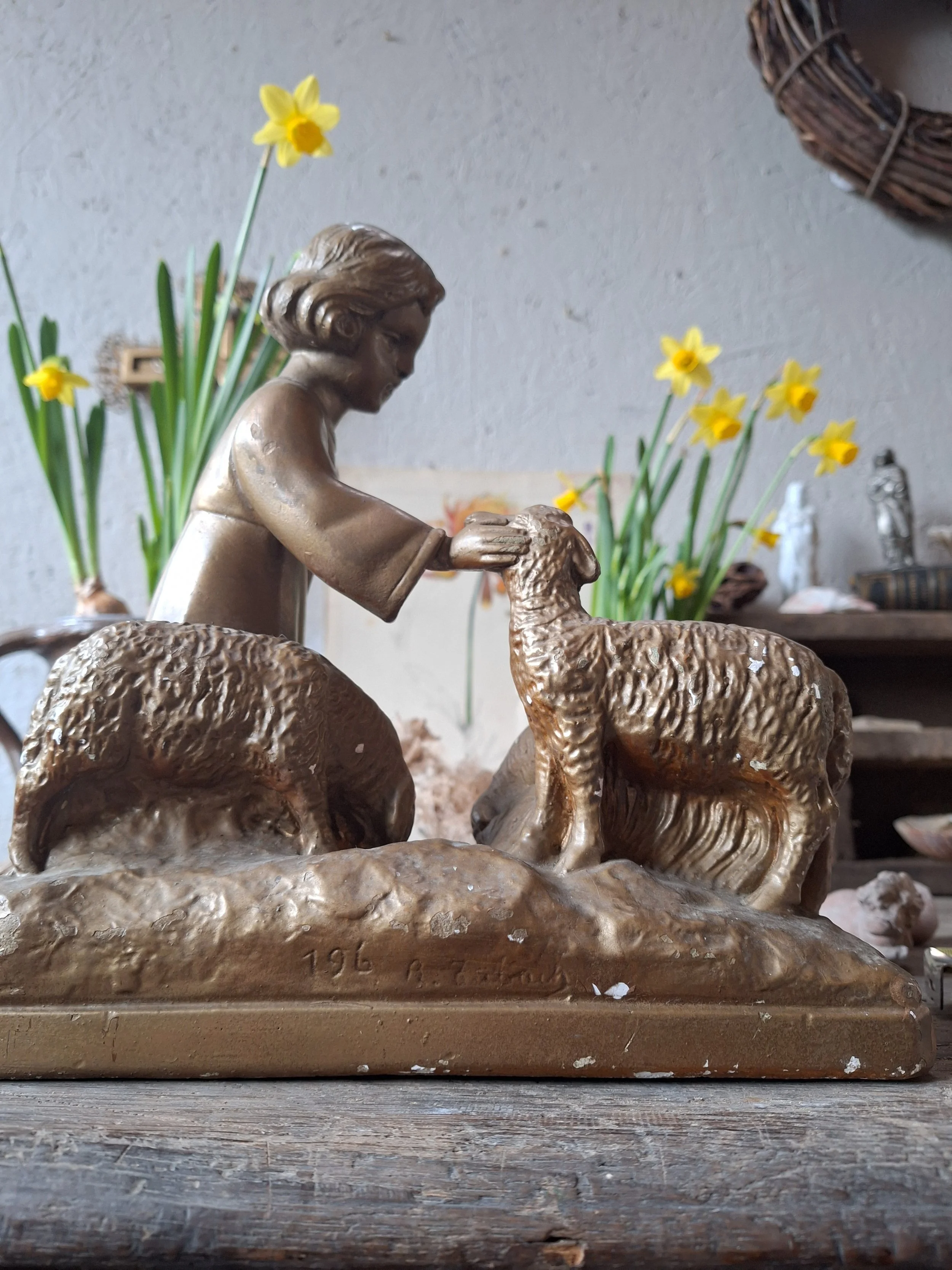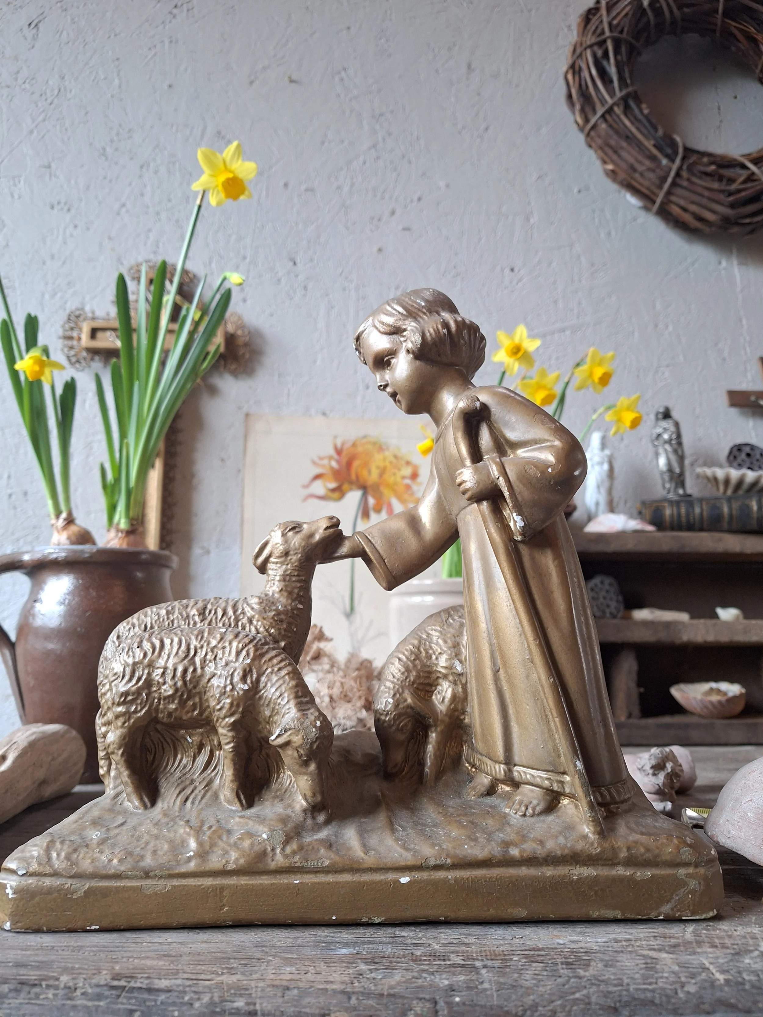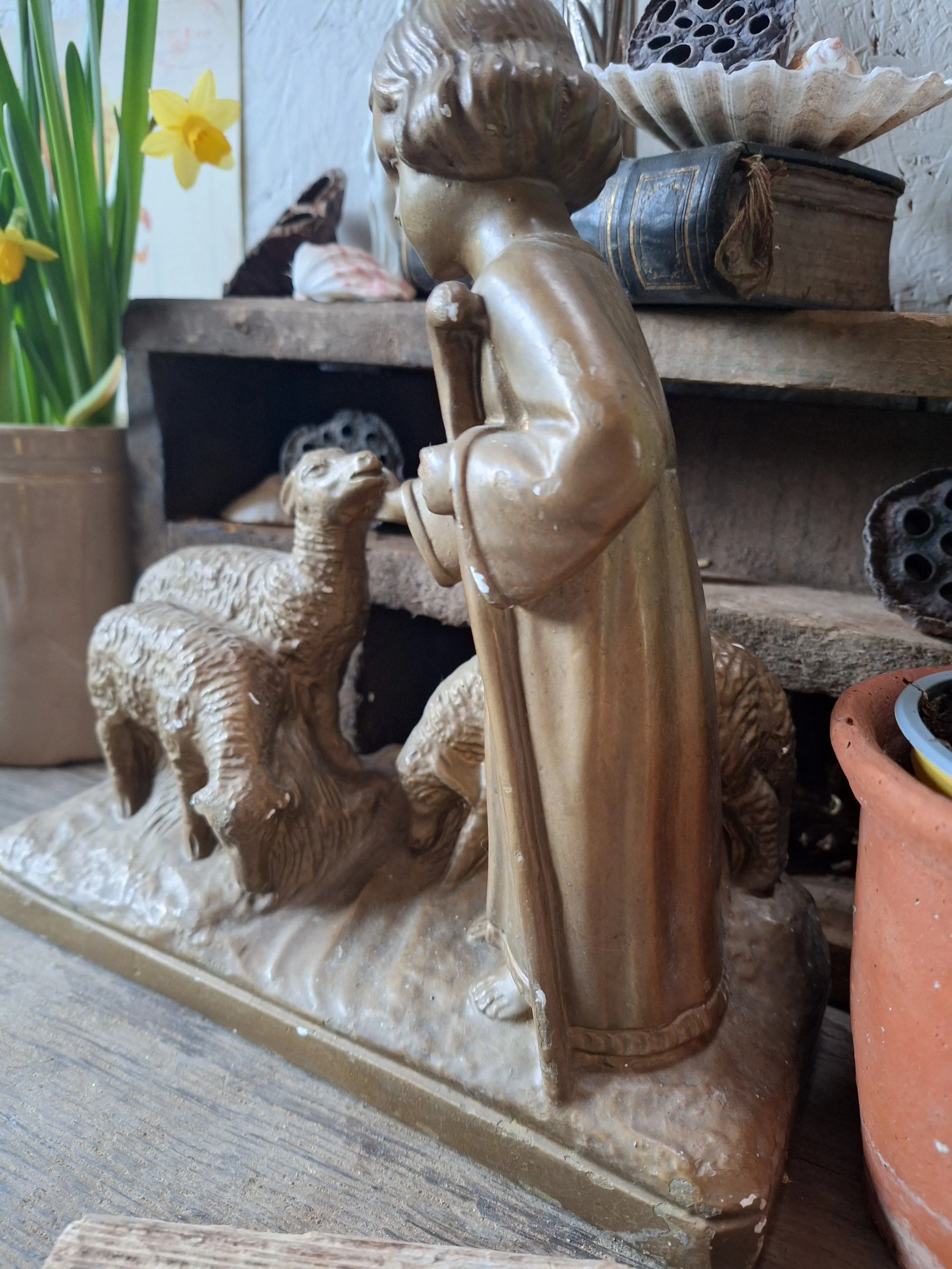 Sweet plaster statue of a young shepherd, very angelic looking and his flock of sheep. This item is vintage and will show signs of age. Please view all photos carefully. There are very small chips in the plaster and paint, one obvious one of the main sheep. Height 24cm width 23cm depth 9.5cm