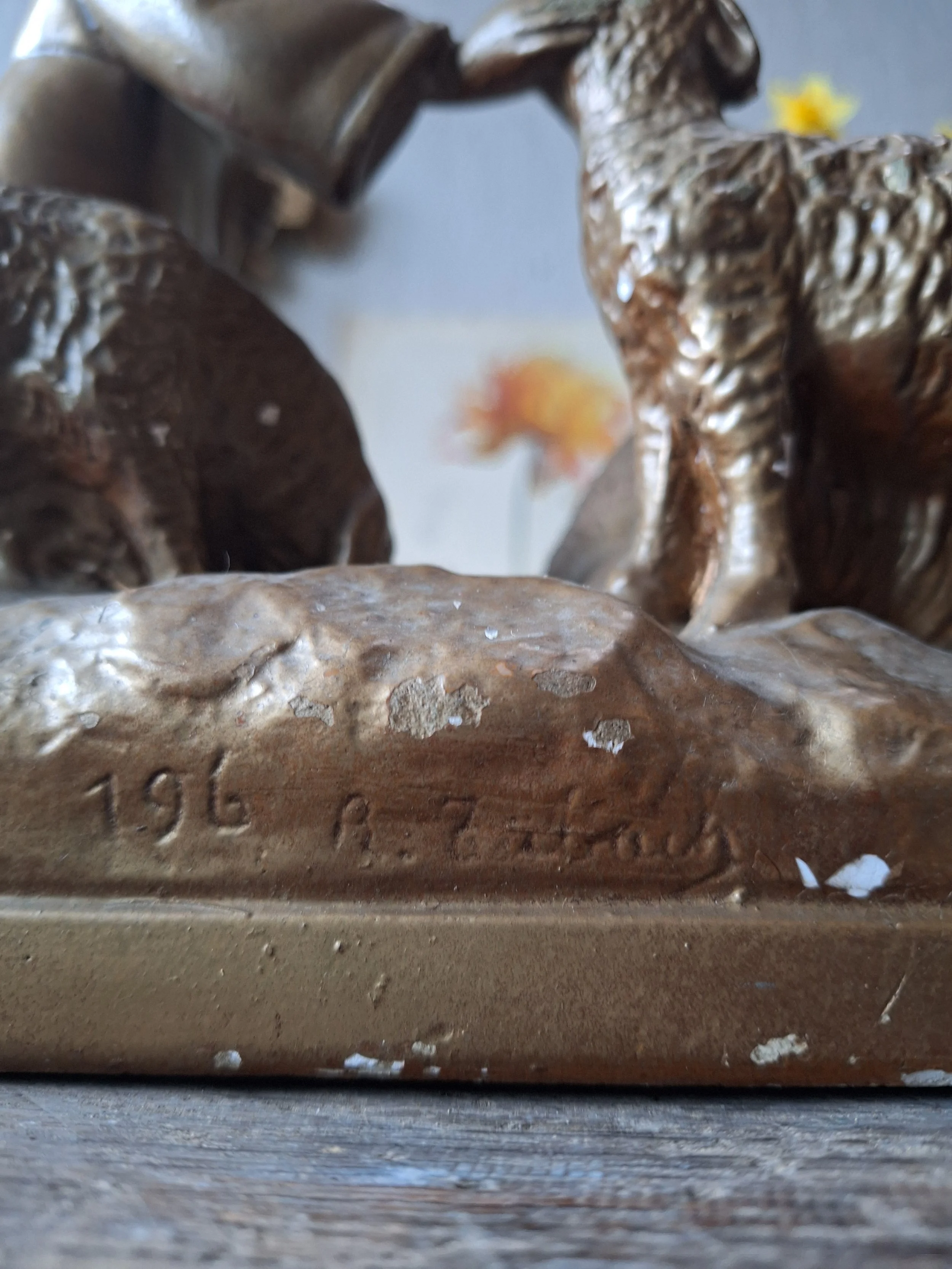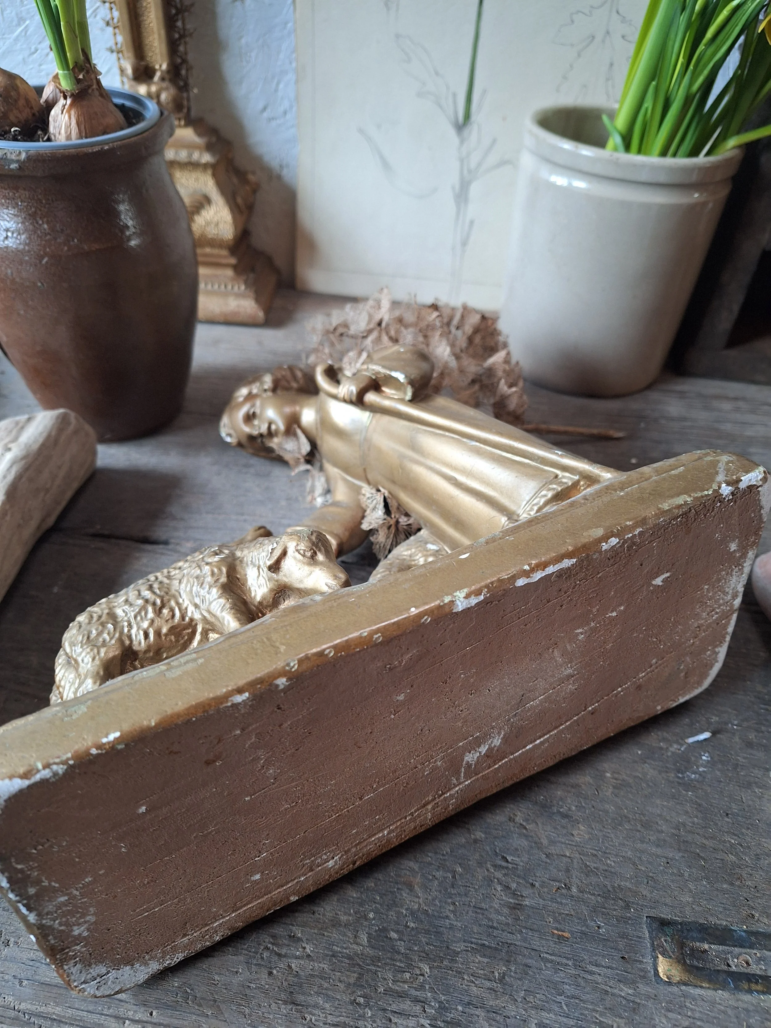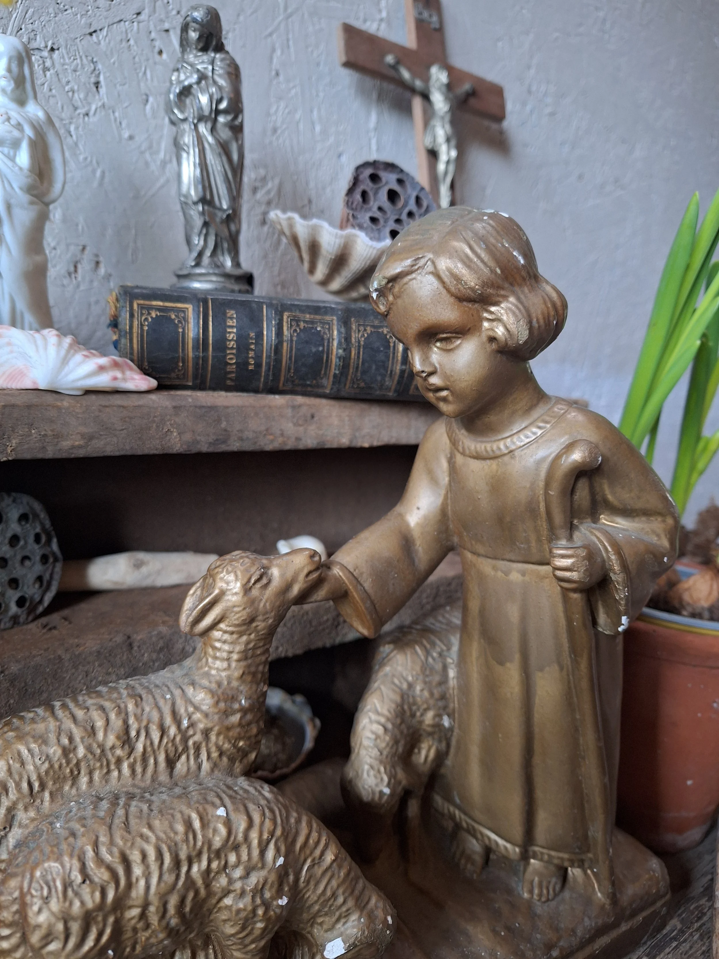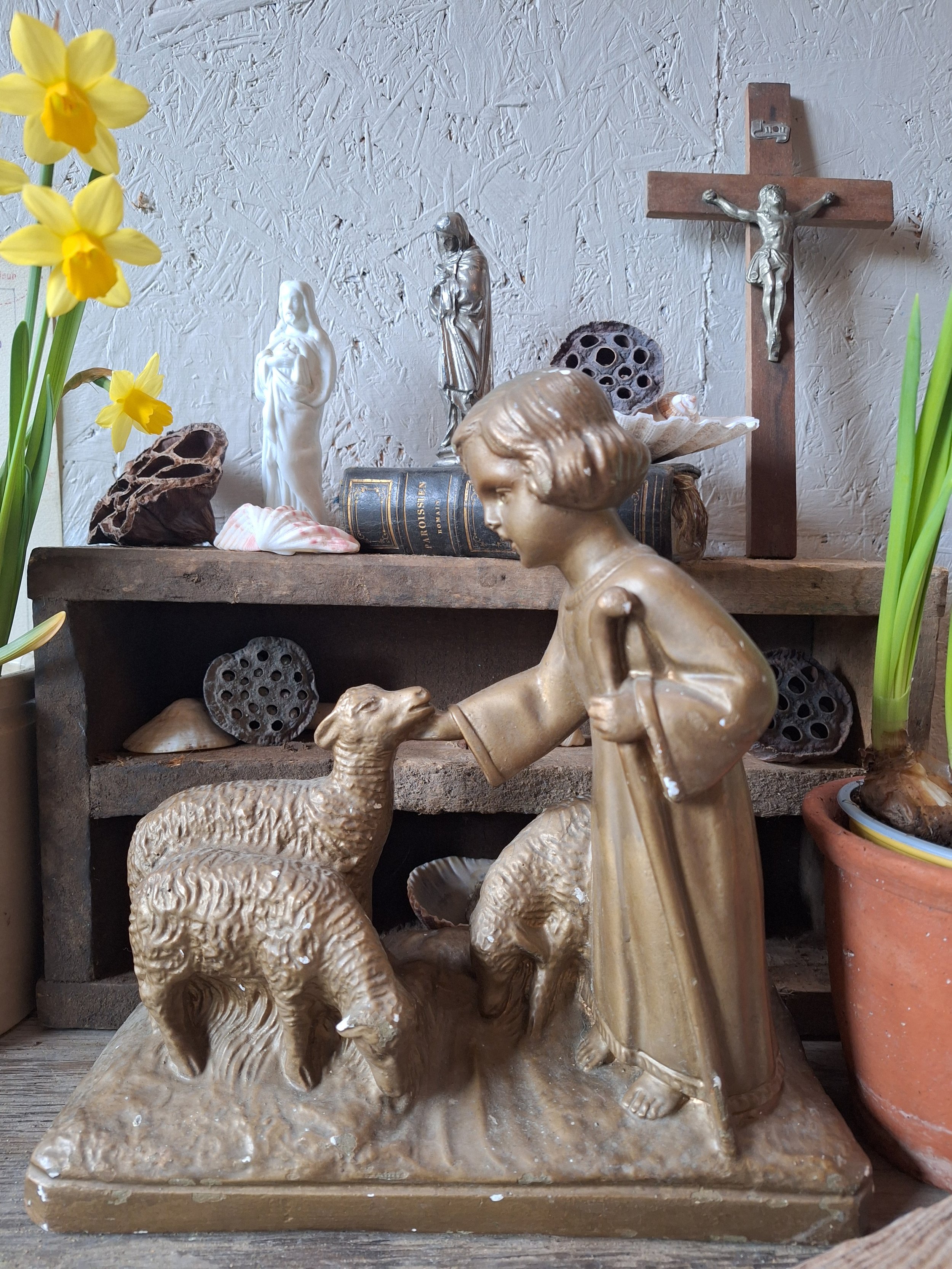 Sweet plaster statue of a young shepherd, very angelic looking and his flock of sheep. This item is vintage and will show signs of age. Please view all photos carefully. There are very small chips in the plaster and paint, one obvious one of the main sheep. Height 24cm width 23cm depth 9.5cm