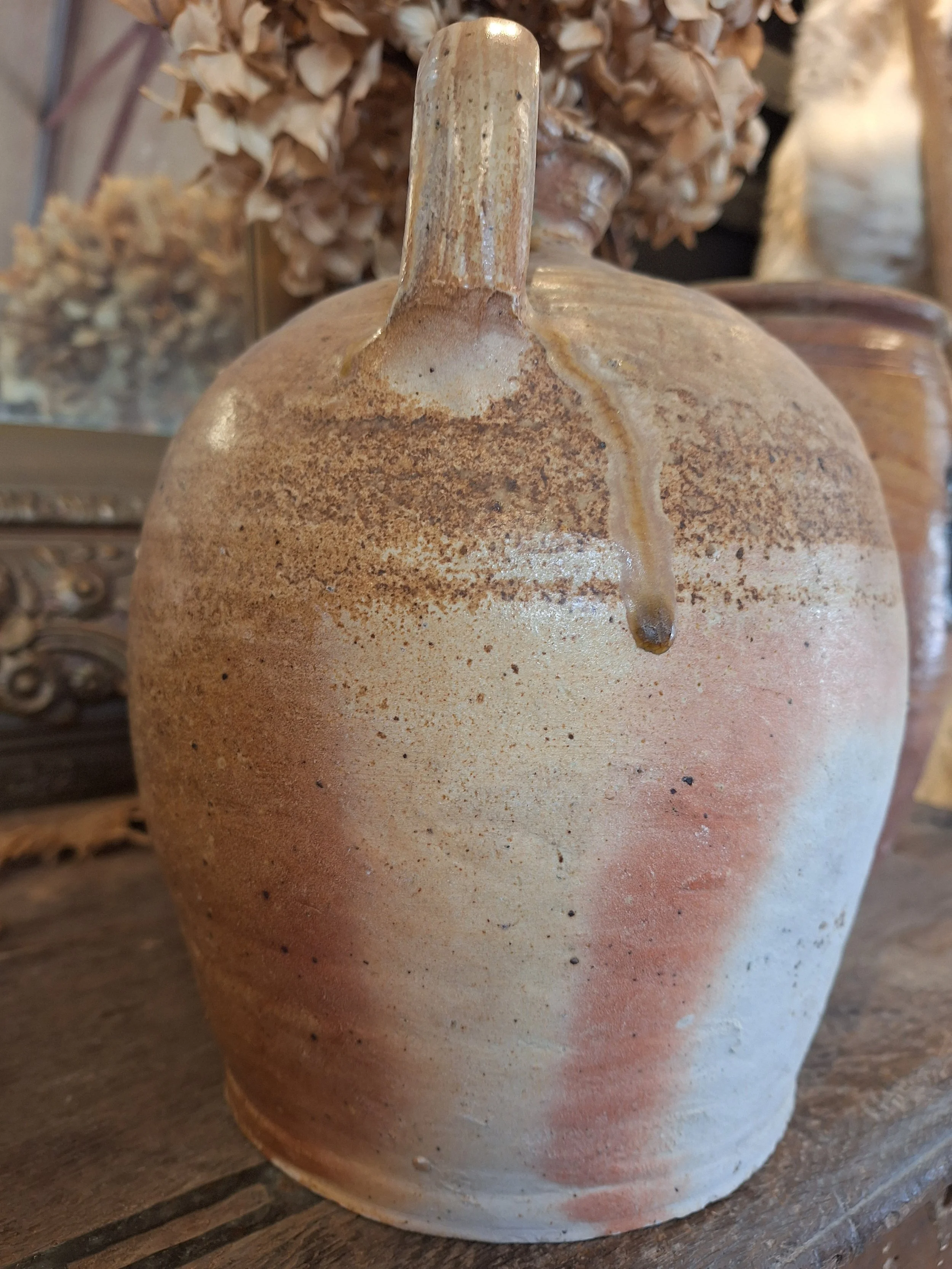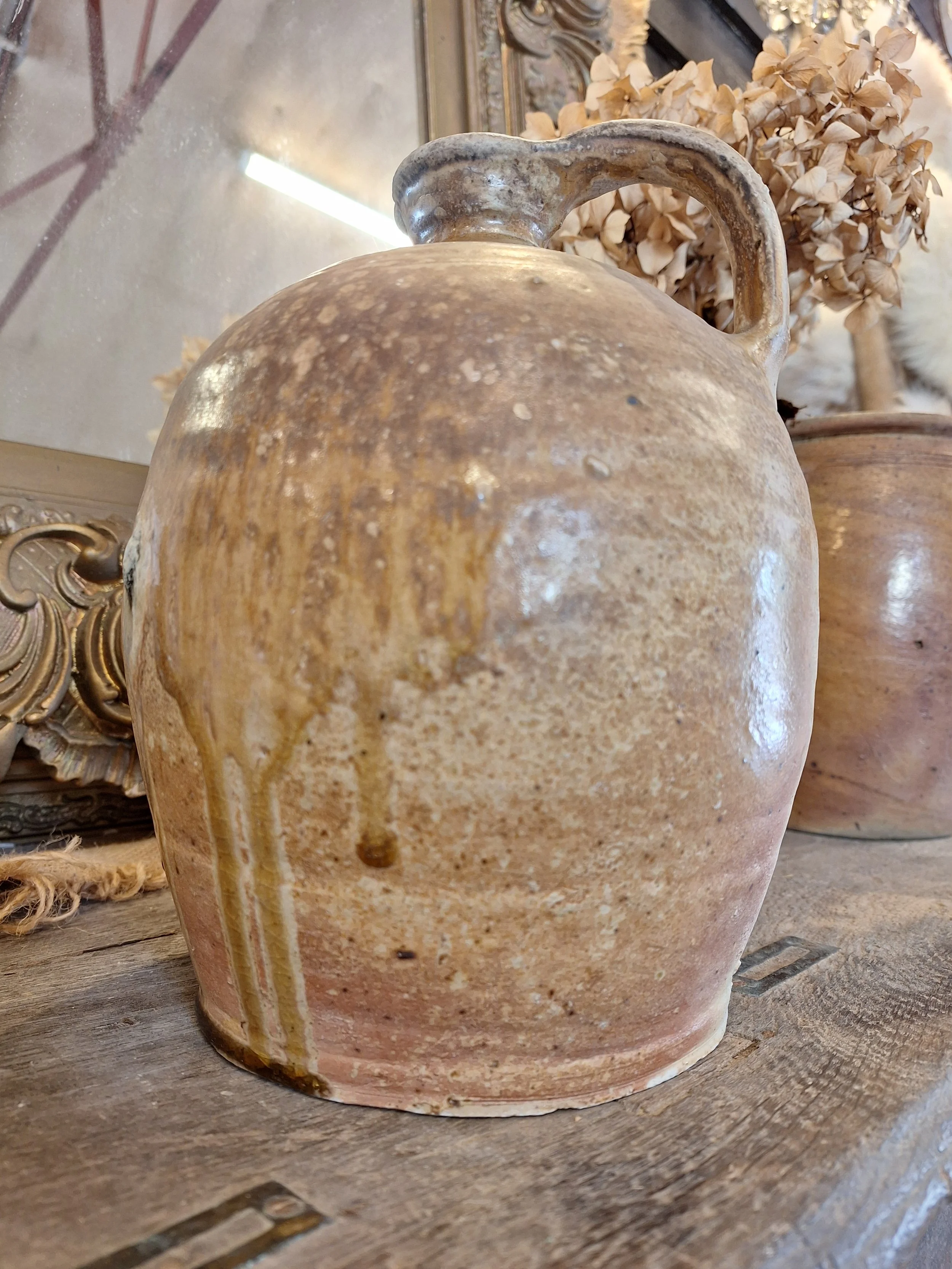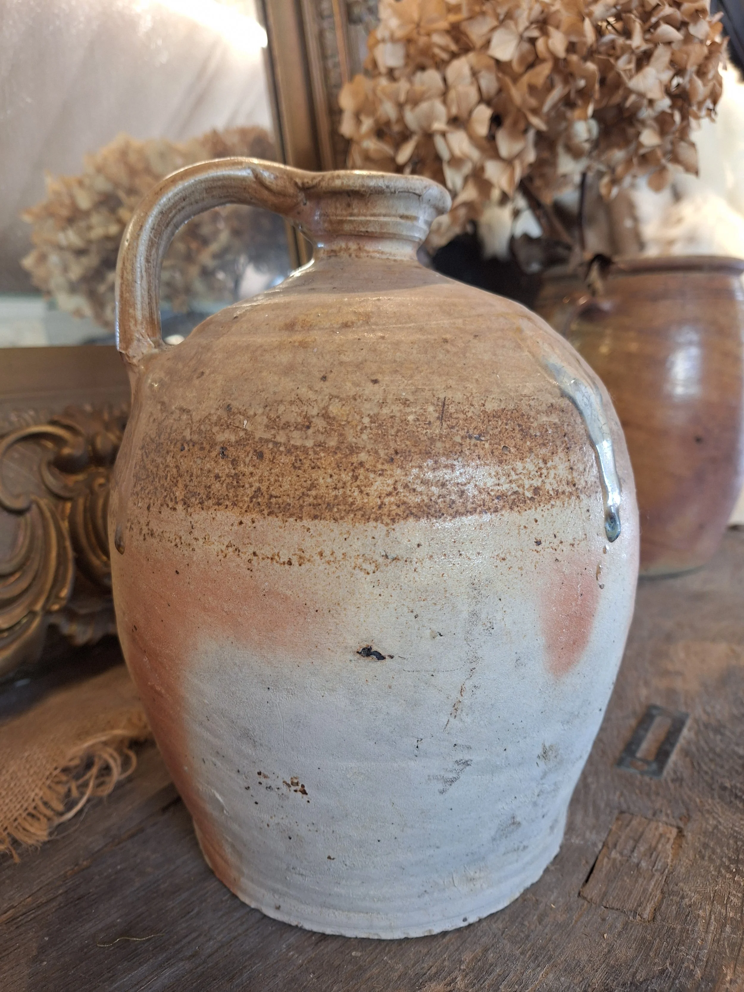 Lovely rustic stoneware jug. Some small nibbles, rough texture, these were handmade, they have dents, marks and drips of glaze when made, making each one individual and beautiful. Height 24cm base diameter 14.5cm.