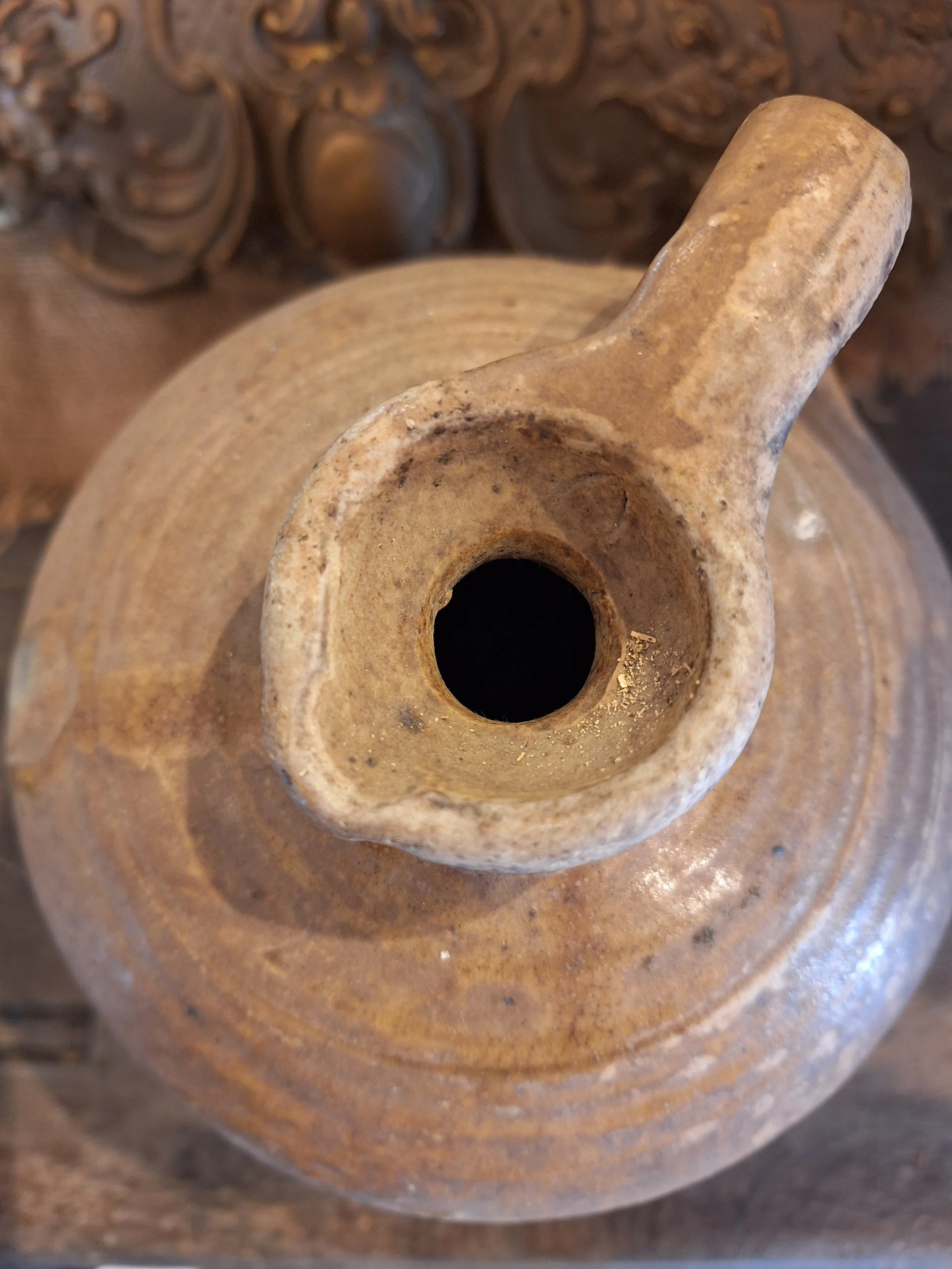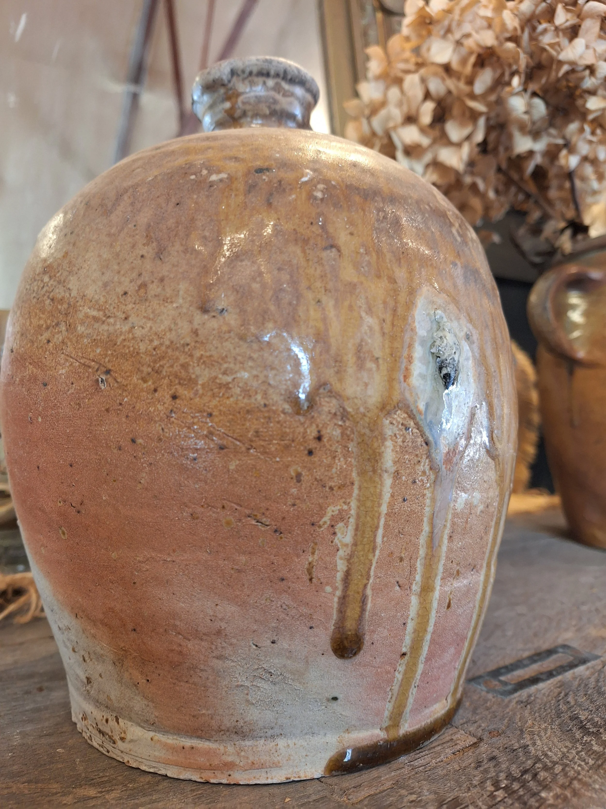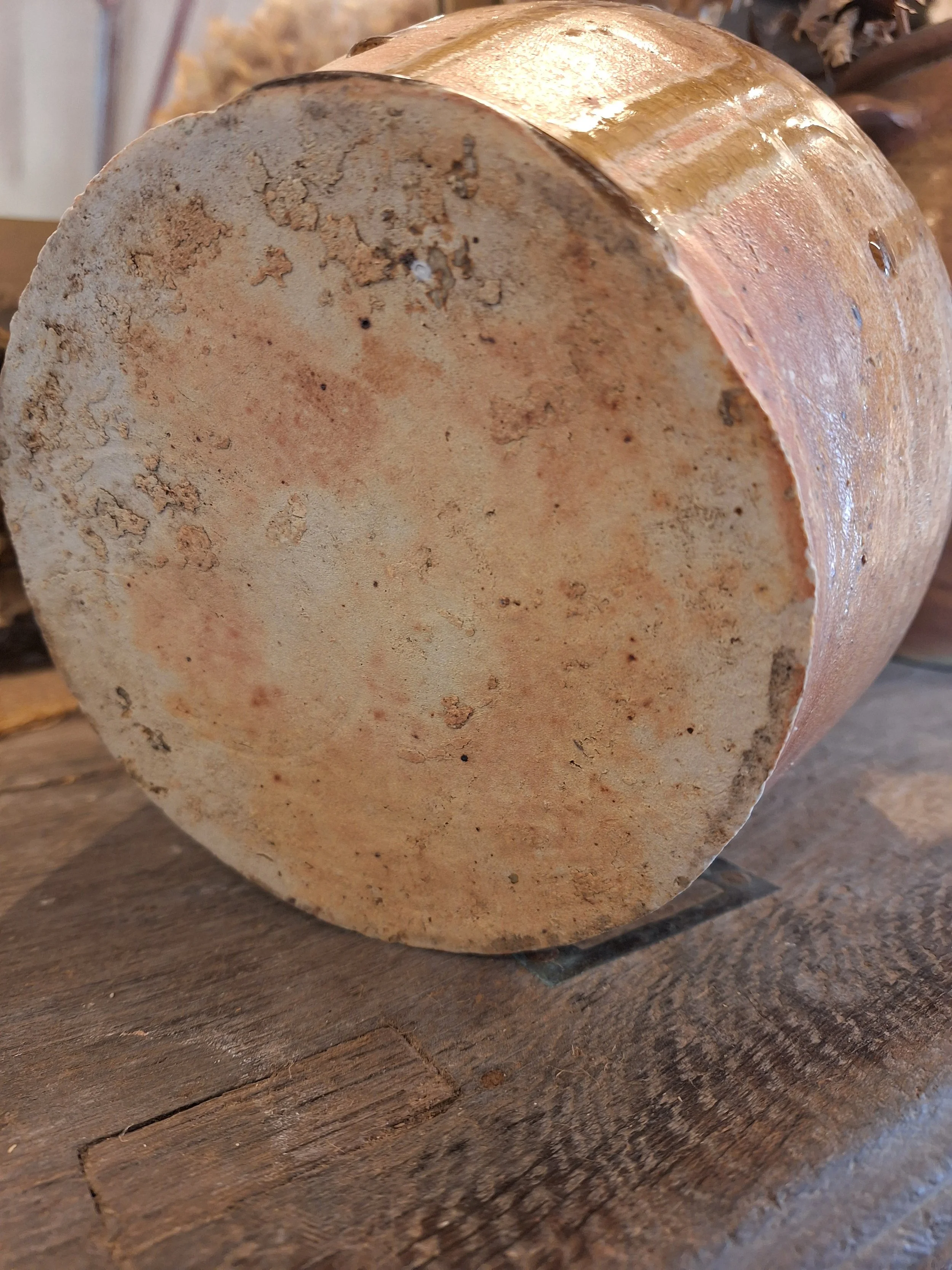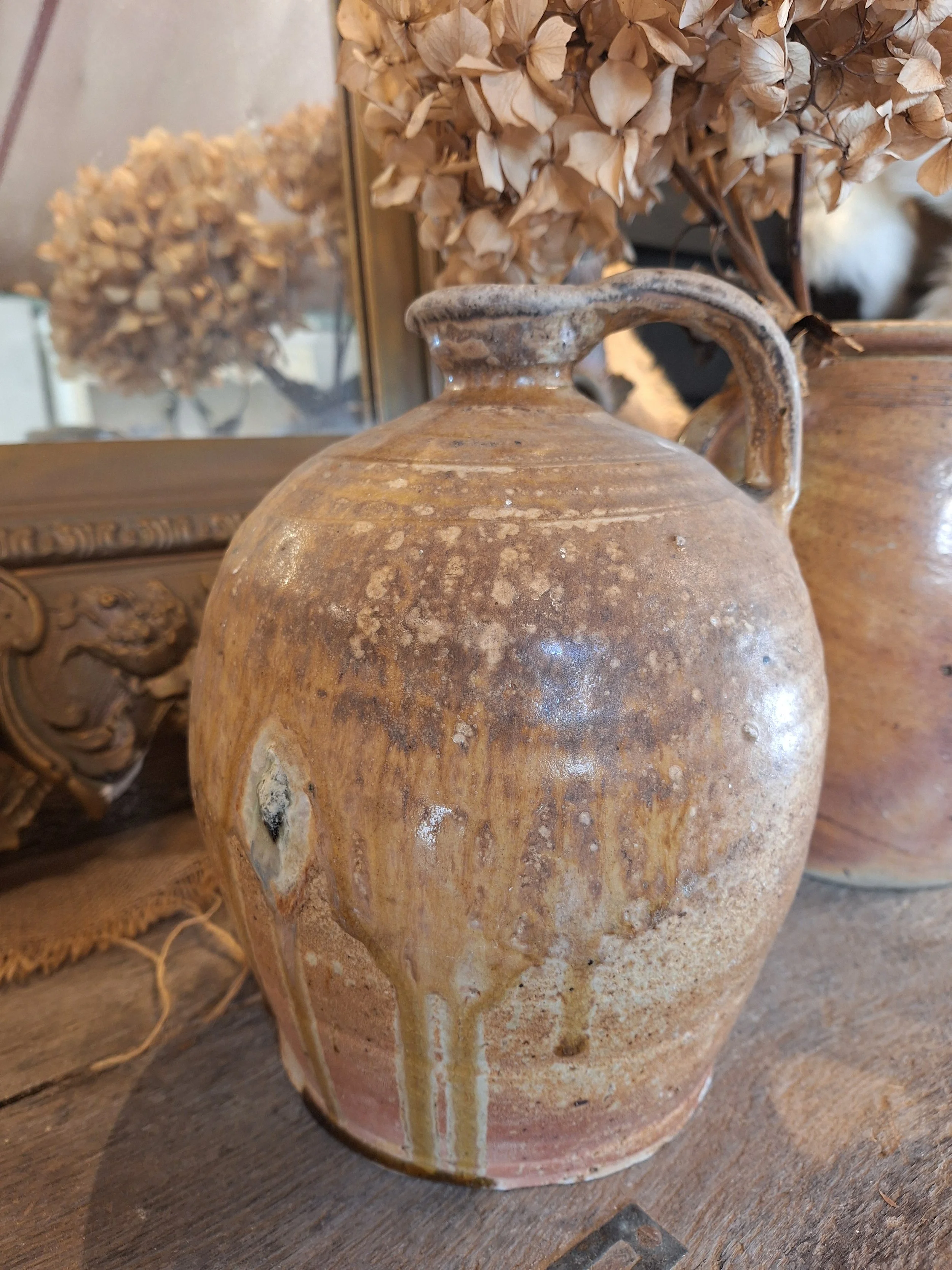 Lovely rustic stoneware jug. Some small nibbles, rough texture, these were handmade, they have dents, marks and drips of glaze when made, making each one individual and beautiful. Height 24cm base diameter 14.5cm.