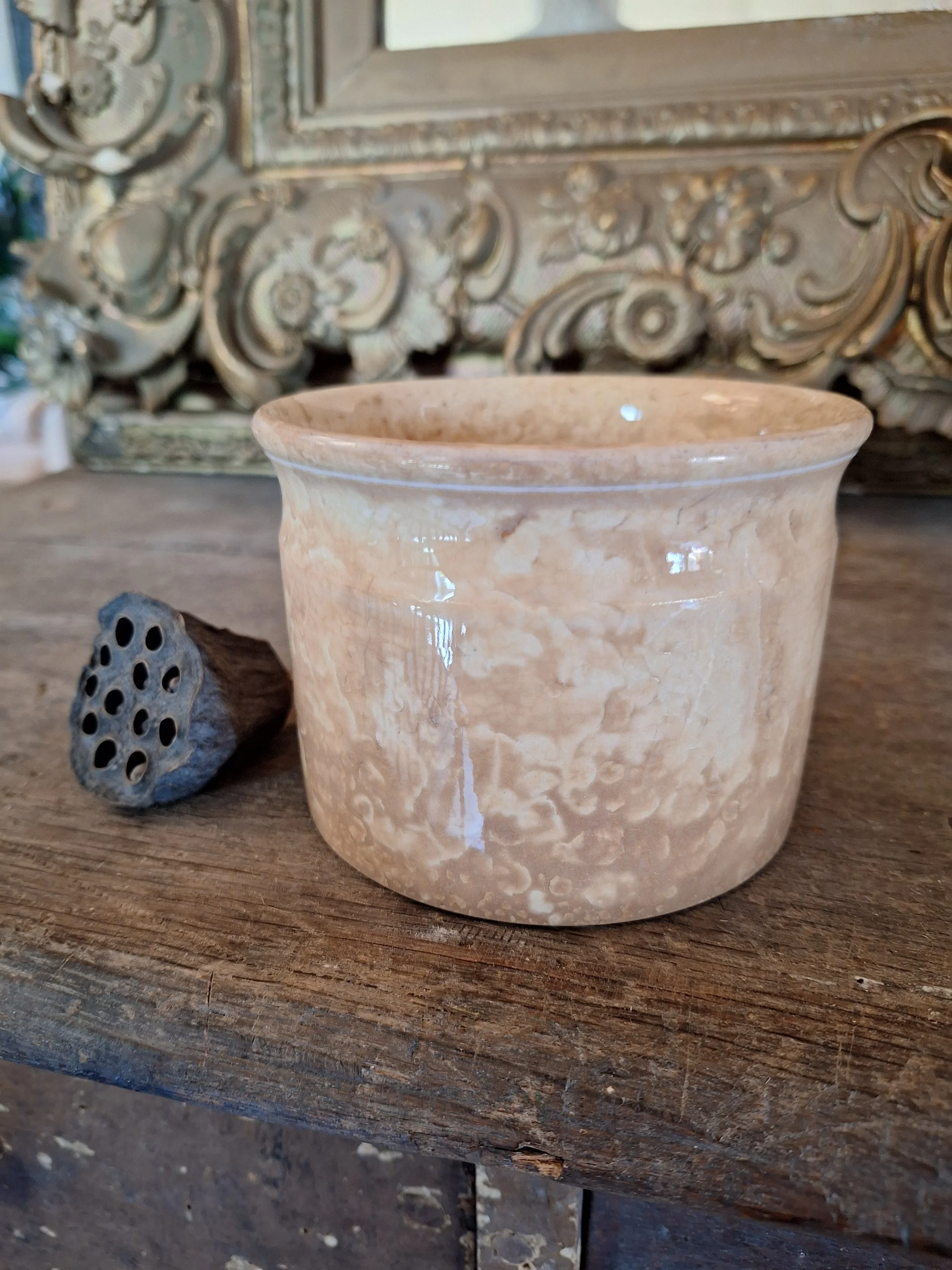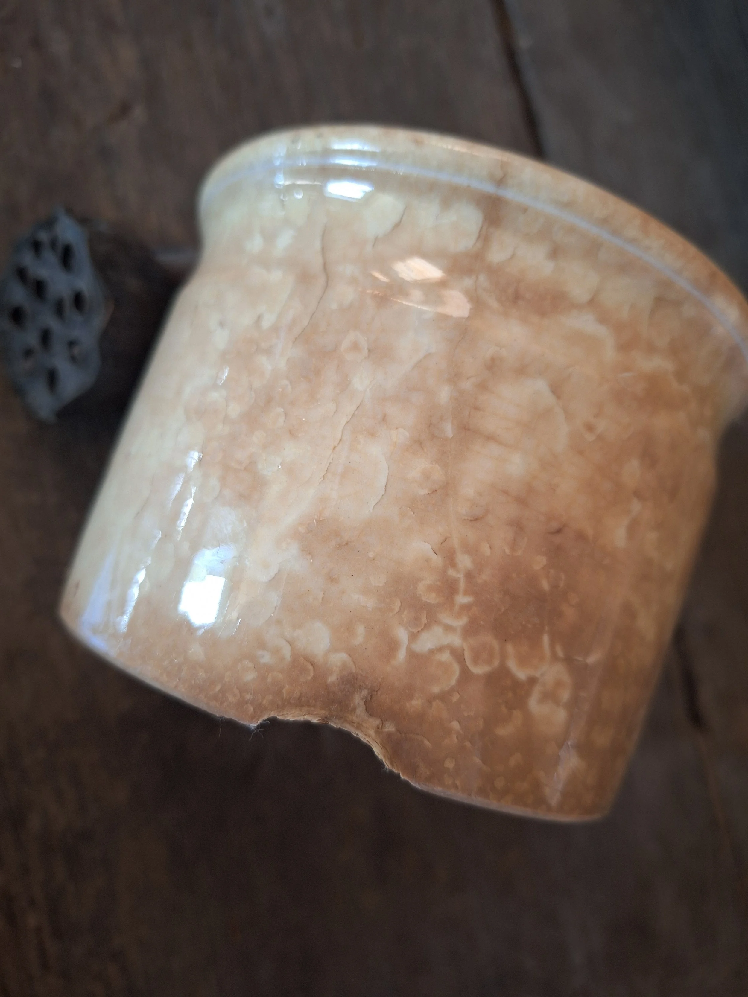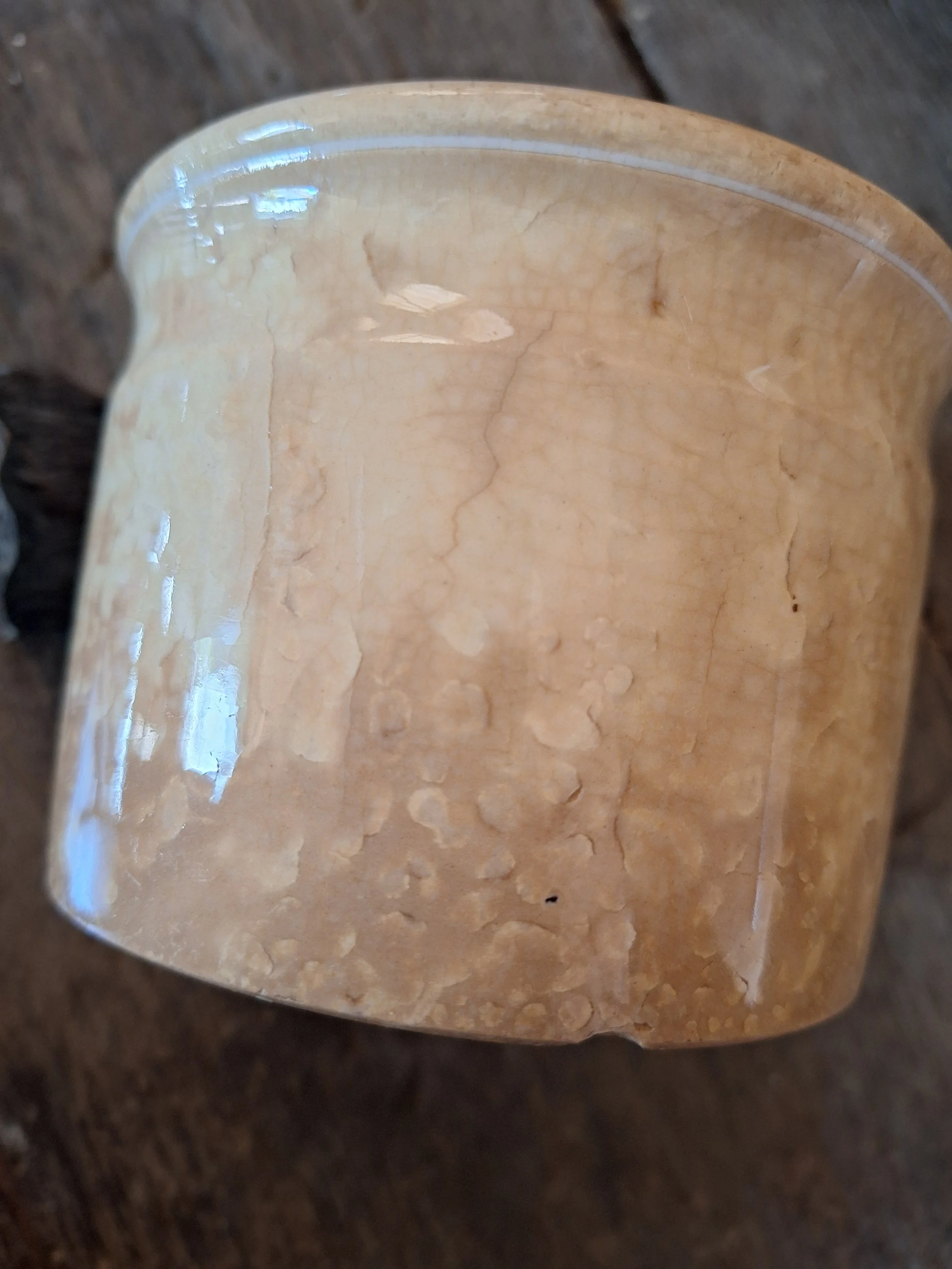 Lovely little pot, discolouration all over. Two old chips to base. Height 7.8cm and diameter 10.8cm.