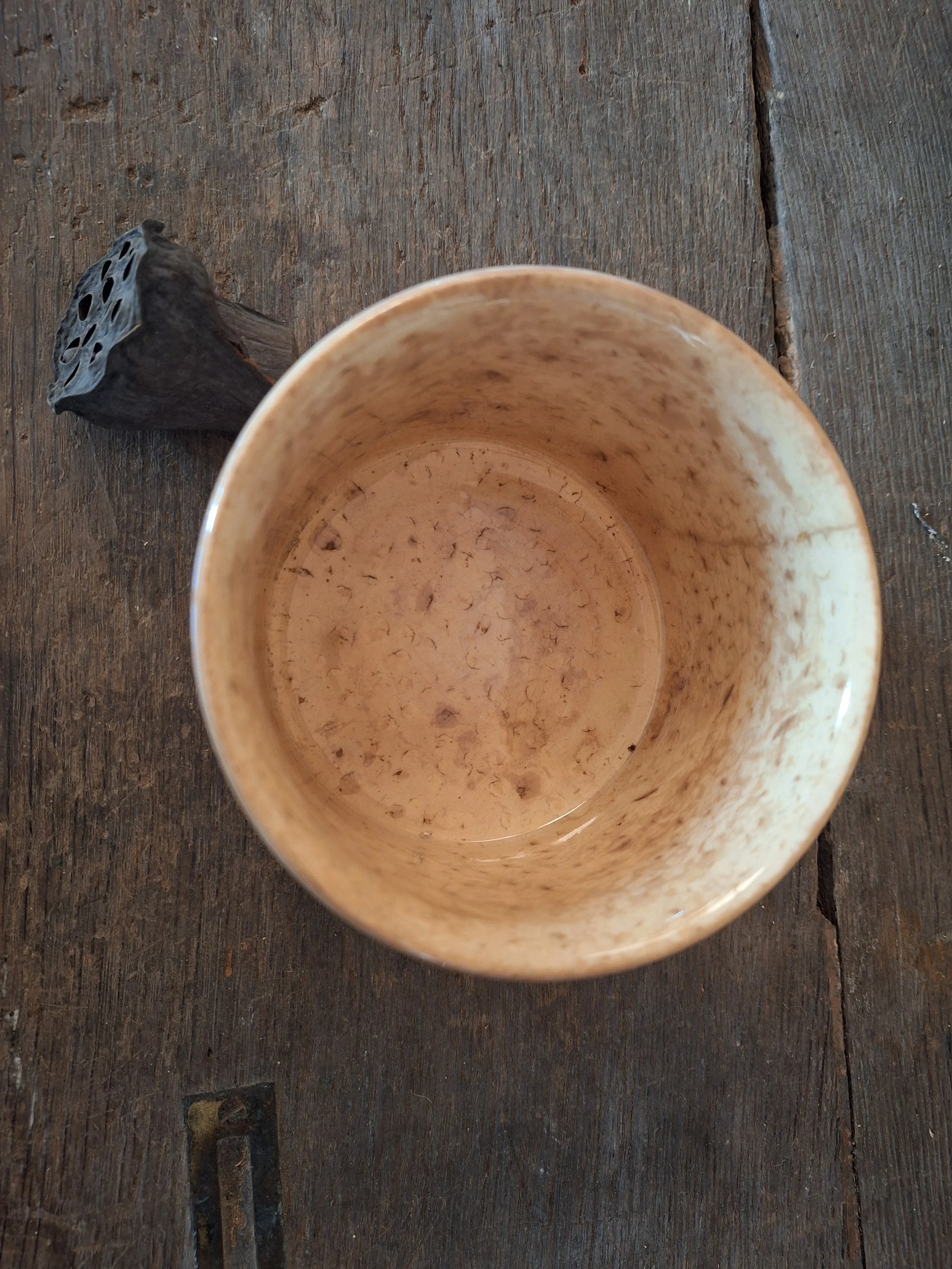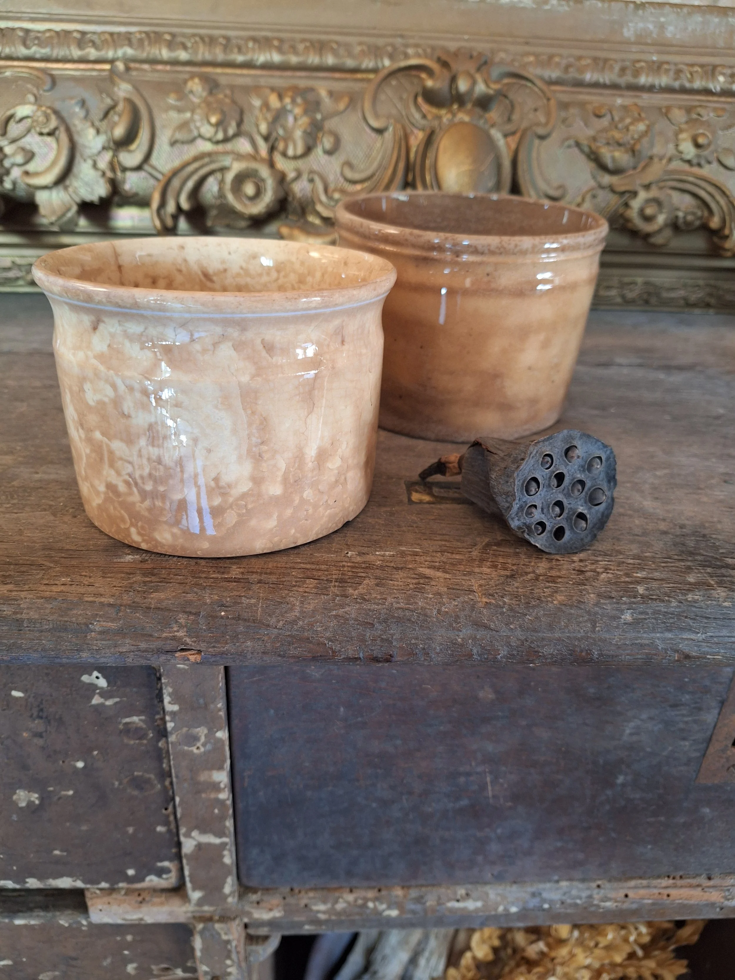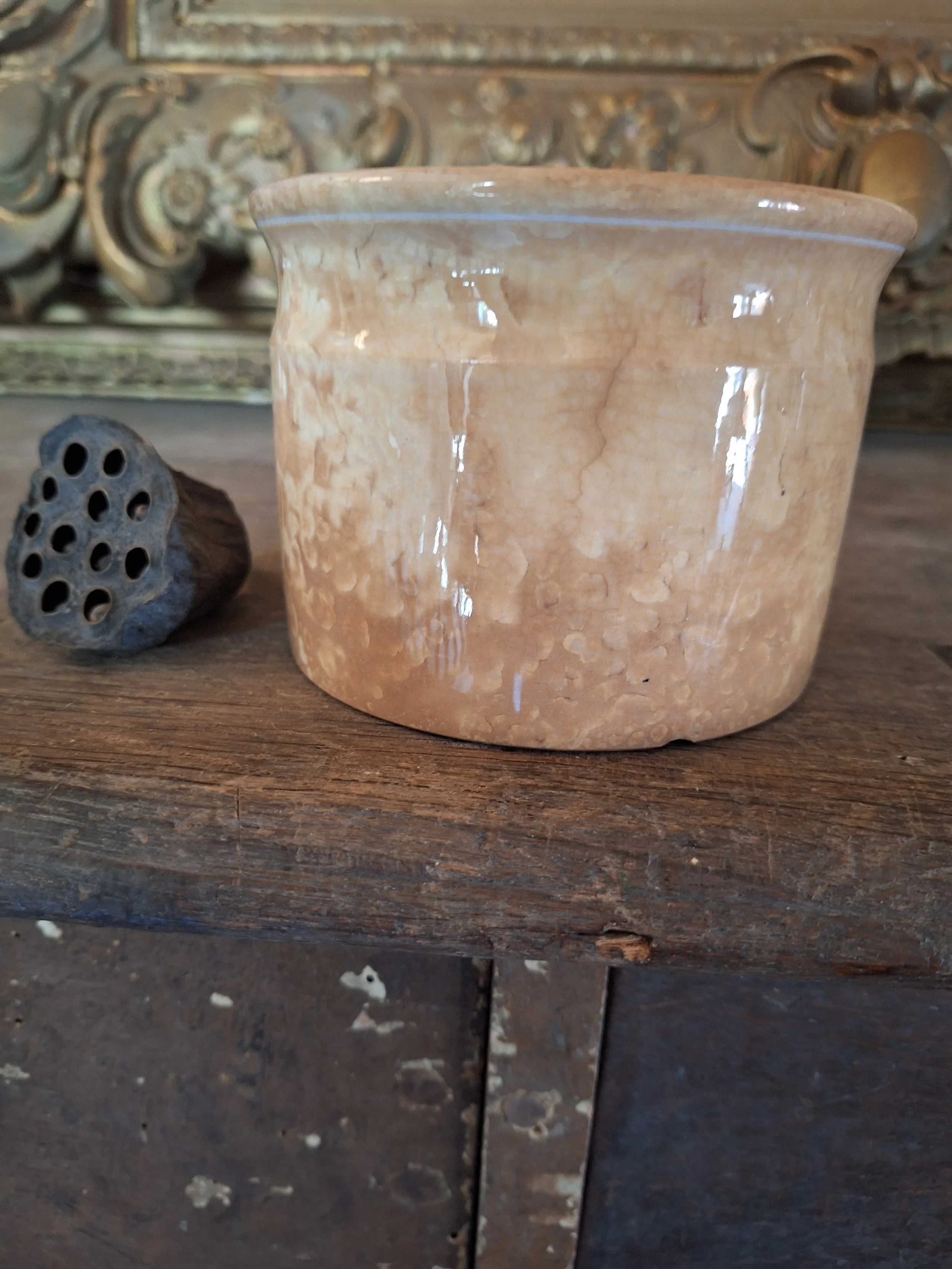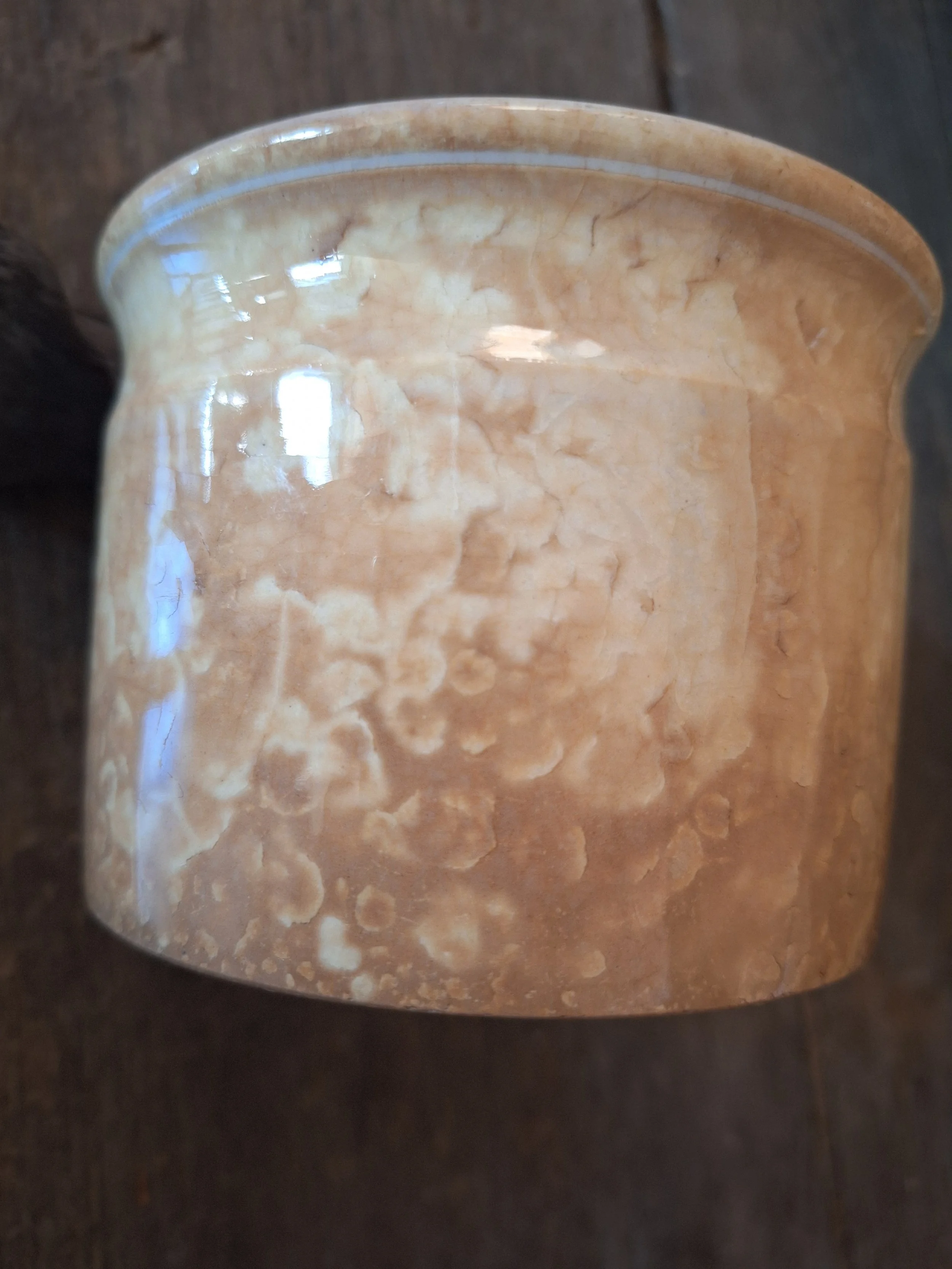 Lovely little pot, discolouration all over. Two old chips to base. Height 7.8cm and diameter 10.8cm.